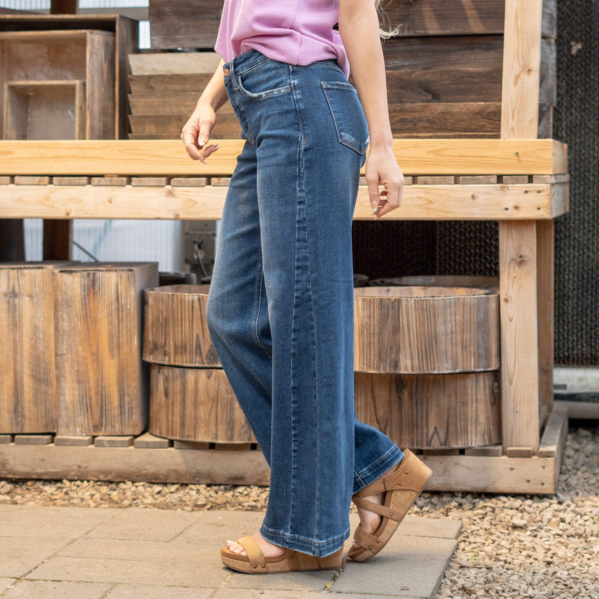 VERVET Outdone Tummy Control High Rise Wide Leg Regular & Plus Sizes Jeans Dark Blue Wash