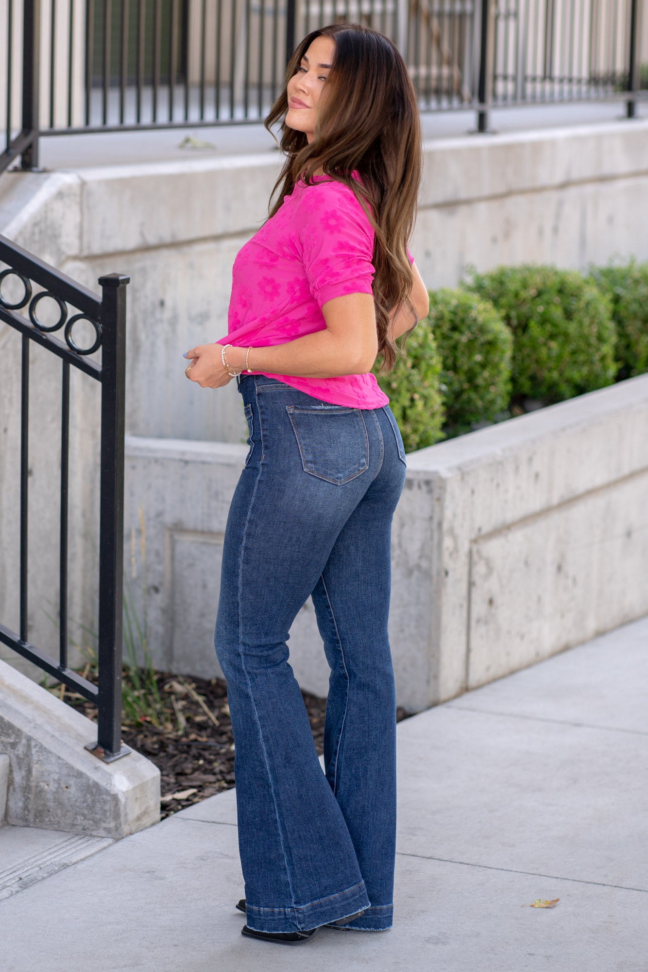 Embrace retro flair with our High-Rise Flare Jeans, featuring a 10 1/2” front rise and a dramatic 33” inseam. The dark wash and soft cotton blend offer a sleek, elongating look, while the touch of spandex ensures a comfortable fit that moves with you. Perfect for adding a vintage twist to your modern wardrobe.