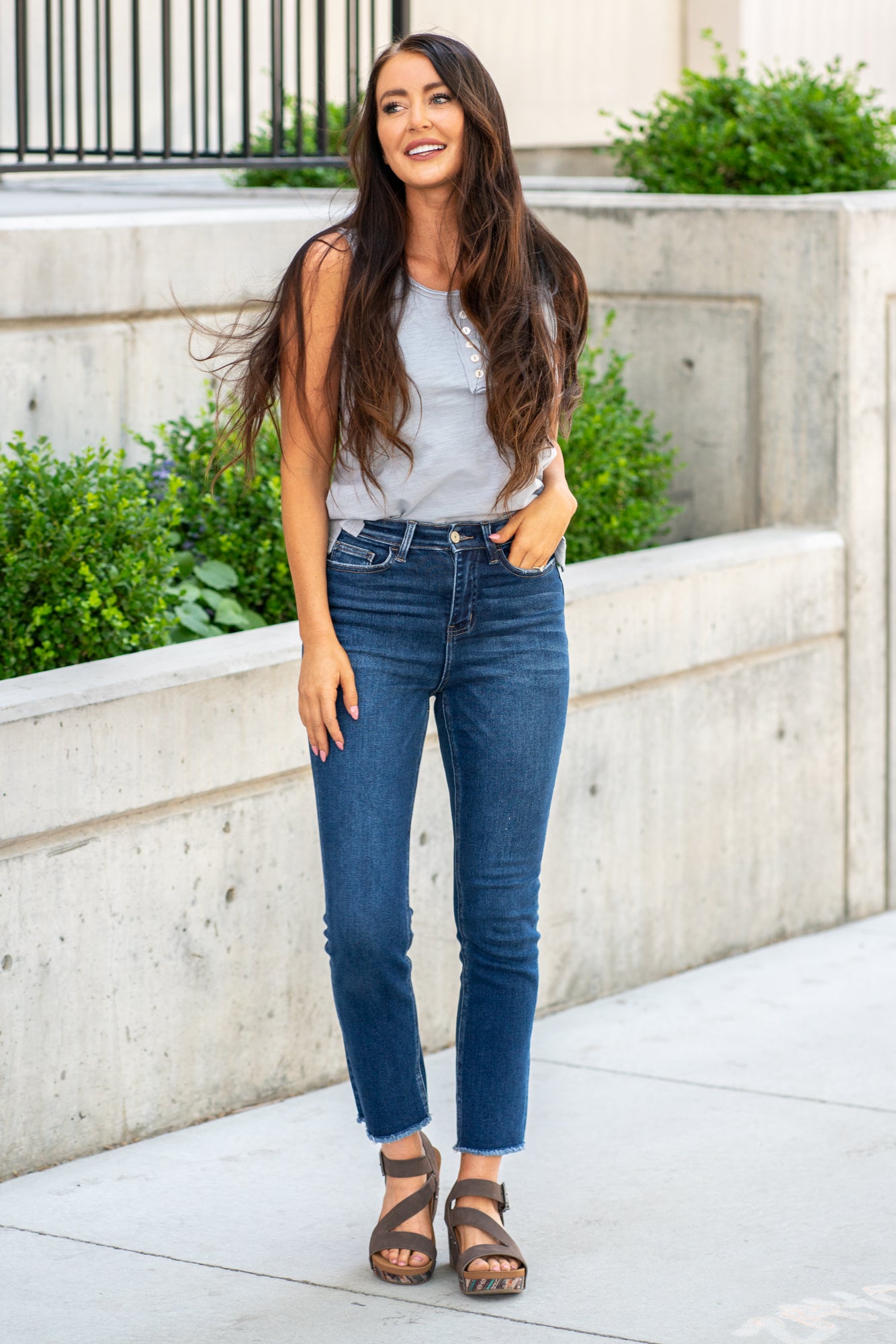 These high-waisted crop straight-leg jeans have a soft stretch material that will feel so comfortable. Cropped legs and slightly distressed detail with the classic 5-pocket design.