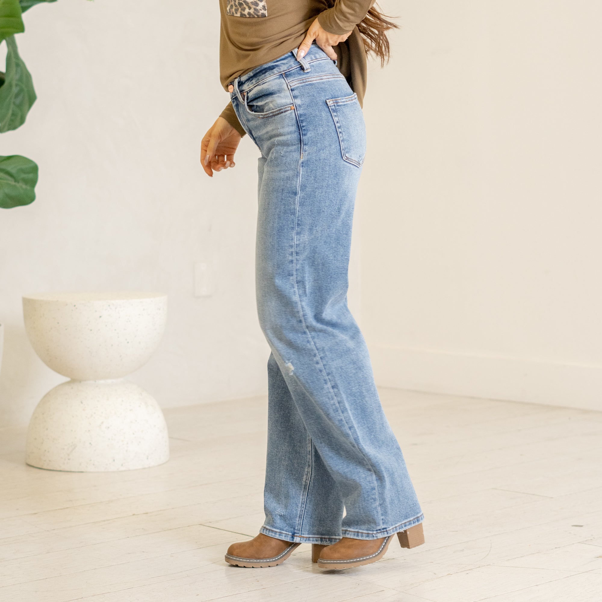VERVET Outdone Tummy Control High Rise Wide Leg Regular & Plus Sizes Jeans Dark Blue Wash