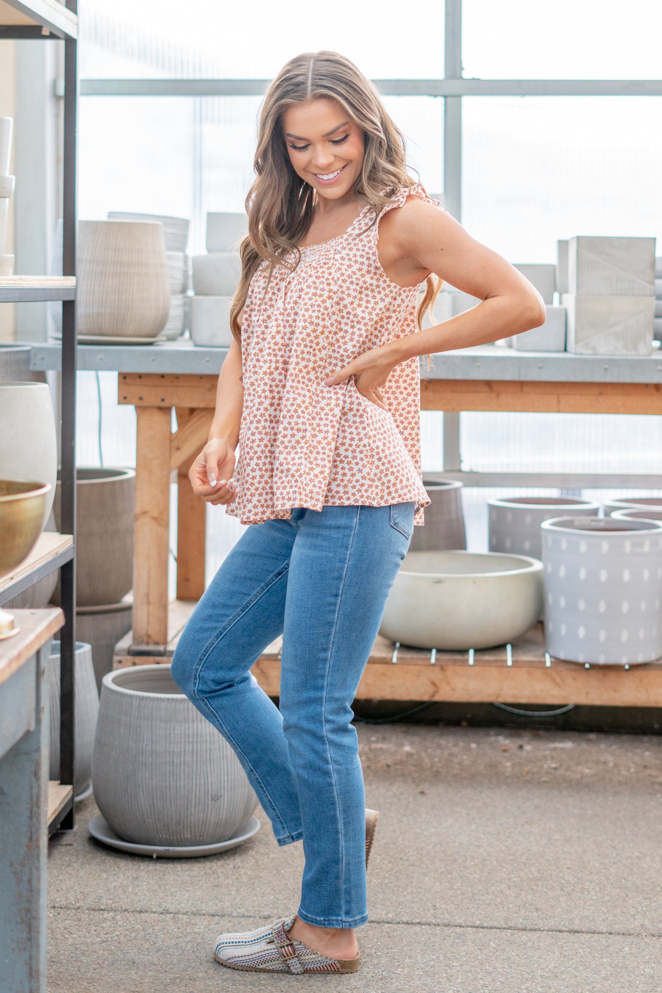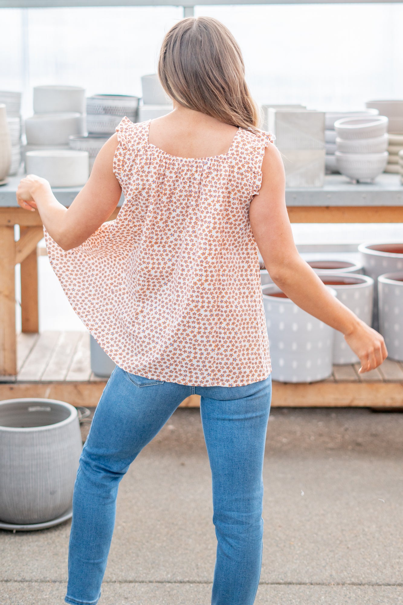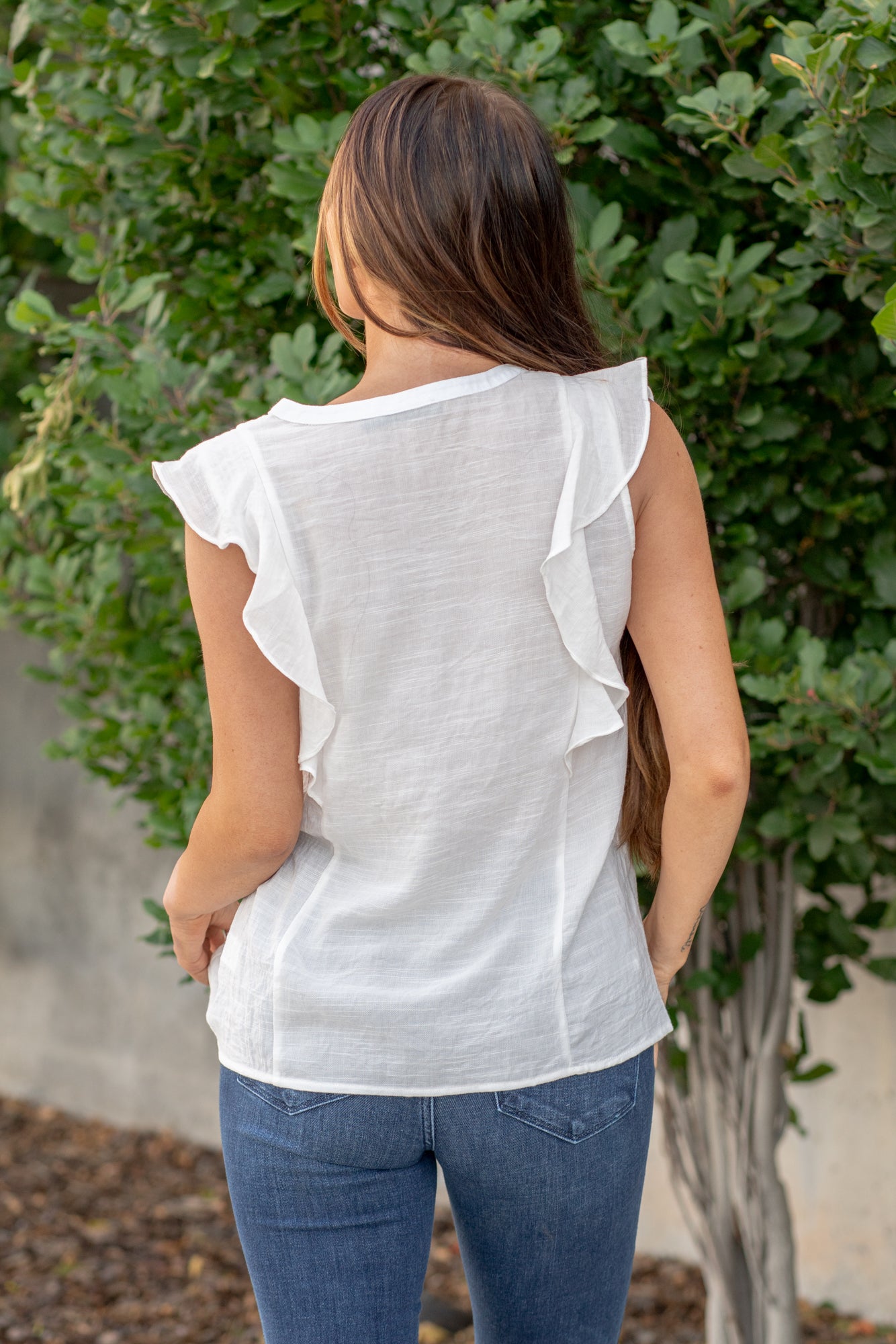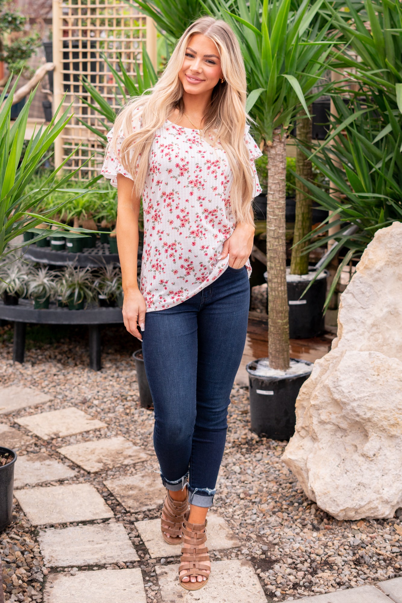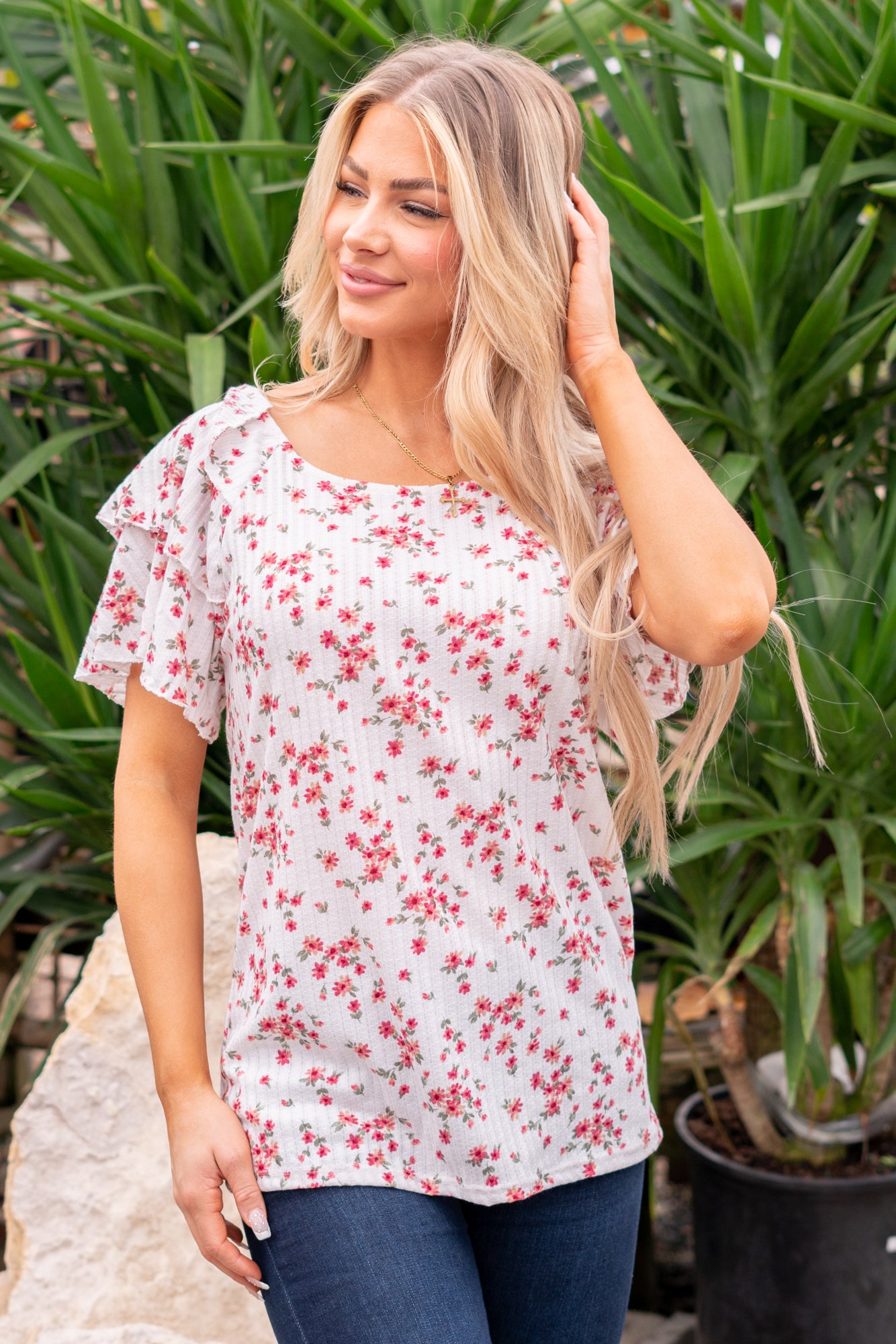 Floral Printed Pointelle with Ruffled Sleeve Top - Ivory