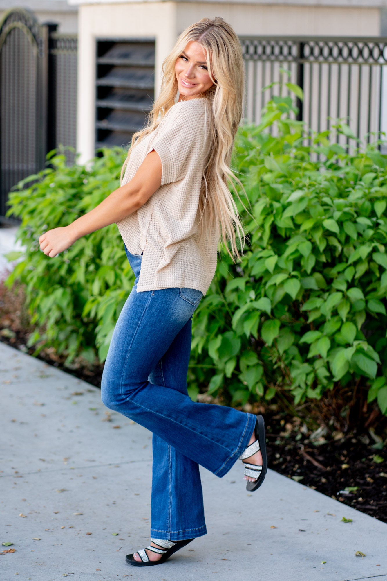 Our Annie Mid Rise Jeans are the perfect blend of style and versatility. Designed to sit at the natural waistline, they taper gently down the leg before flaring out at the calf, offering a flattering silhouette. Crafted in a beautiful medium wash for a timeless appeal, these jeans provide just the right amount of stretch for all-day comfort. Featuring a classic five-pocket design, a single-button front, and a zip-fly closure, they are a must-have addition to your wardrobe.