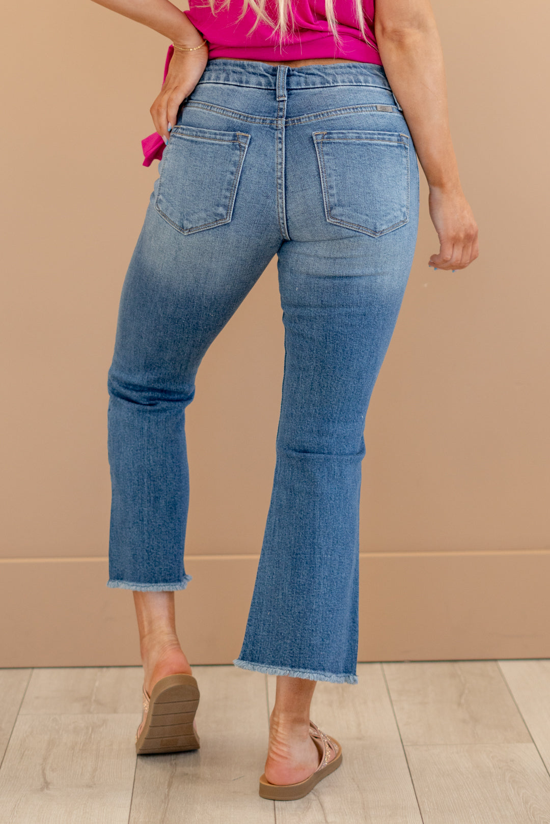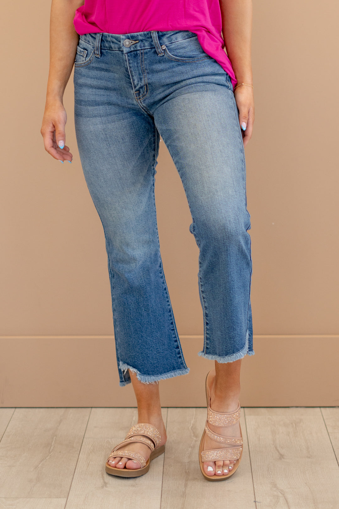 These mid-rise crop flare jeans offer style and comfort. With comfort stretch fabric, hidden waistband, and a cropped length, they provide a flattering fit. The five-pocket style, zipper fly, and curved fray hem add fashionable details. Versatile and trendy, these jeans are a must-have.