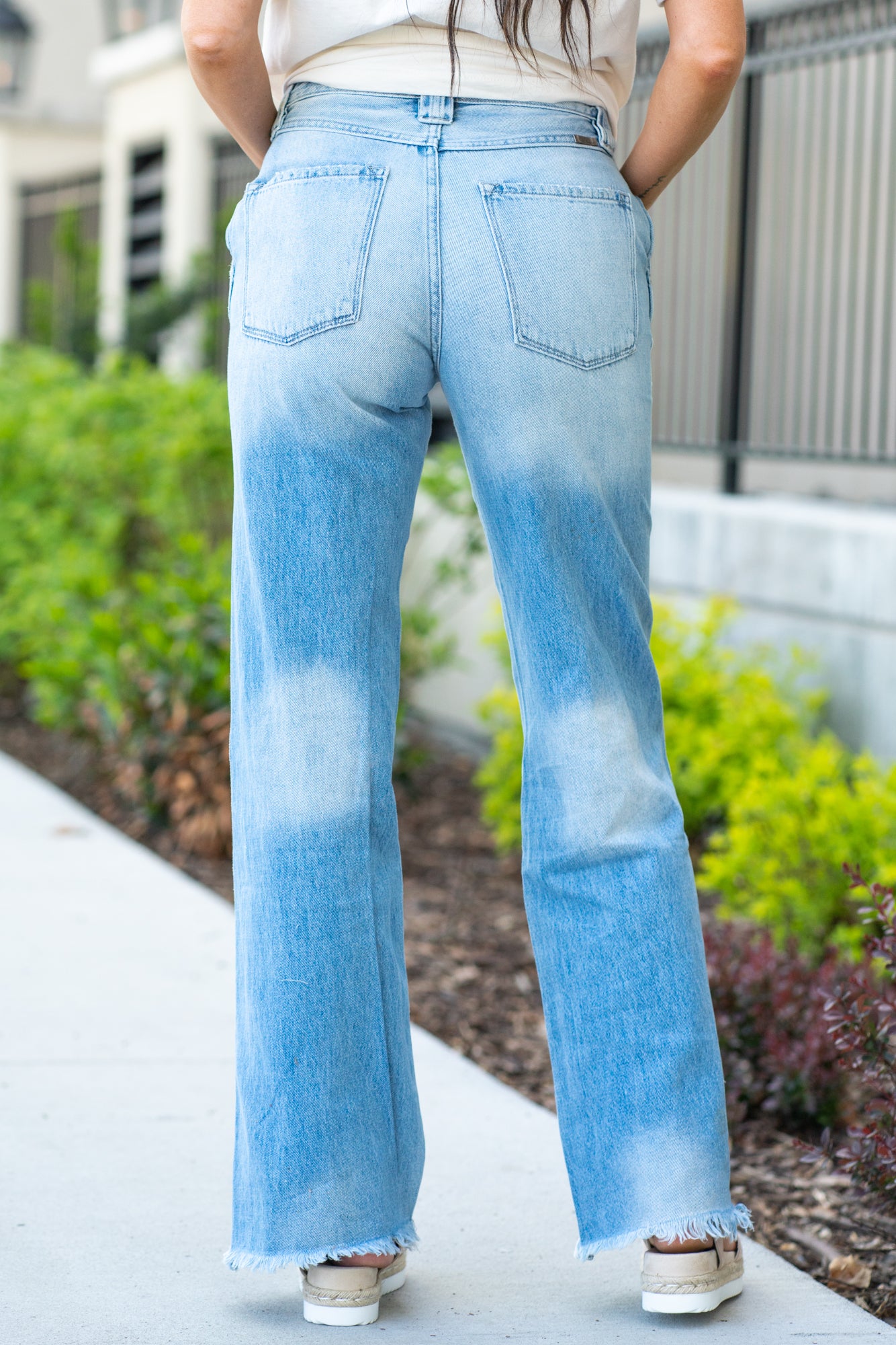 KanCan rigid denim with an ultra high rise and 90s wide flare and a hidden-button fly.