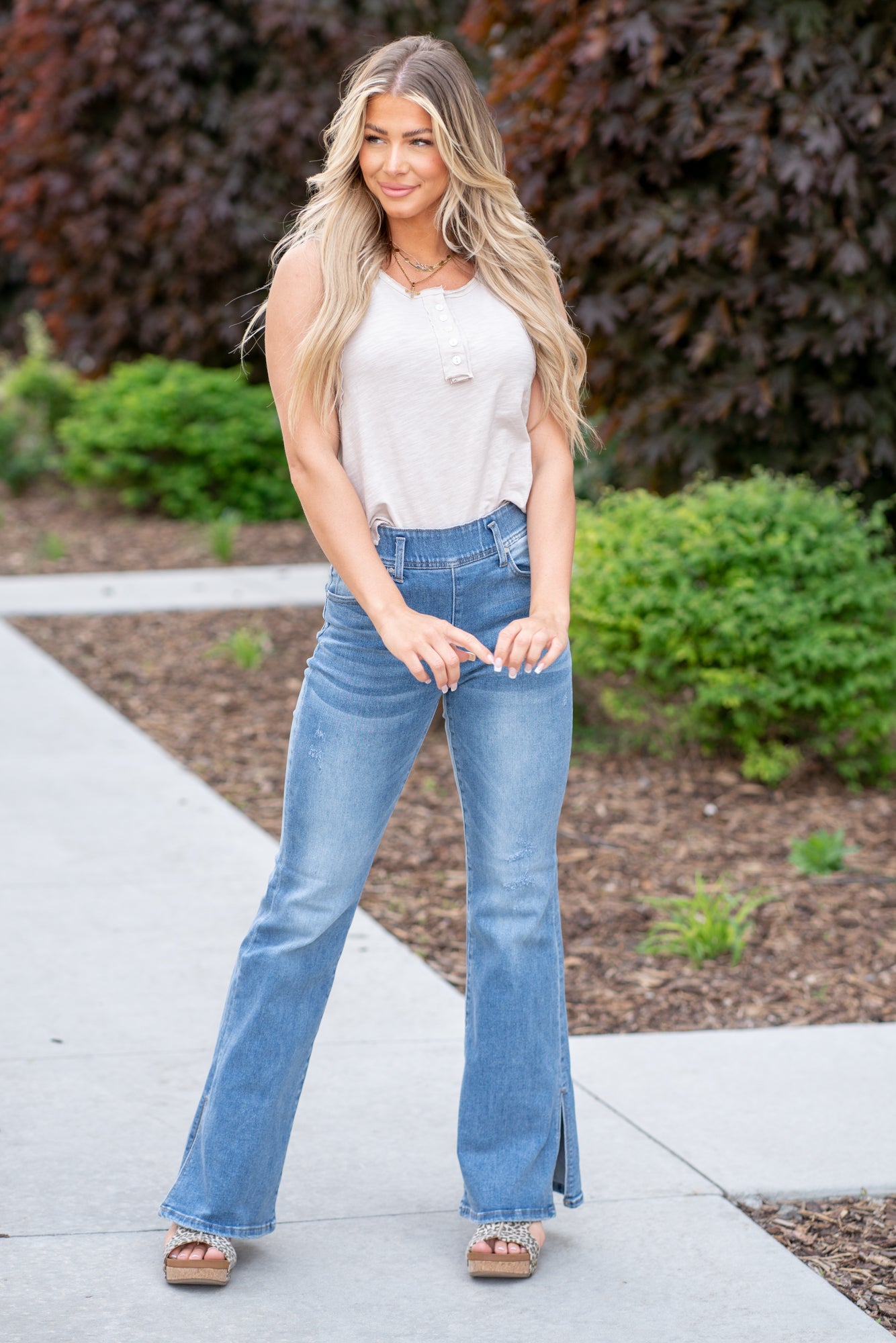 Introducing the effortlessly chic high-rise pull-on flare jeans with a side slit in a medium blue hue! These jeans combine comfort and style with their convenient pull-on design and trendy details. The high-rise waist offers a flattering fit and pairs perfectly with the flared leg, giving you a flattering silhouette. The side slit adds an unexpected twist, adding a touch of flair and a peek of skin. In a medium blue color, these jeans are versatile and can be dressed up or down for any occasion. Step into a world of comfort and fashion with these high-rise pull-on flare jeans