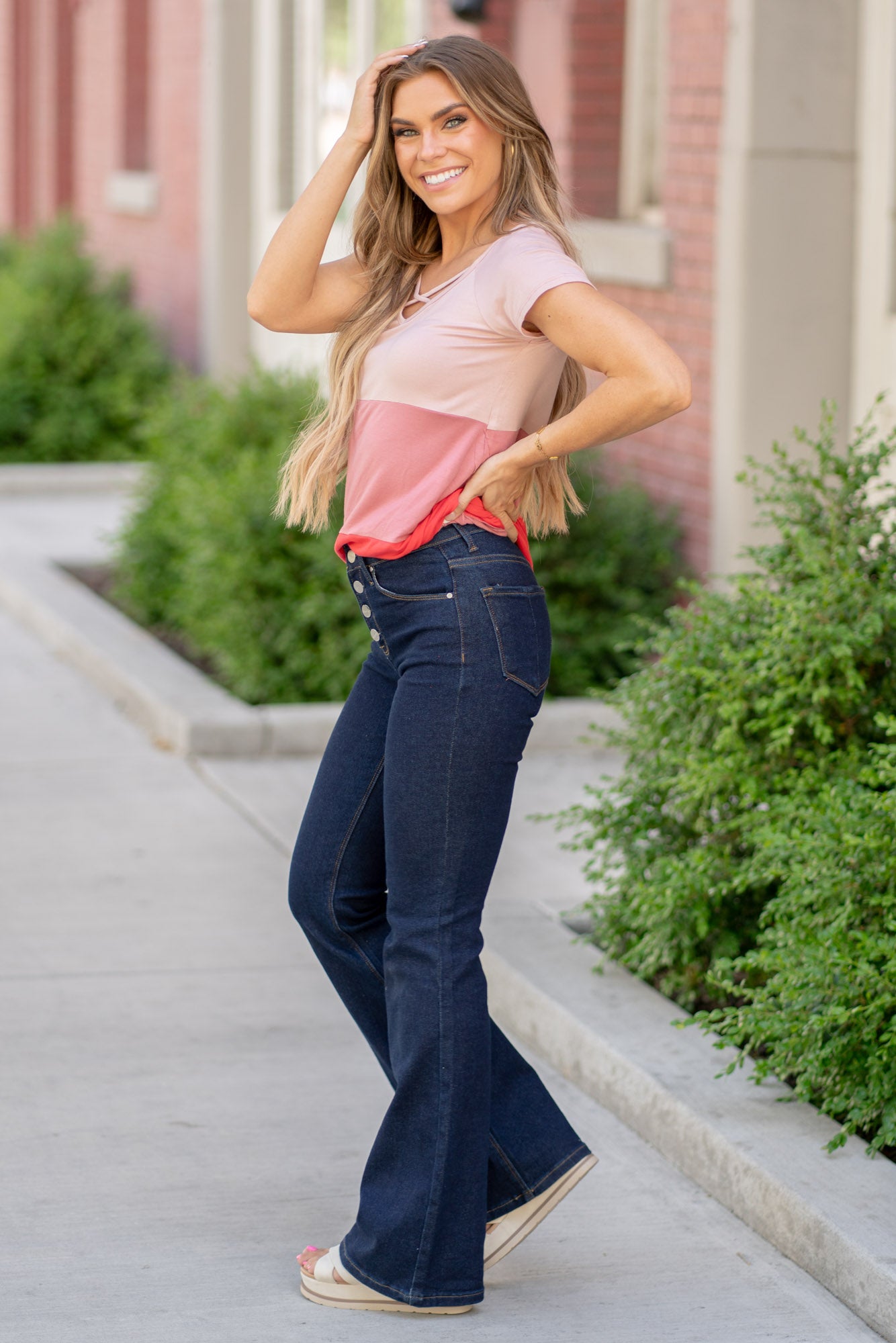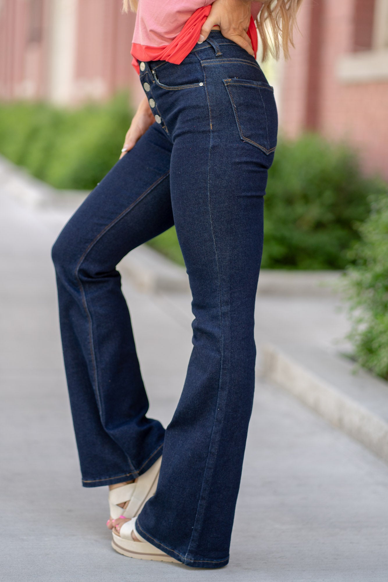 Step into the perfect fusion of retro cool and modern chic with our Mid-Rise Button Down Flare Jeans. The mid-rise cut ensures a flattering fit, while the button-down detailing adds a touch of vintage charm. Embrace the flare silhouette for a timeless look that effortlessly transitions from casual outings to stylish nights on the town. These jeans are your go-to for a fashion-forward statement that never goes out of style.