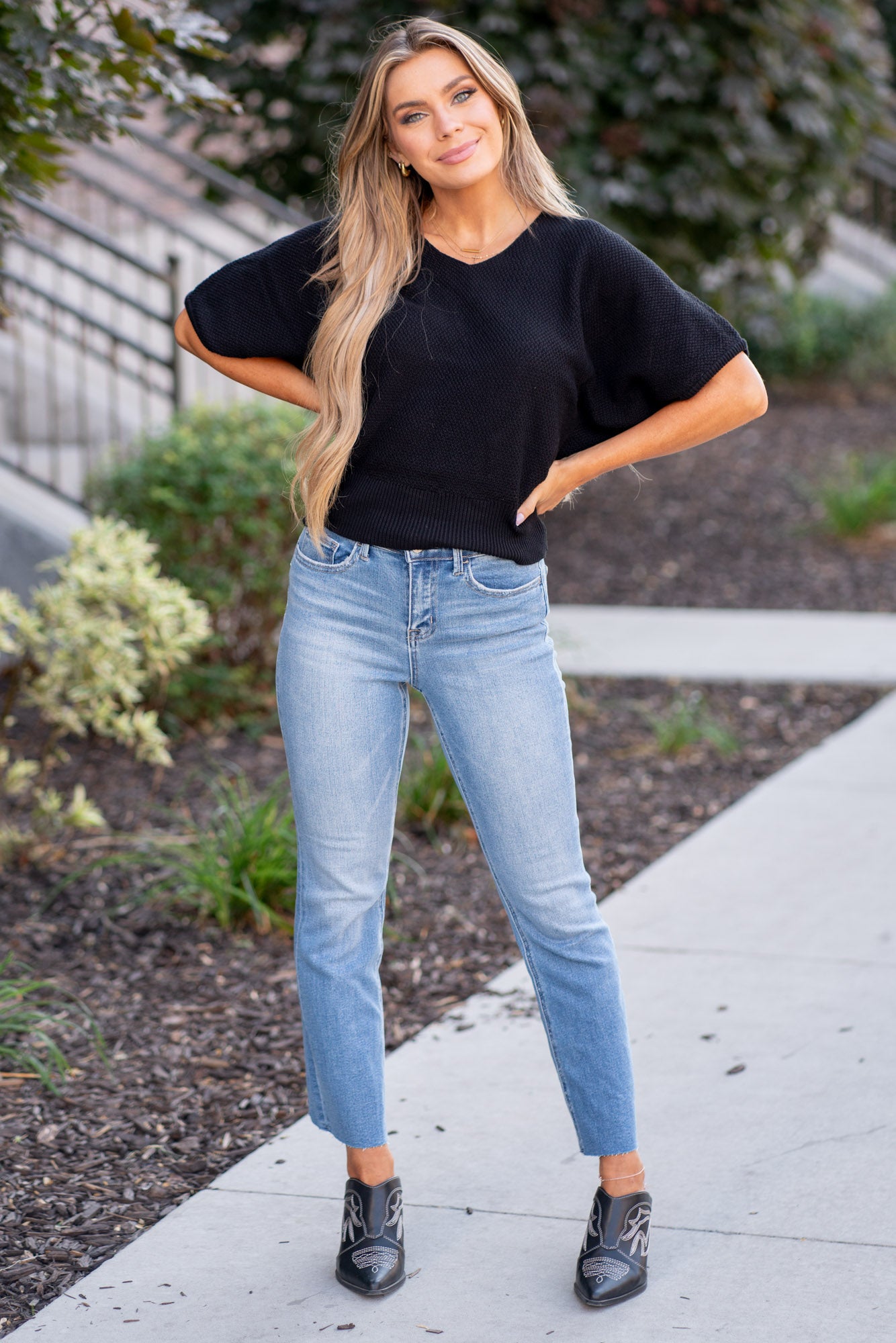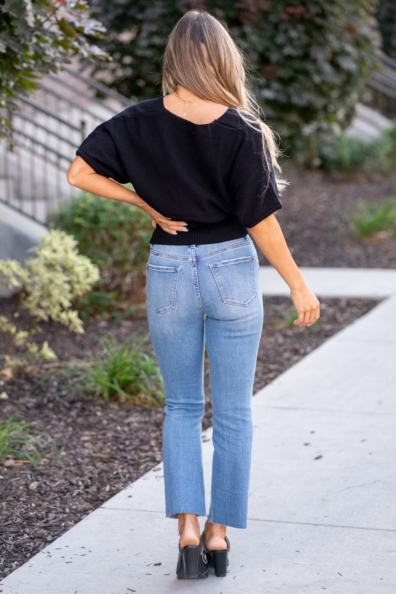 COMFORT STRETCH DENIM, HIGH RISE WAIST, CLEAN CUT RAW HEM, CROPPED LENGTH, FLARE JEANS