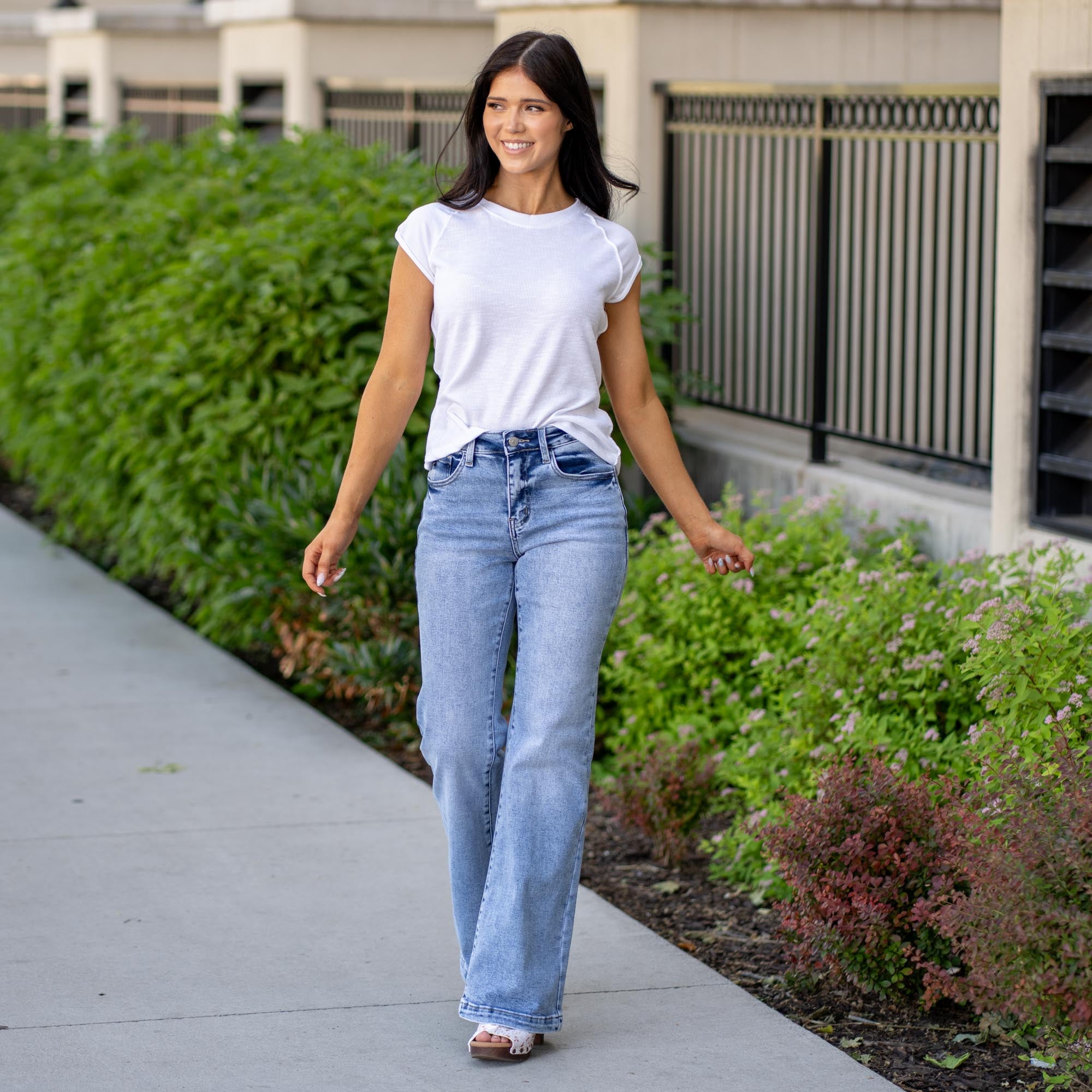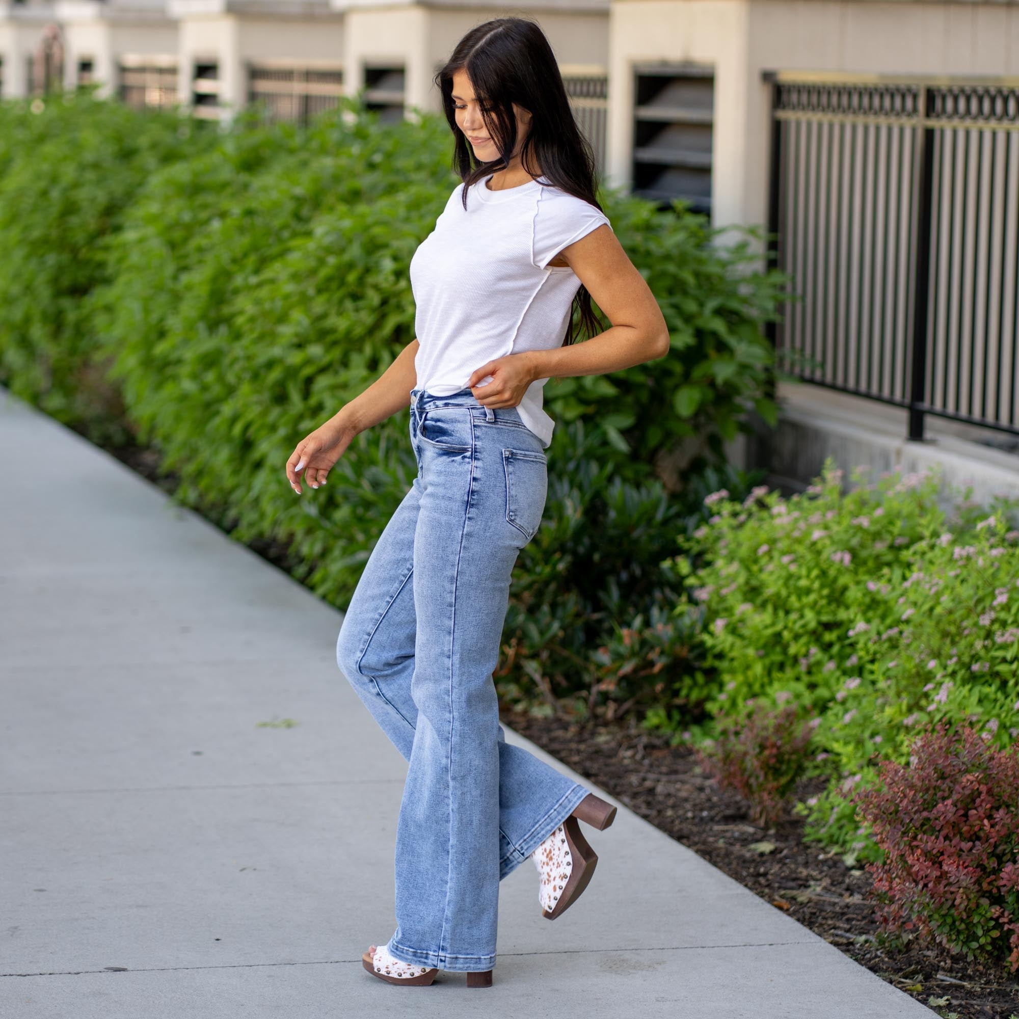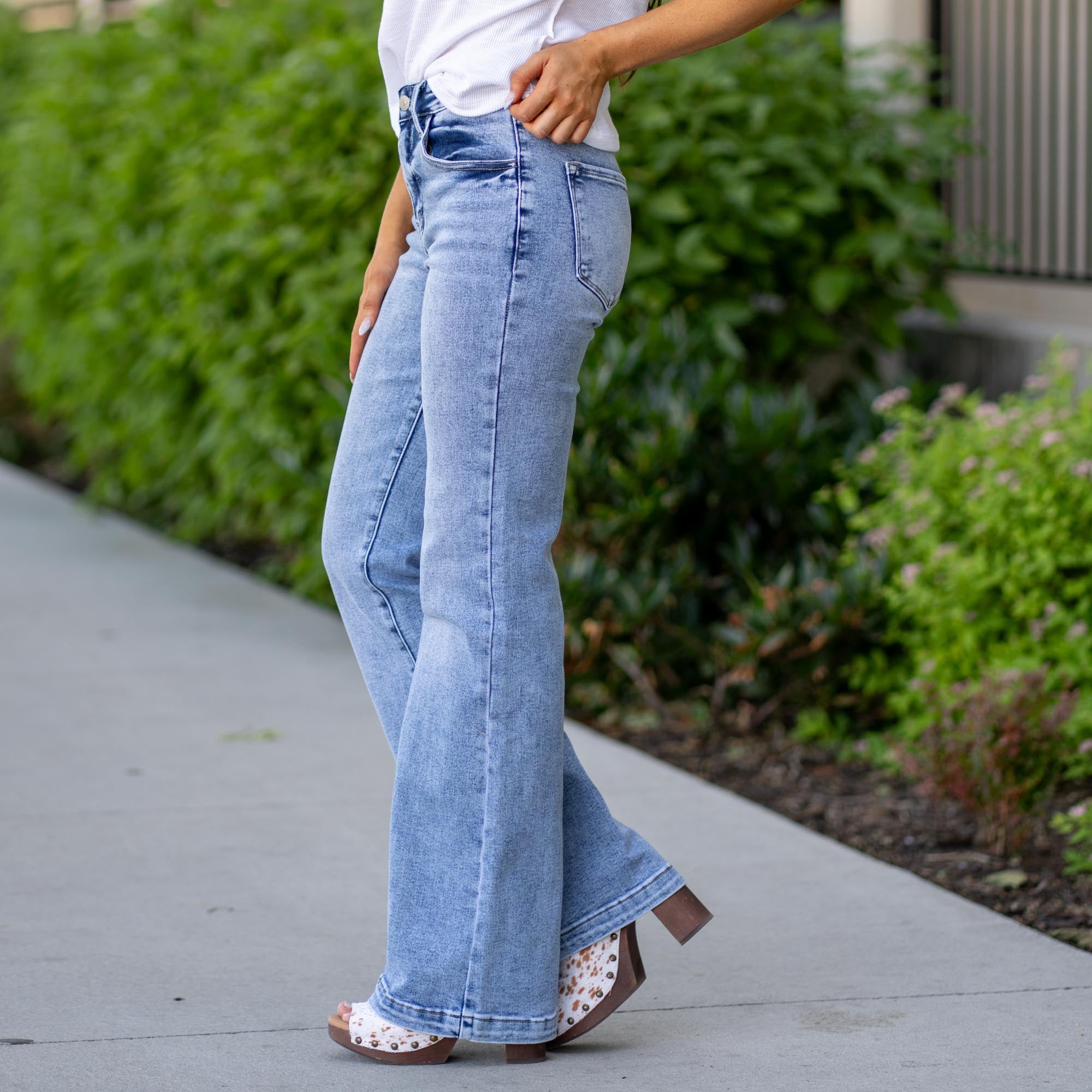 The Soleil Flare brings a fresh, airy vibe to your denim lineup. With a flattering high rise and a bold wide leg flare, this light wash style elongates your silhouette while offering all-day comfort thanks to its soft stretch denim. Finished with a classic 5-pocket design, zip fly, and a clean regular hem—it’s the perfect blend of throwback charm and modern ease.