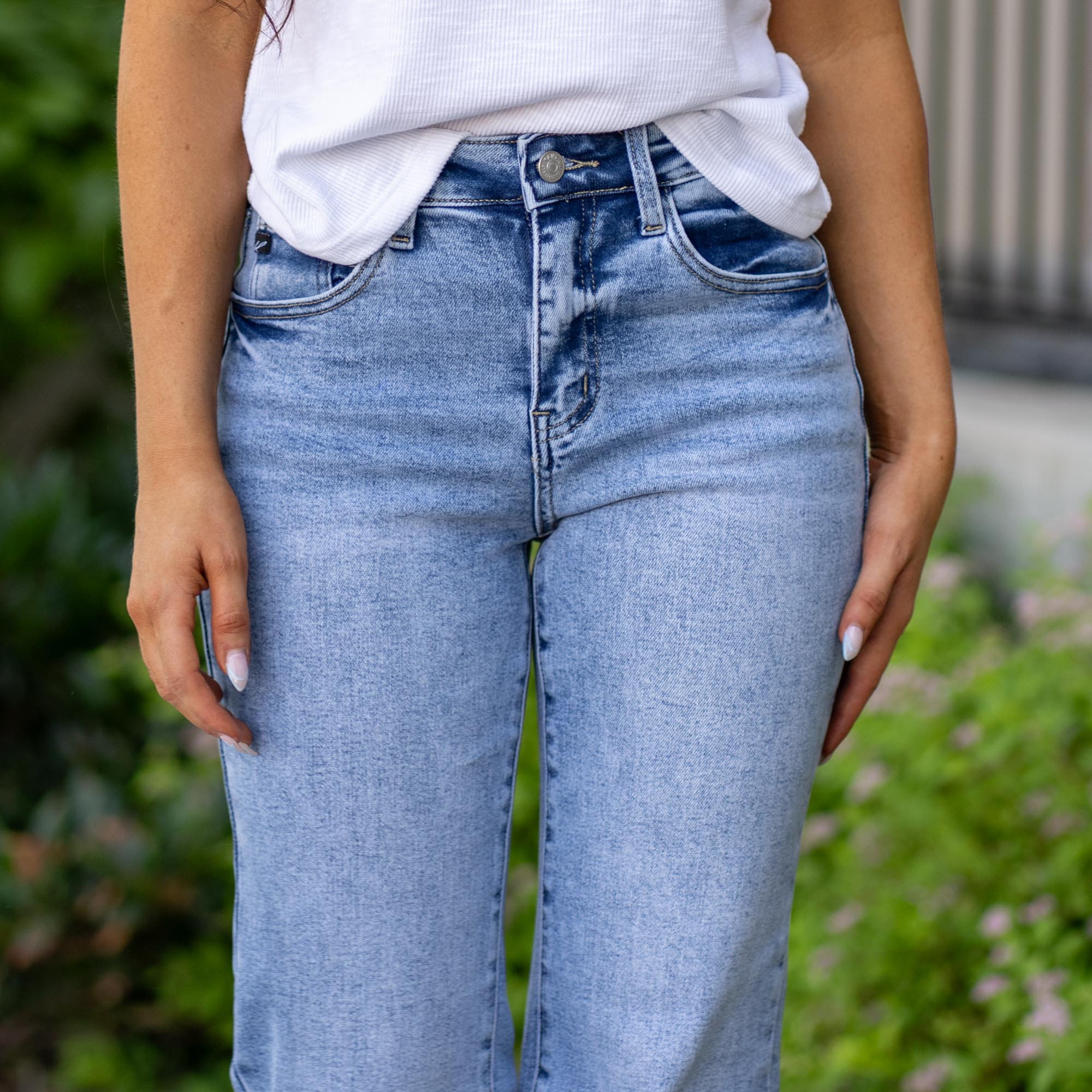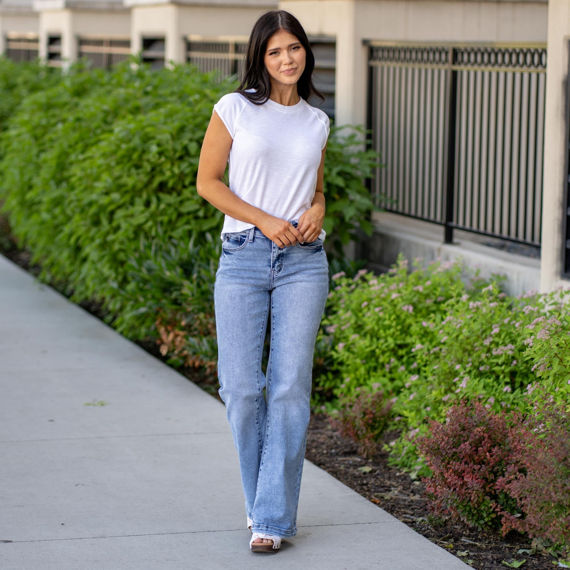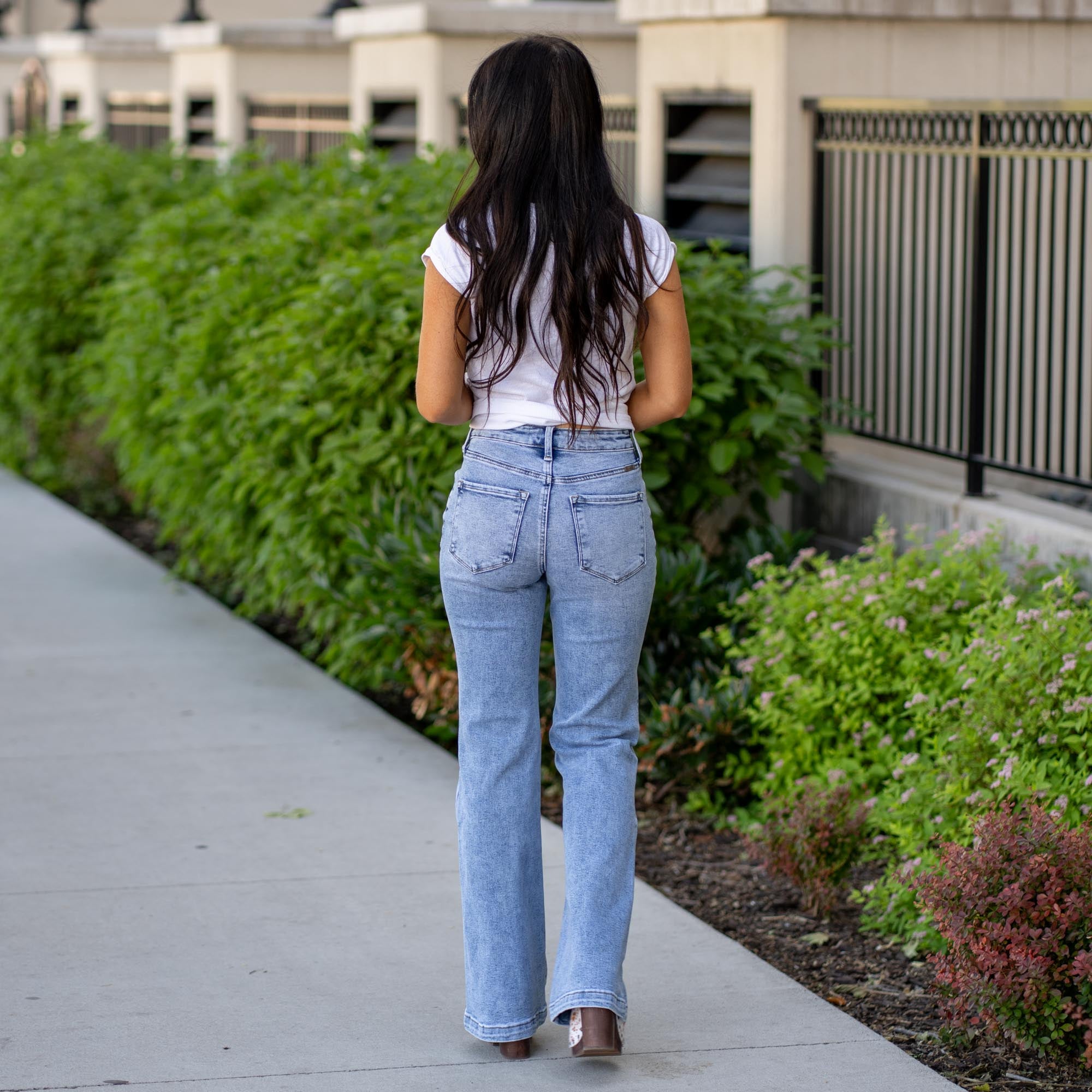 The Soleil Flare brings a fresh, airy vibe to your denim lineup. With a flattering high rise and a bold wide leg flare, this light wash style elongates your silhouette while offering all-day comfort thanks to its soft stretch denim. Finished with a classic 5-pocket design, zip fly, and a clean regular hem—it’s the perfect blend of throwback charm and modern ease.