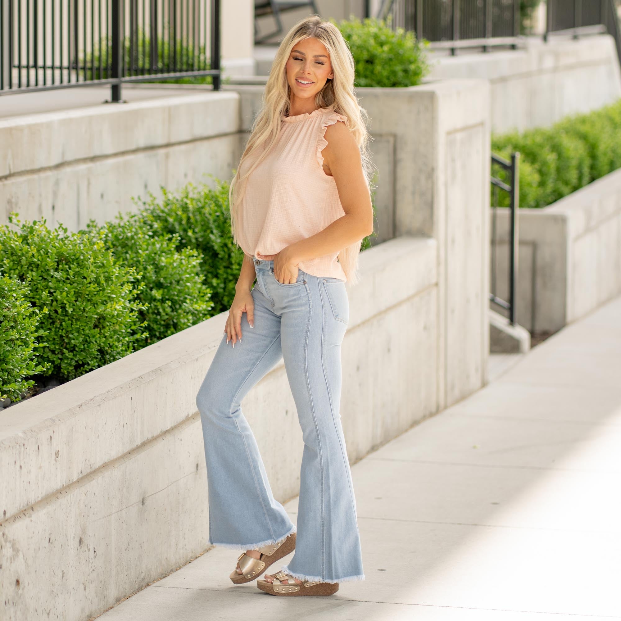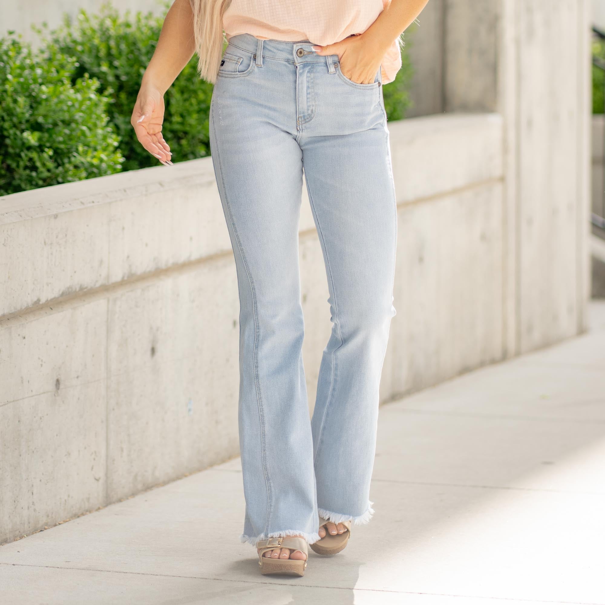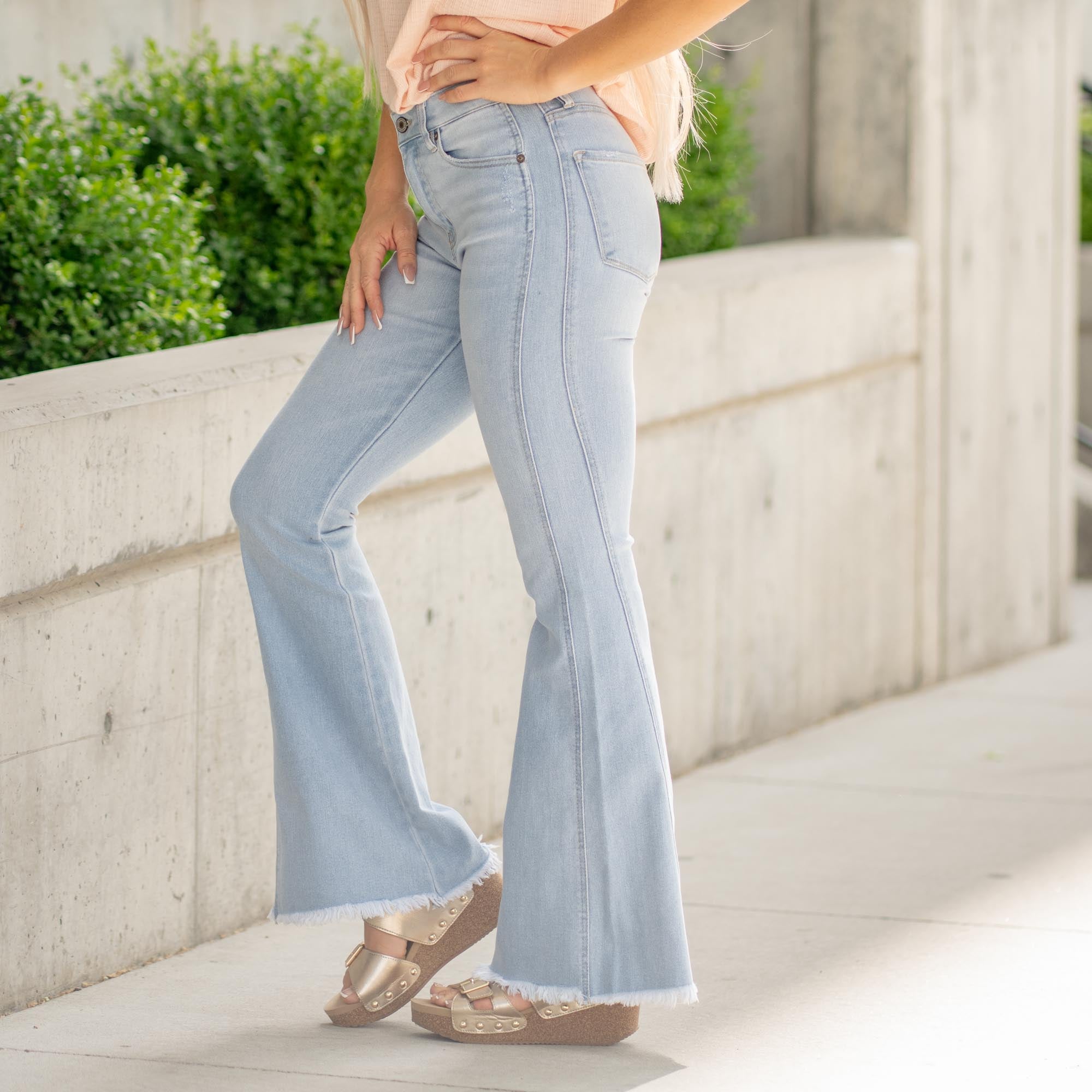 The Annika High Rise Flare – Curvy is designed to hug in all the right places and flow with ease. Crafted in a light blue wash with a raw hem for rustic charm, this high rise style tapers through the thigh and flares out at the calf for a timeless, leg-lengthening silhouette. Made from buttery-soft, super-stretch denim that’s as flexible as it is flattering, and finished with a five-pocket design, zip fly, and single-button closure—this pair is all about comfort that doesn’t compromise on style.