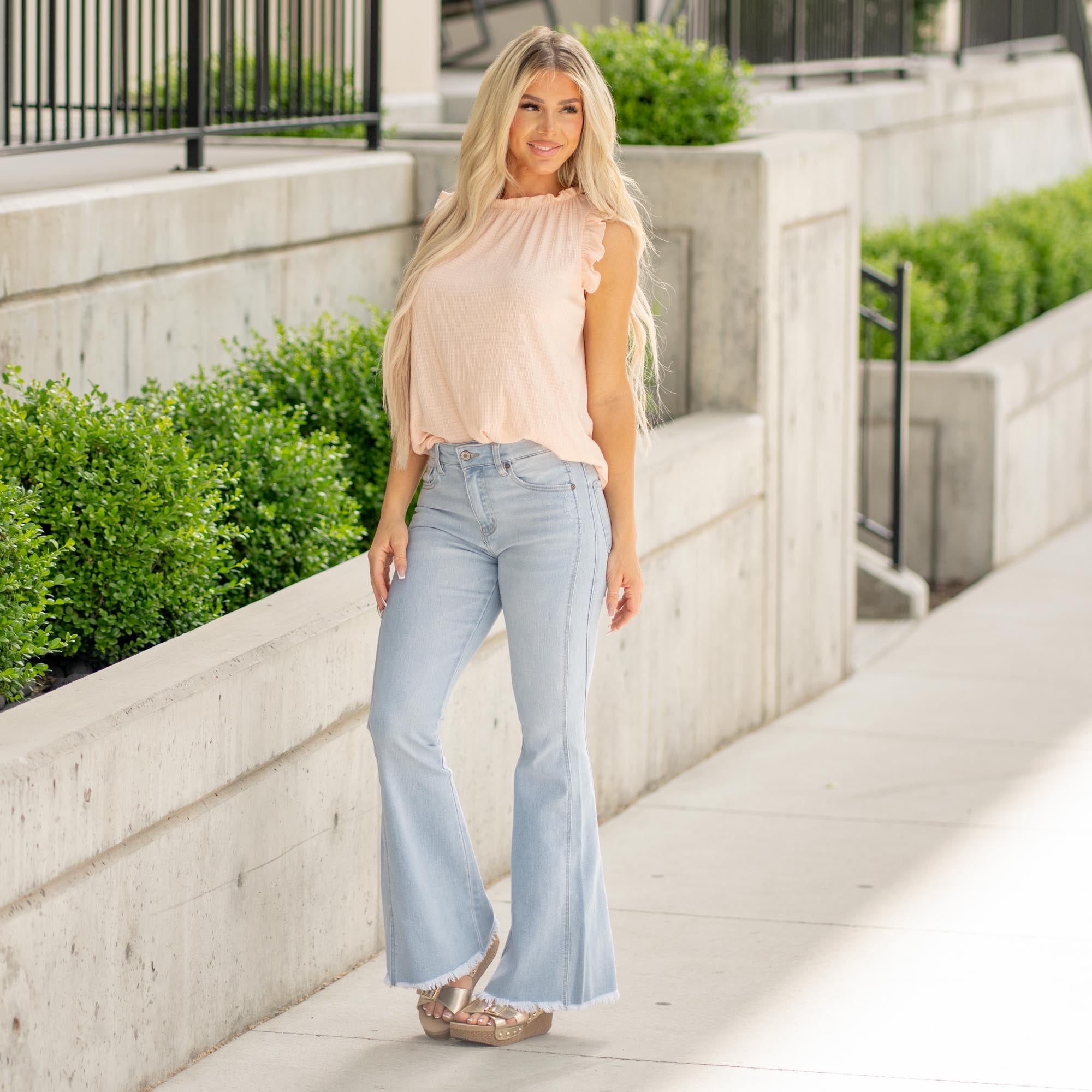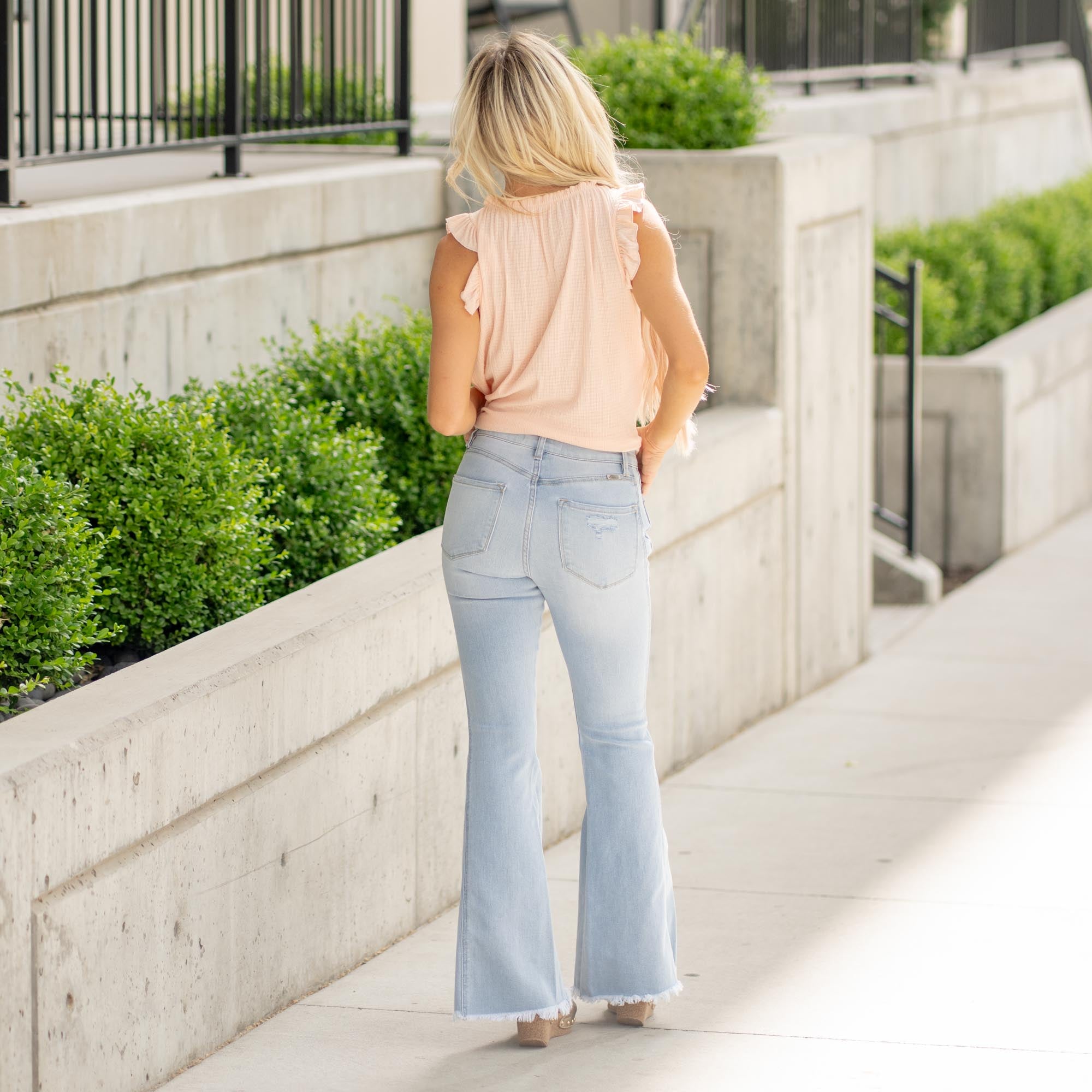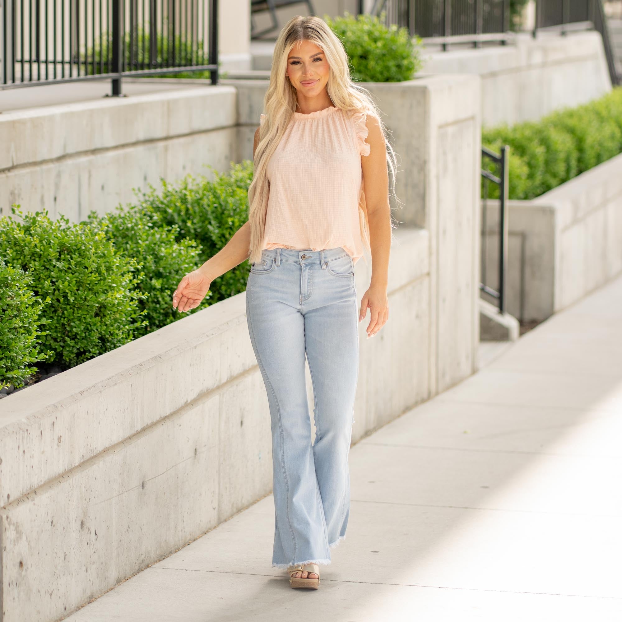 The Annika High Rise Flare – Curvy is designed to hug in all the right places and flow with ease. Crafted in a light blue wash with a raw hem for rustic charm, this high rise style tapers through the thigh and flares out at the calf for a timeless, leg-lengthening silhouette. Made from buttery-soft, super-stretch denim that’s as flexible as it is flattering, and finished with a five-pocket design, zip fly, and single-button closure—this pair is all about comfort that doesn’t compromise on style.