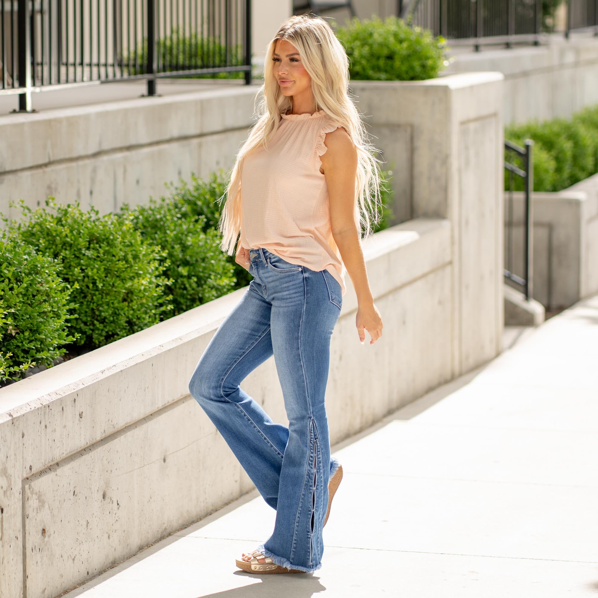 Bold, flattering, and made to stand out. The Rila High Rise Flare hugs your waist and thighs before kicking out at the knee into a sculpted flare that flatters every step. Featuring pieced paneling at the lower leg and a frayed hem, this style brings a unique twist to a classic silhouette. Finished with front whiskering, a single-button closure, zip fly, and a classic 5-pocket design—this pair was made to turn heads.