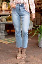 These jeans feature a high rise with a kick flare and a square front pocket.- Flare, 26.5" Inseam*