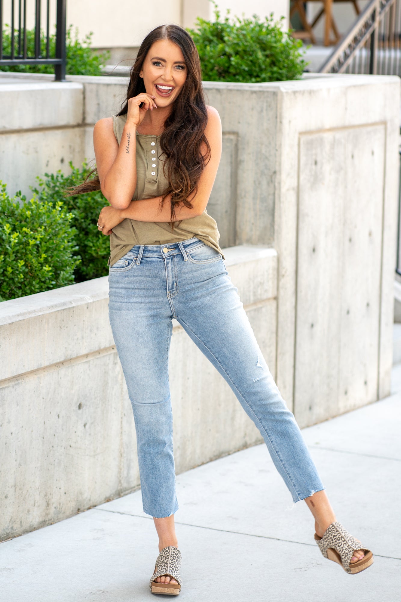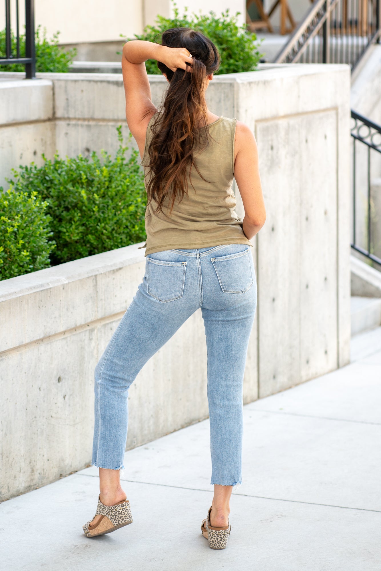 Alexis wears a size 25 in jeans, a small in tops, and 7 in shoes. She is wearing size 25 in these jeans.