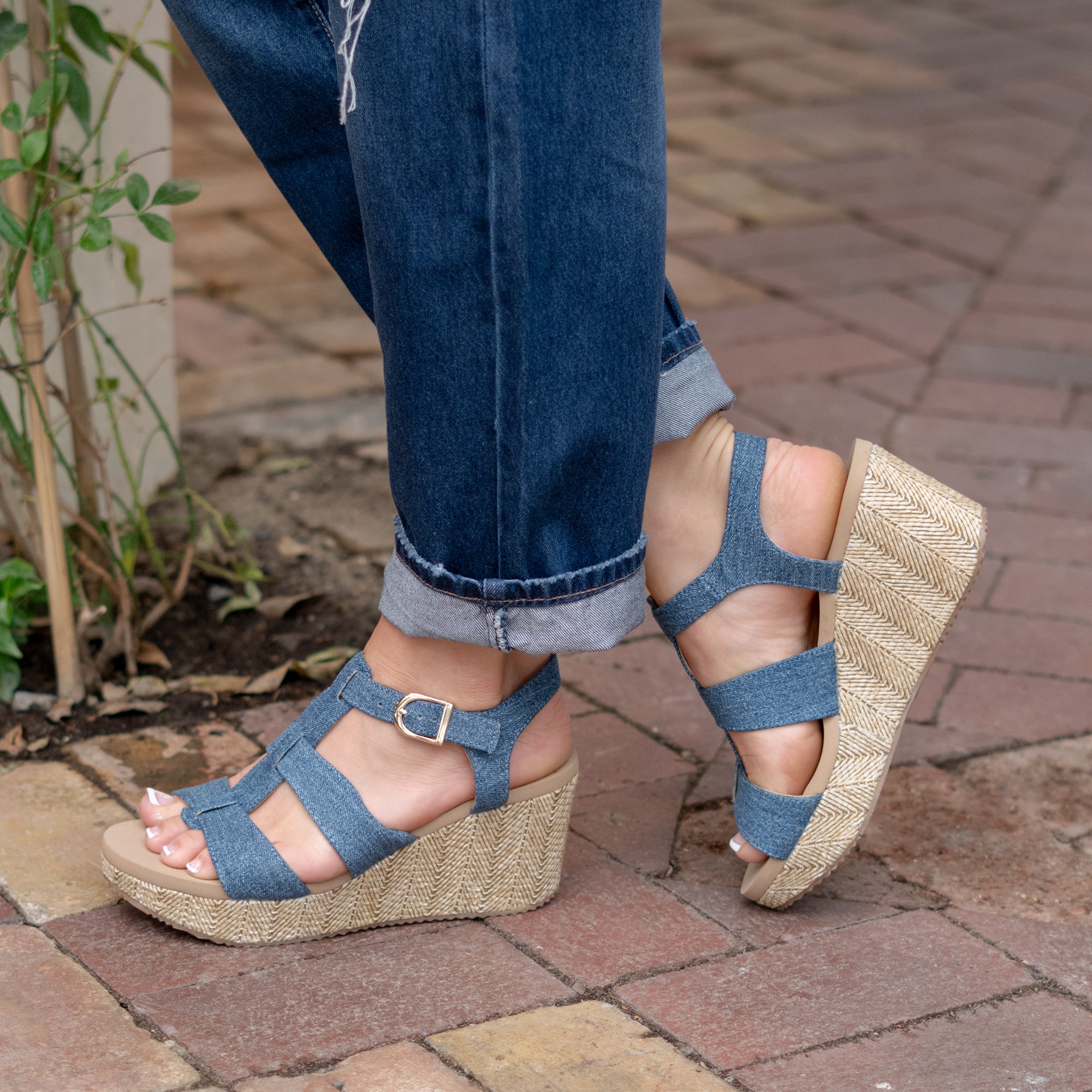 The Crimini wedge sandal from Volatile combines effortless style with all-day comfort, featuring a chic metal buckle and a woven raffia wedge for a natural, textured look. Available in a choice of cork or denim upper, it offers a versatile design that pairs perfectly with casual or dressier outfits. The signature comfort EVA insole ensures cushioning and support with every step, making the Crimini sandal your go-to choice for a stylish and comfortable lift this season.