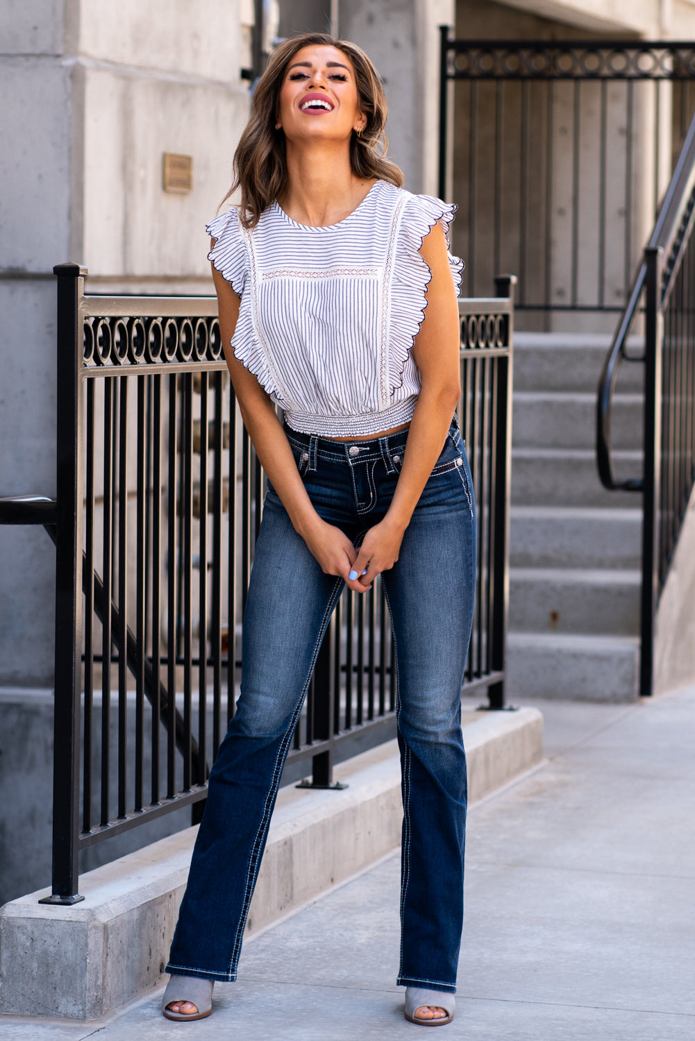 Light and easy, this ruffled smocked top will dress up all of your high waisted jeans.