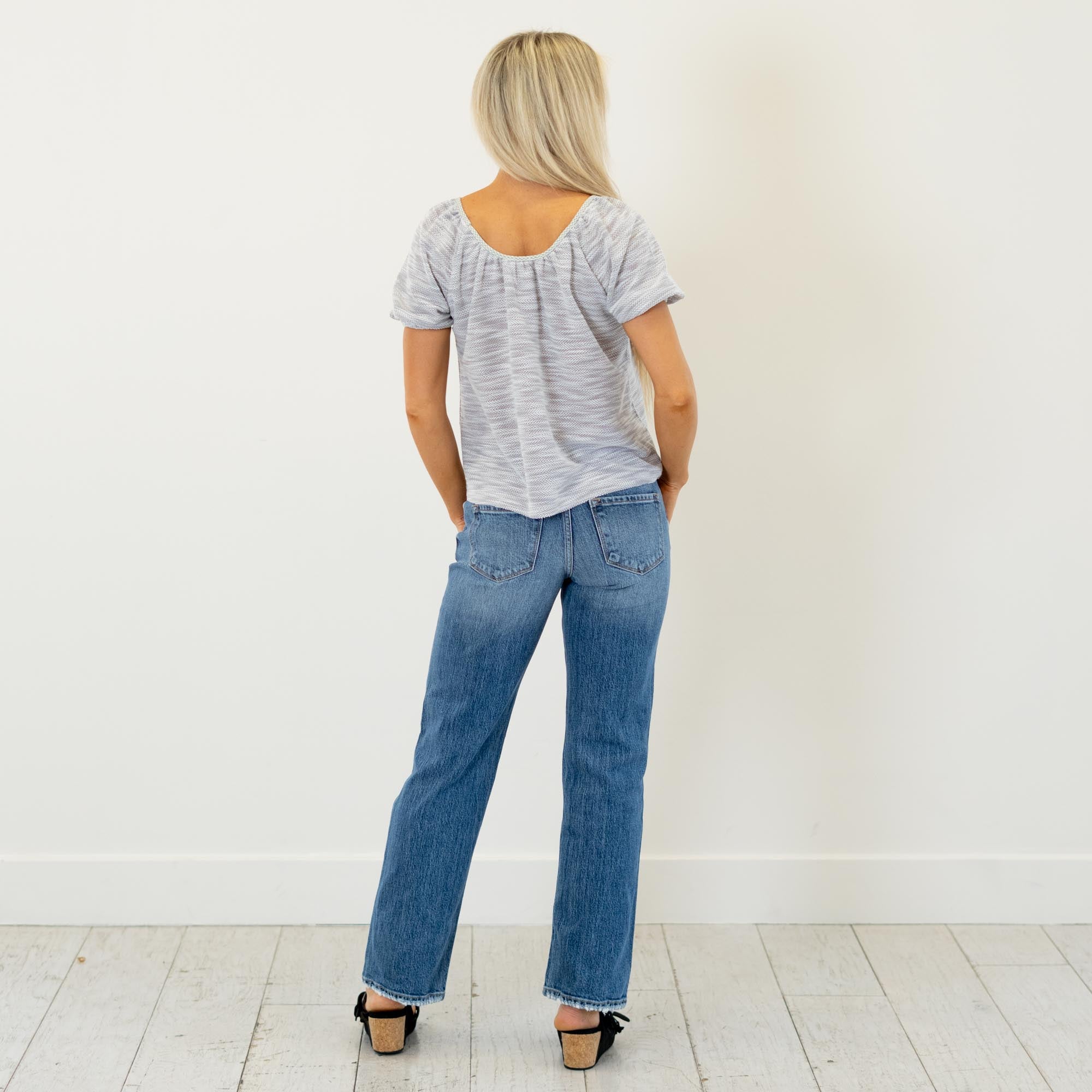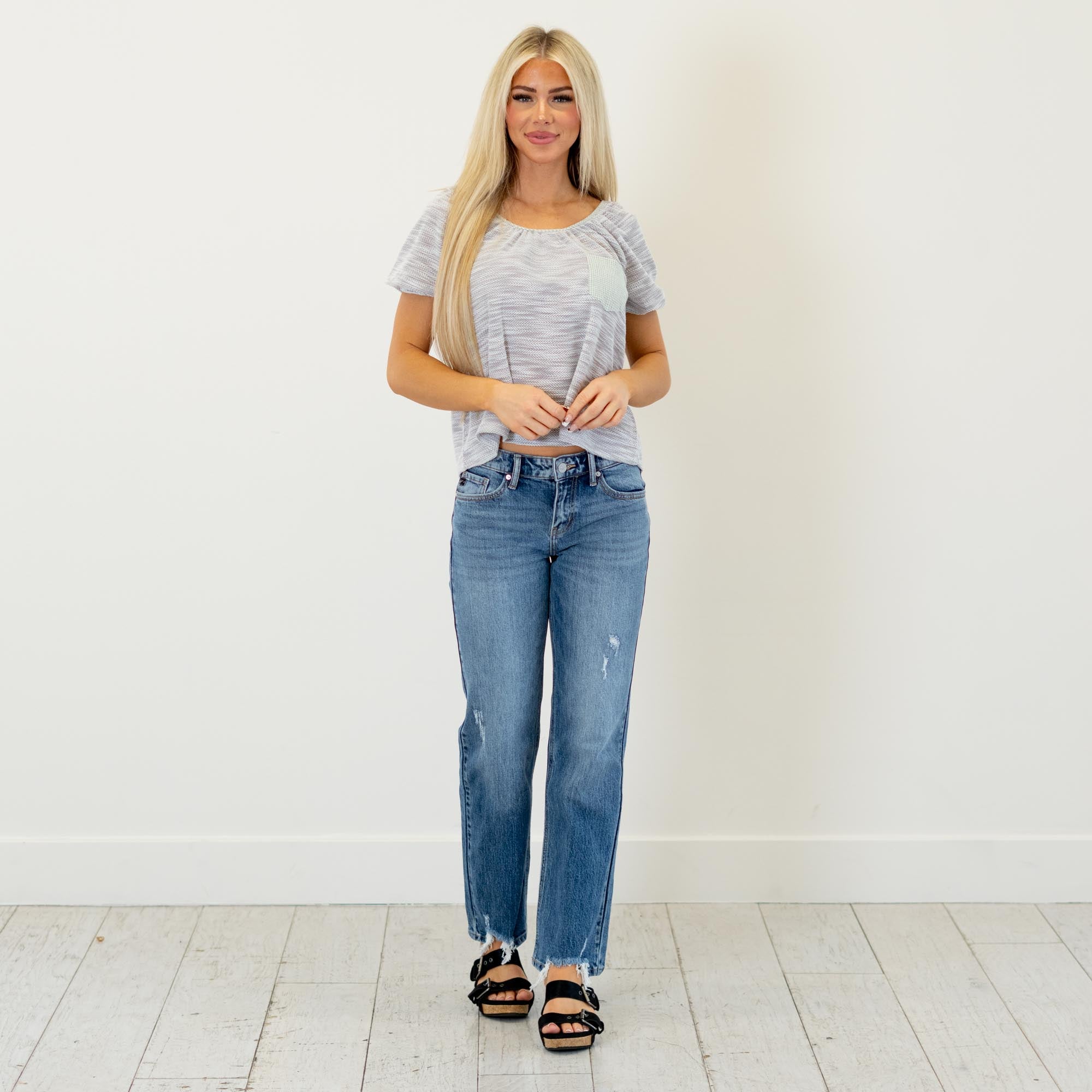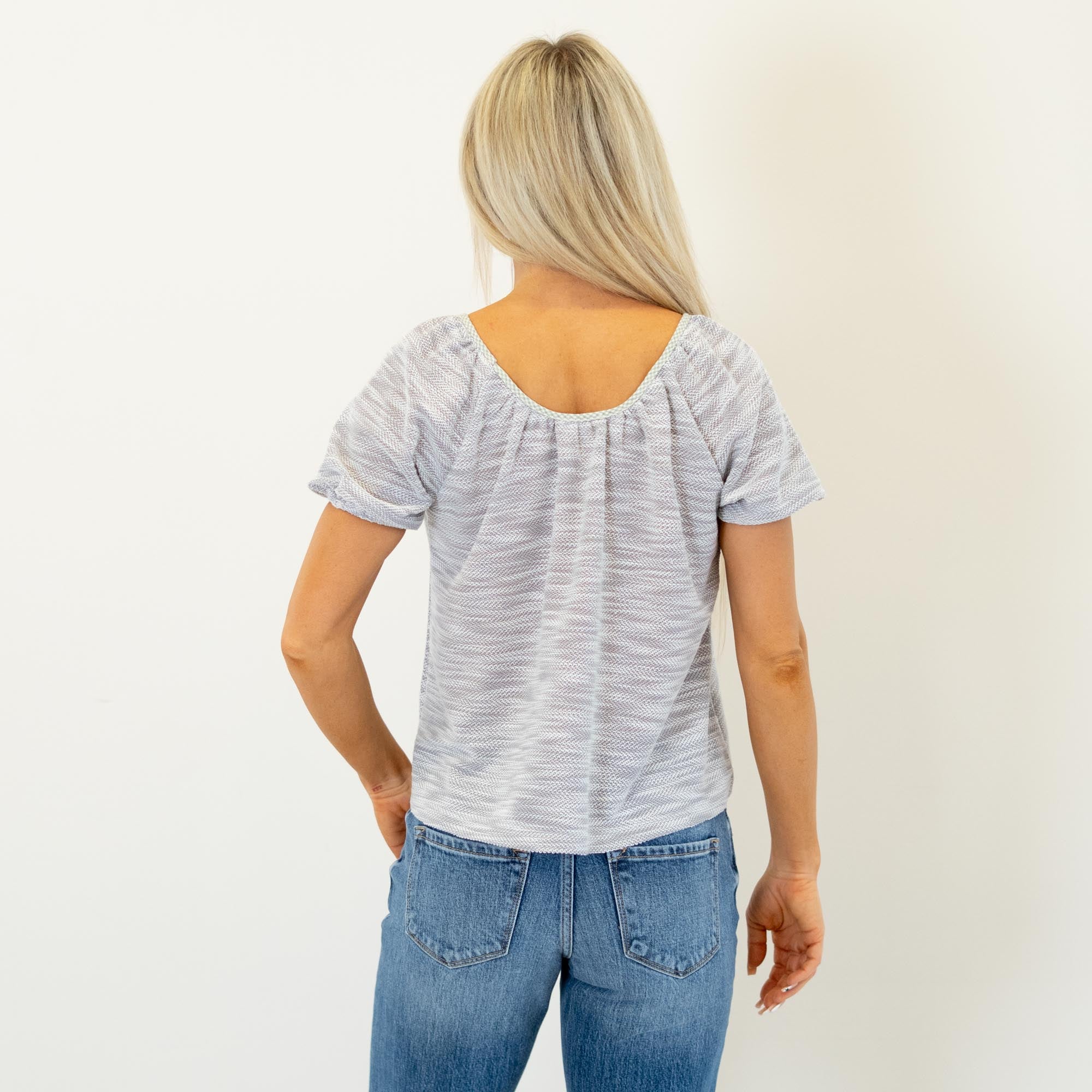 Soft and textured, this grey knit top features a deep round neckline and a plaid contrast pocket for a cozy, casual finish. Lightweight and easy to style, it’s the perfect everyday throw-on.