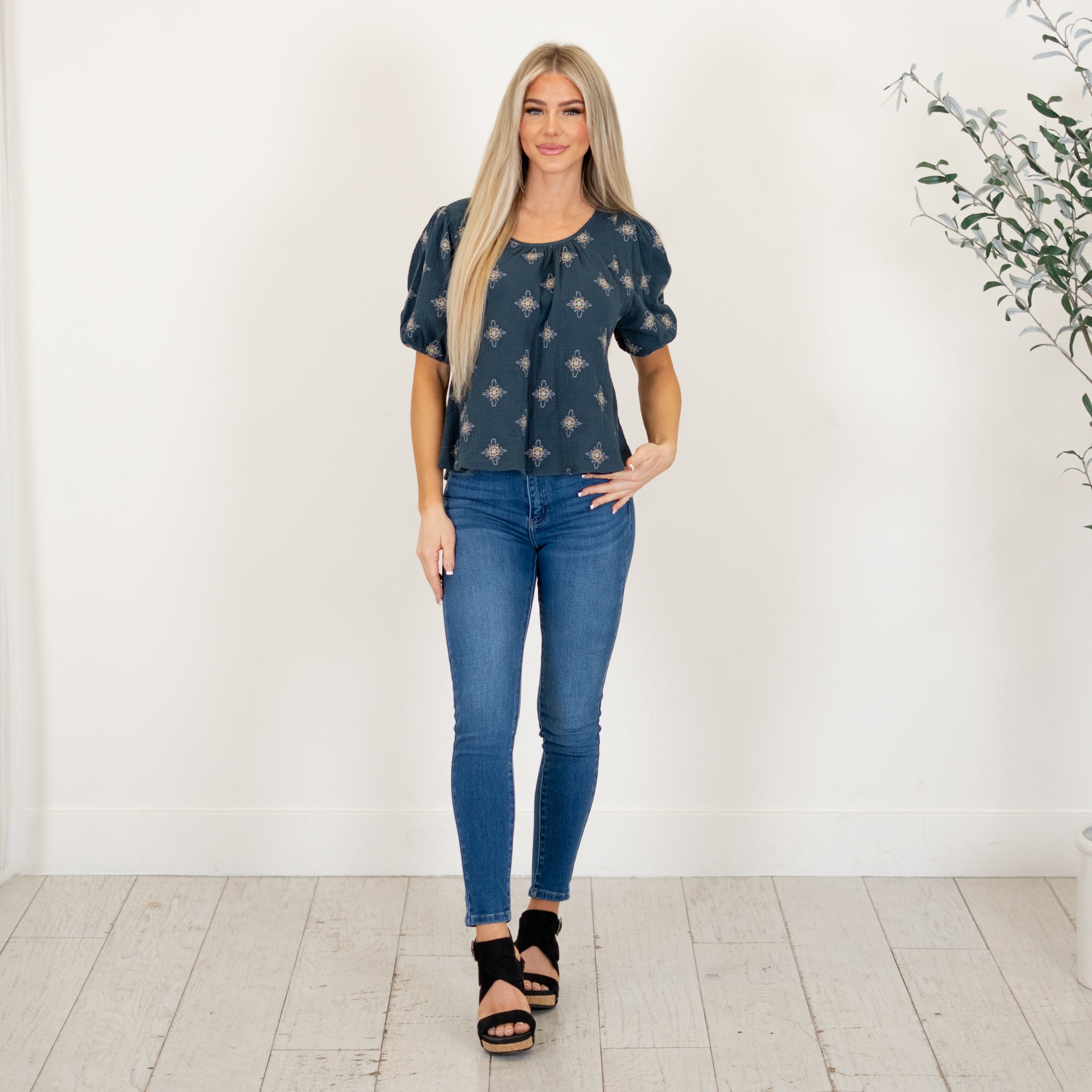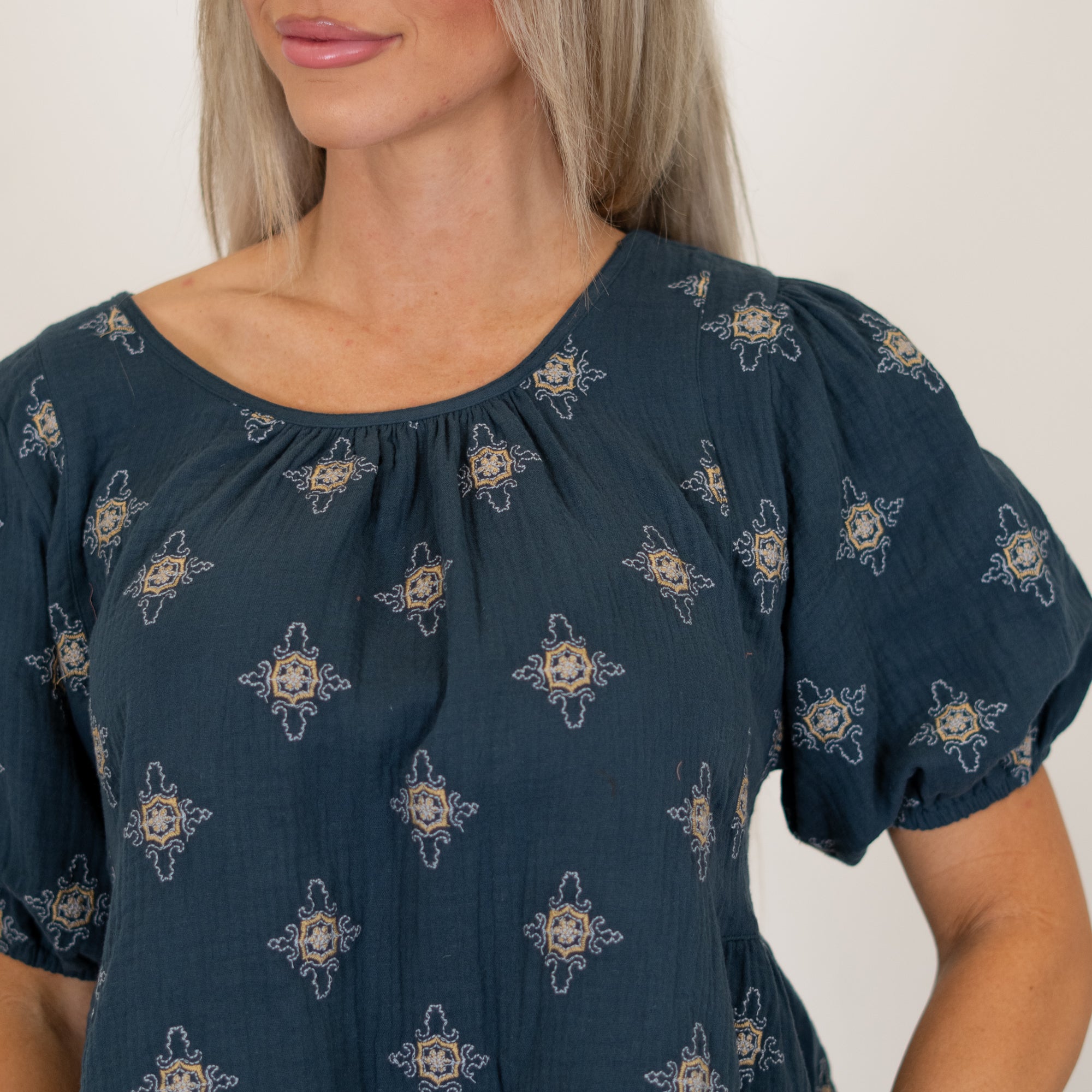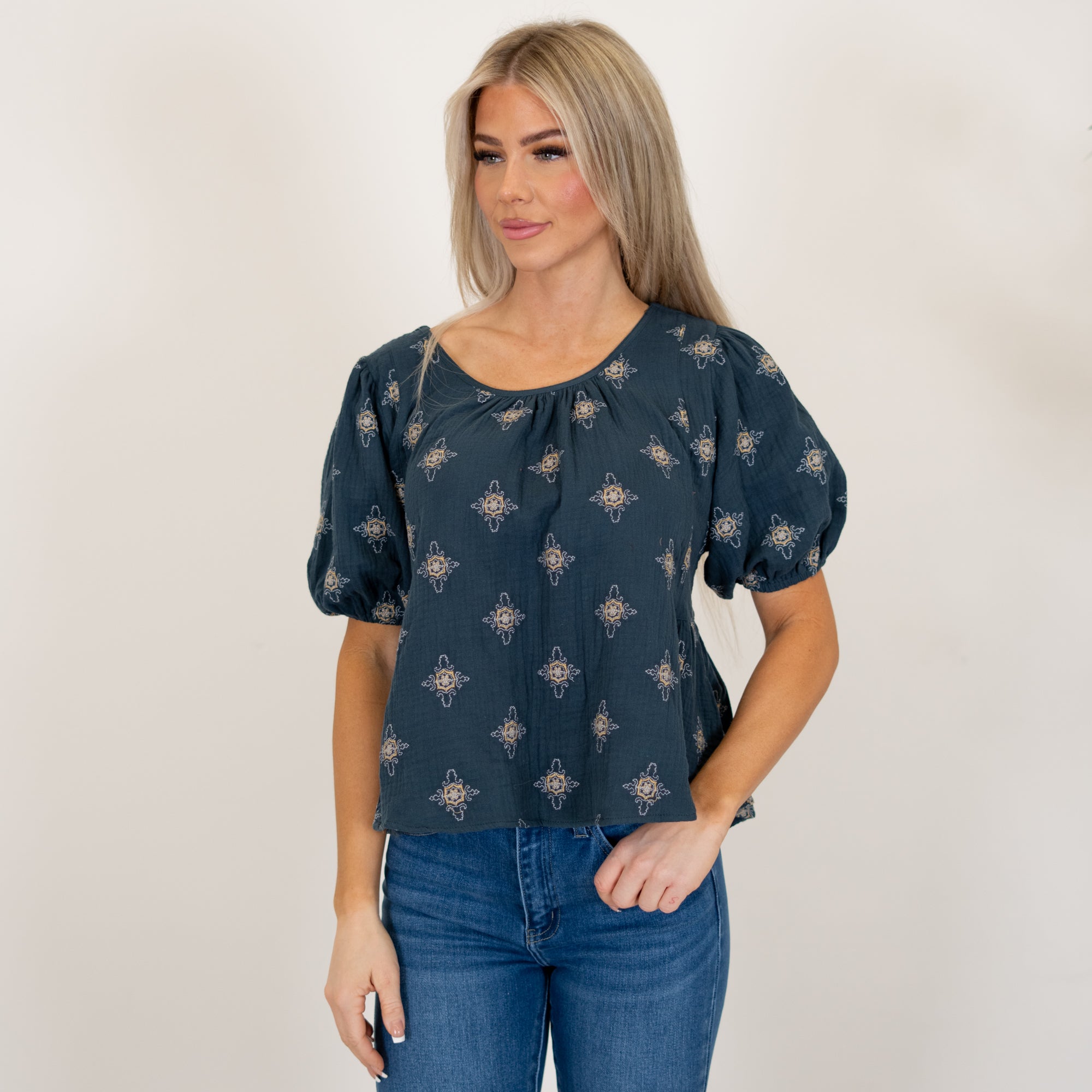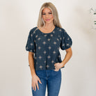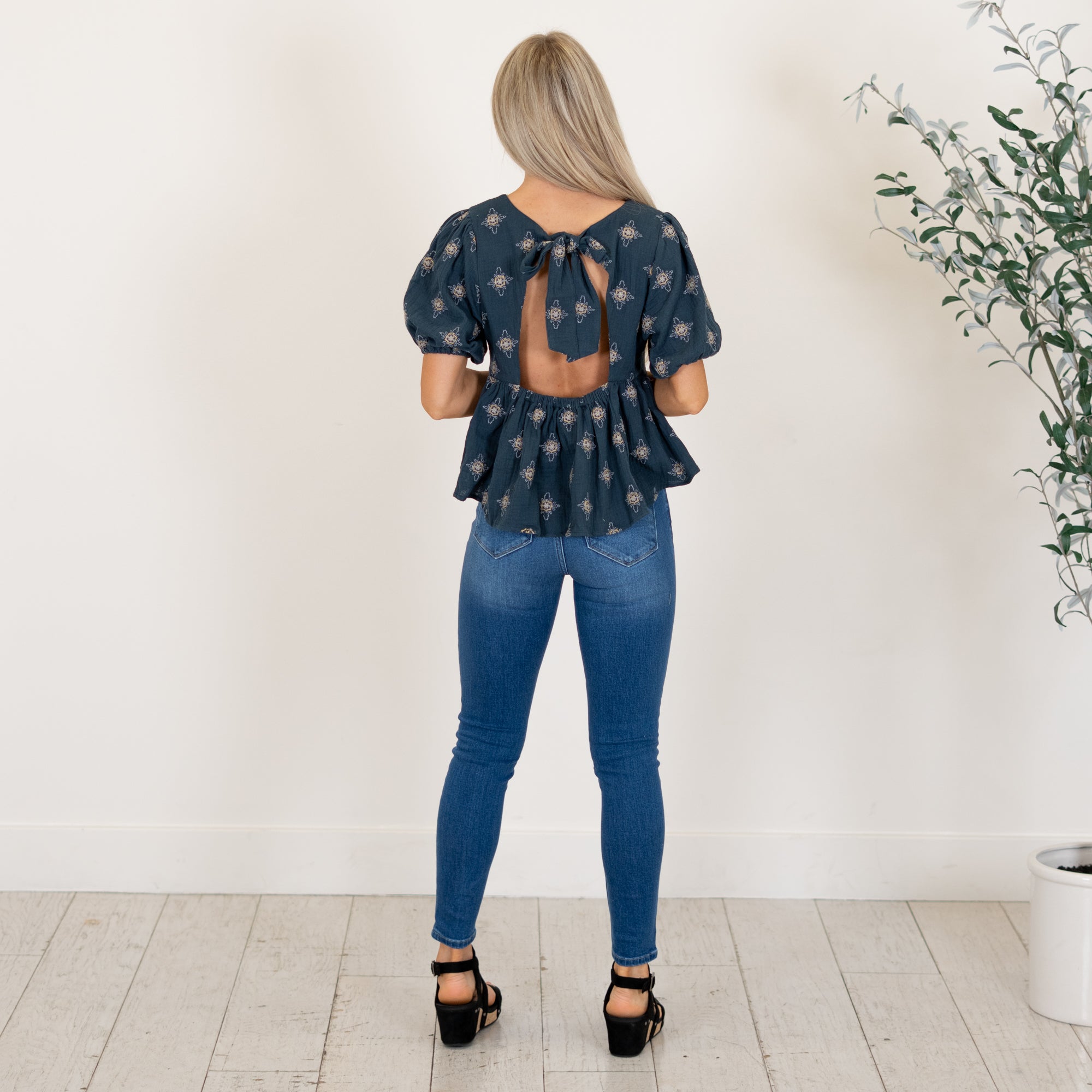 This tie-back peplum top features delicate embroidery and romantic bubble sleeves for an elevated, feminine feel. The peplum silhouette flatters the waist while the adjustable tie back adds a charming finishing touch. An easy statement piece that dresses up your favorite denim without feeling overdone.