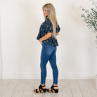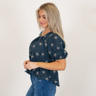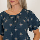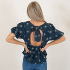 Hem & Thread Tie-Back Embroidered Bubble Sleeve Peplum Top Winter Spruce