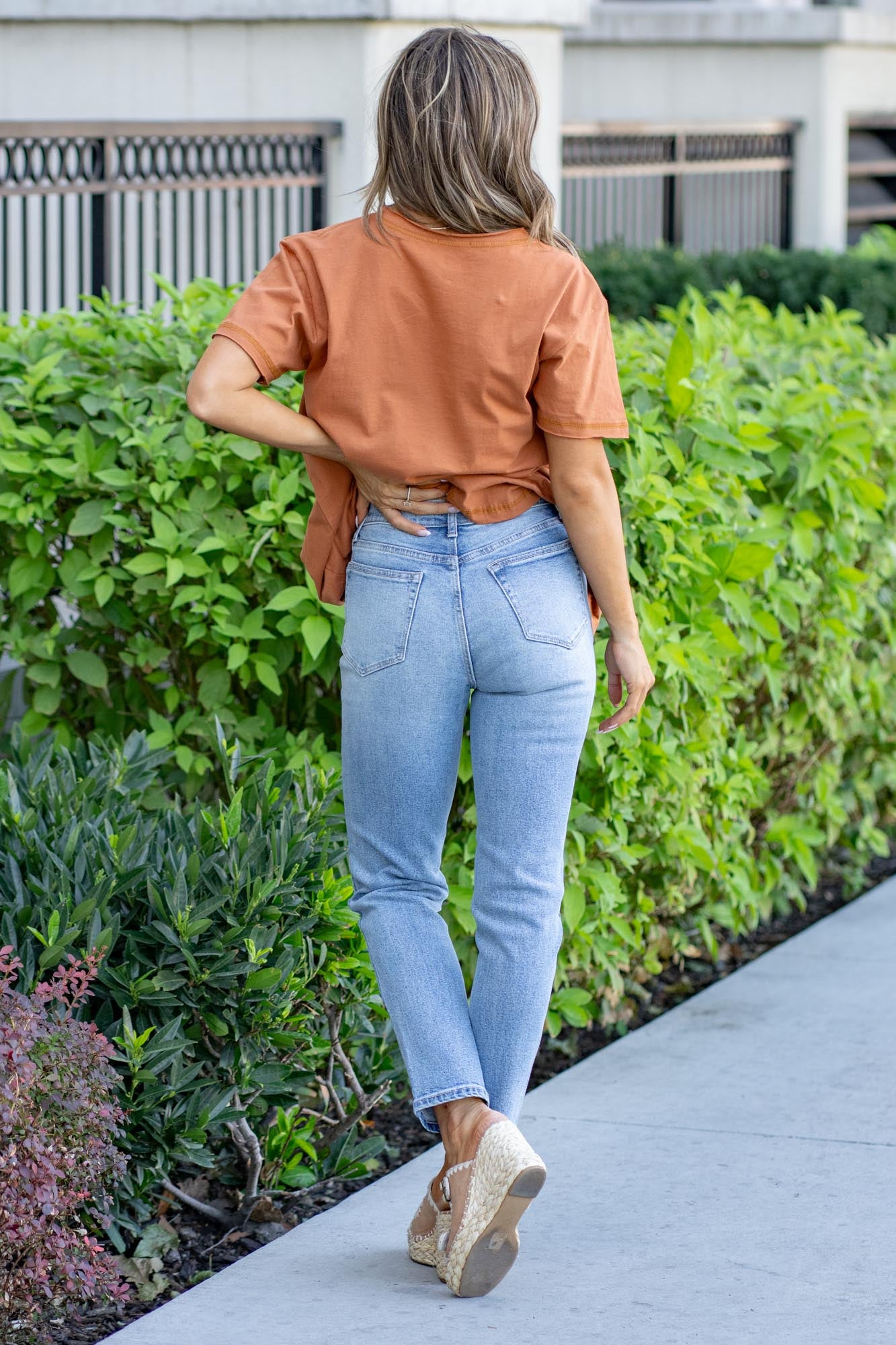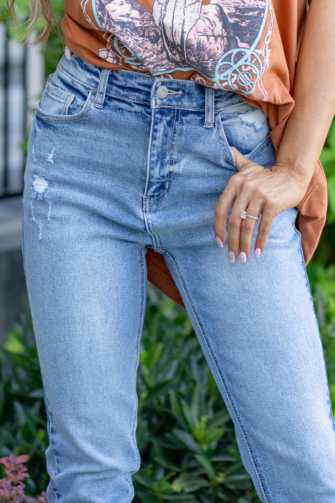 The Horizon High Rise Straight Jeans are a timeless staple with a modern edge. Designed with an 11 ½" rise, they sit comfortably at the waist and fall into a classic straight-leg silhouette that flatters every shape. The light wash is paired with slight distressing for a relaxed, lived-in look that’s perfect for everyday wear.