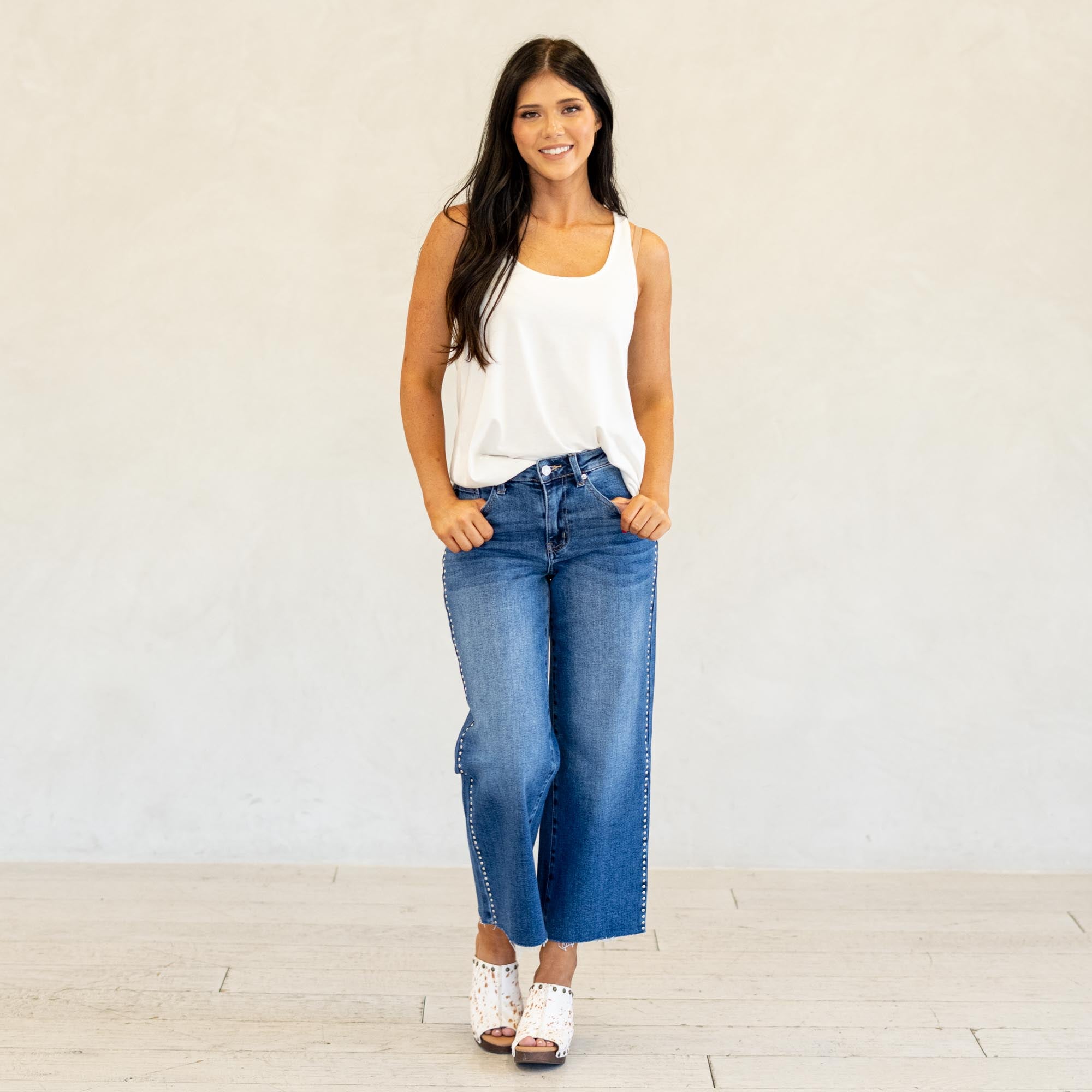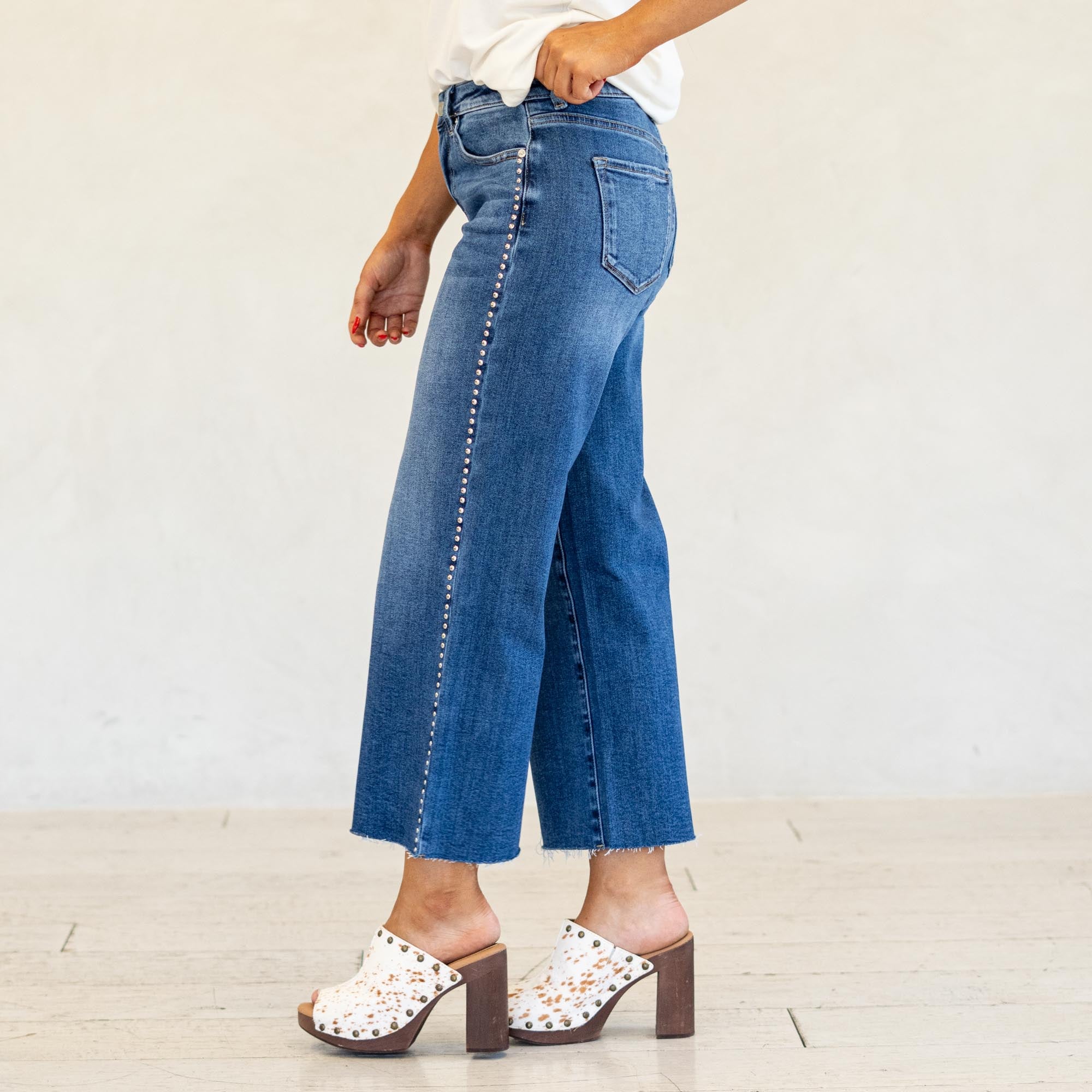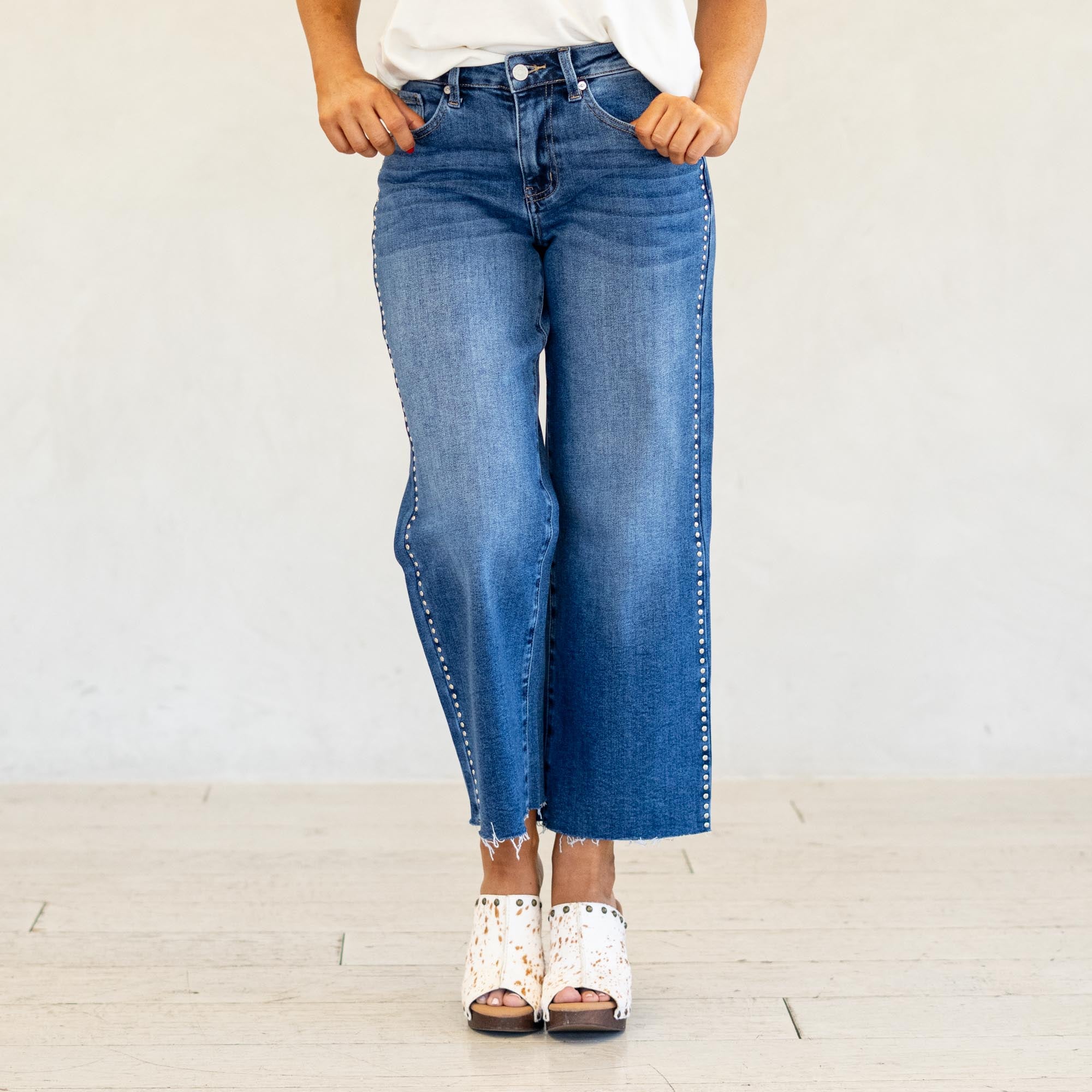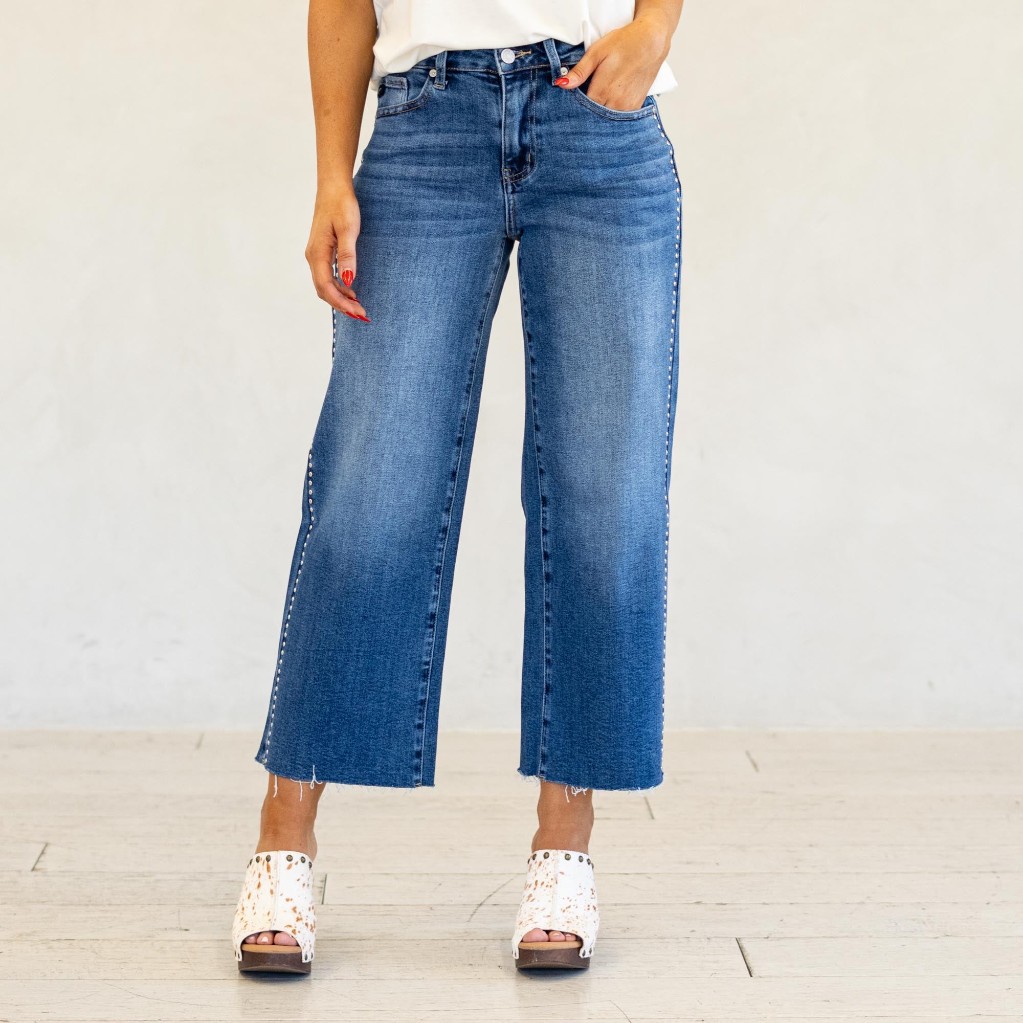 The Mailene High Rise Crop Wide Leg Jeans are where classic denim meets modern edge. Designed in a rich dark wash, this cropped silhouette sits high at the waist and flows into a wide leg that hits just above the ankle for a chic, effortless vibe.