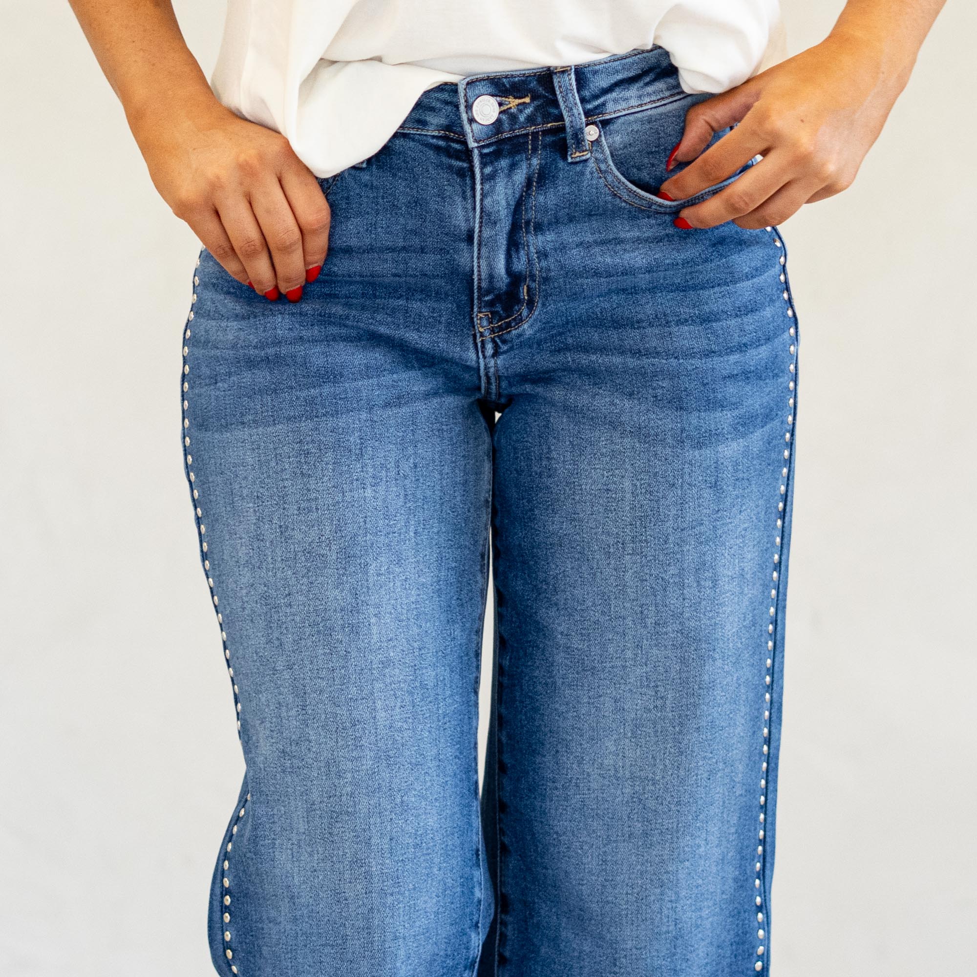 Down the side seam, 6mm flat silver studs add a subtle sparkle and elevate the look, making these jeans anything but ordinary. A scissor-cut hem gives the finish a laid-back touch, perfect for pairing with sneakers, boots, or heels depending on the occasion.