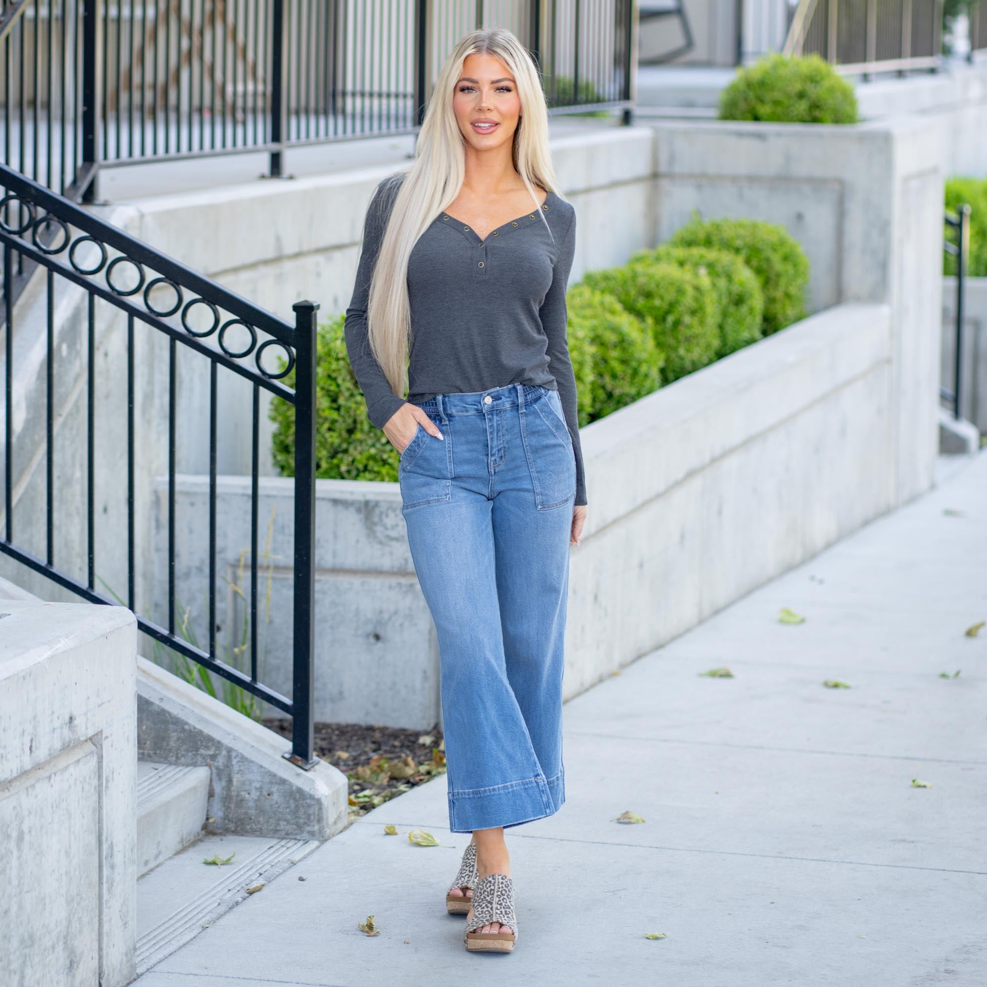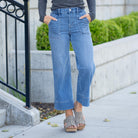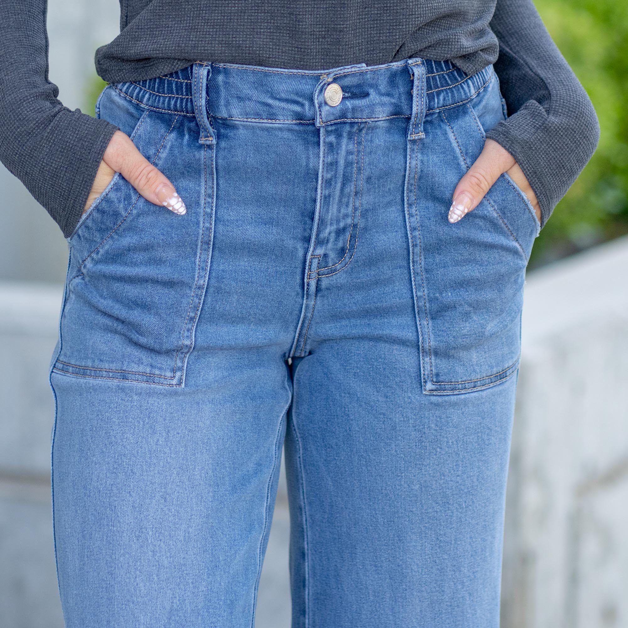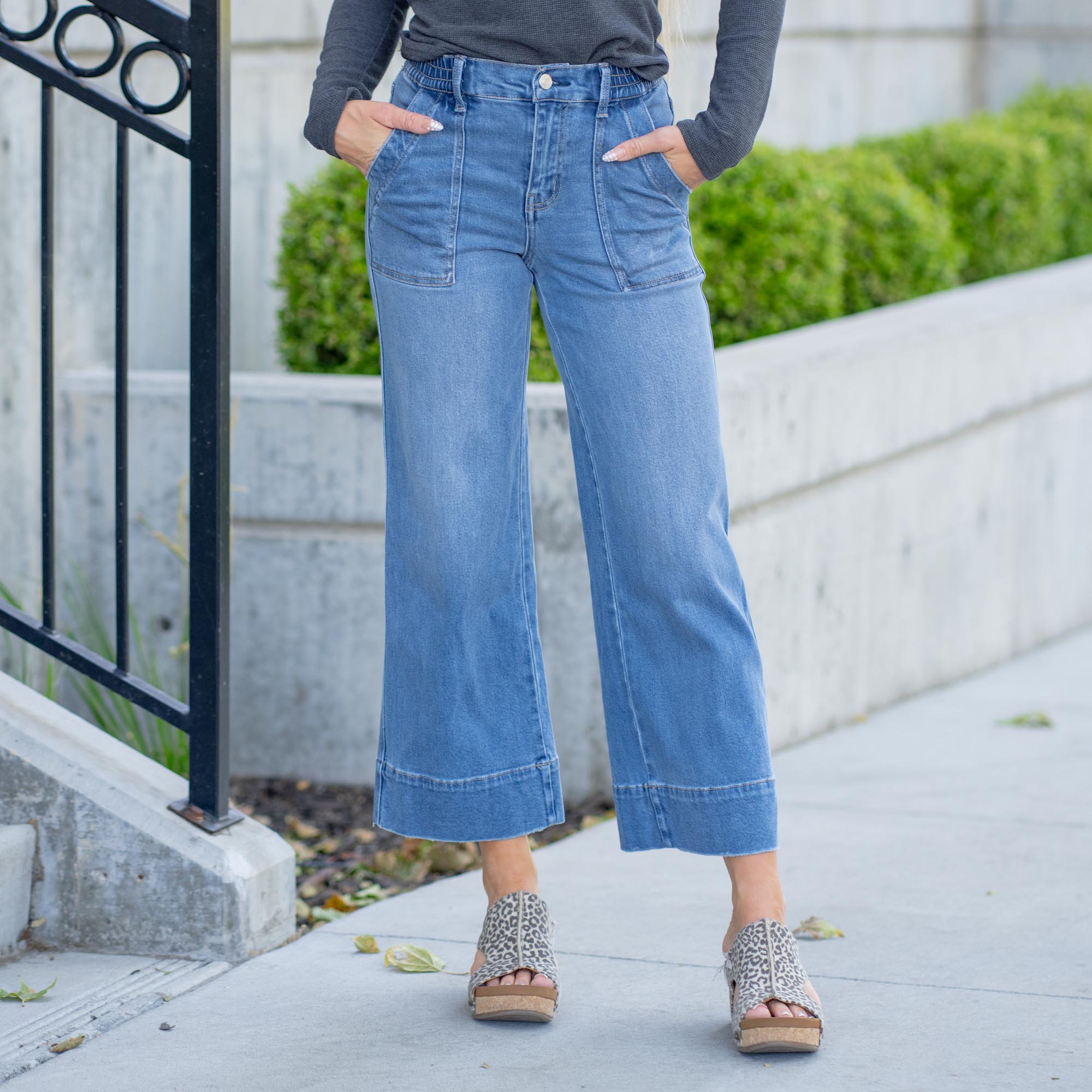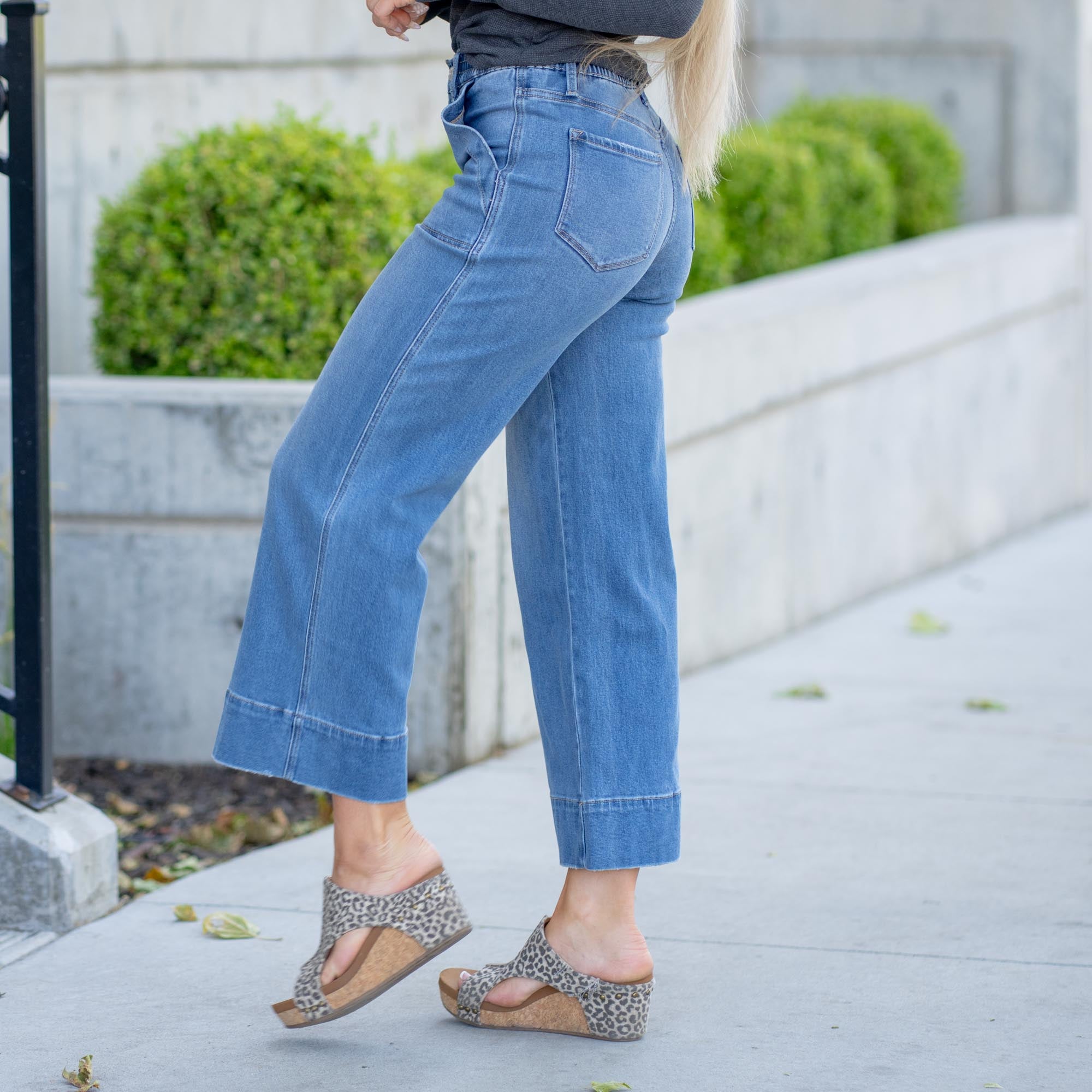 The wide-leg silhouette and cropped length create a modern, flowy shape that pairs perfectly with sneakers, sandals, or block heels. Utility-style pockets add a touch of function and detail, while the soft comfort-stretch denim moves with you and holds its shape all day long.