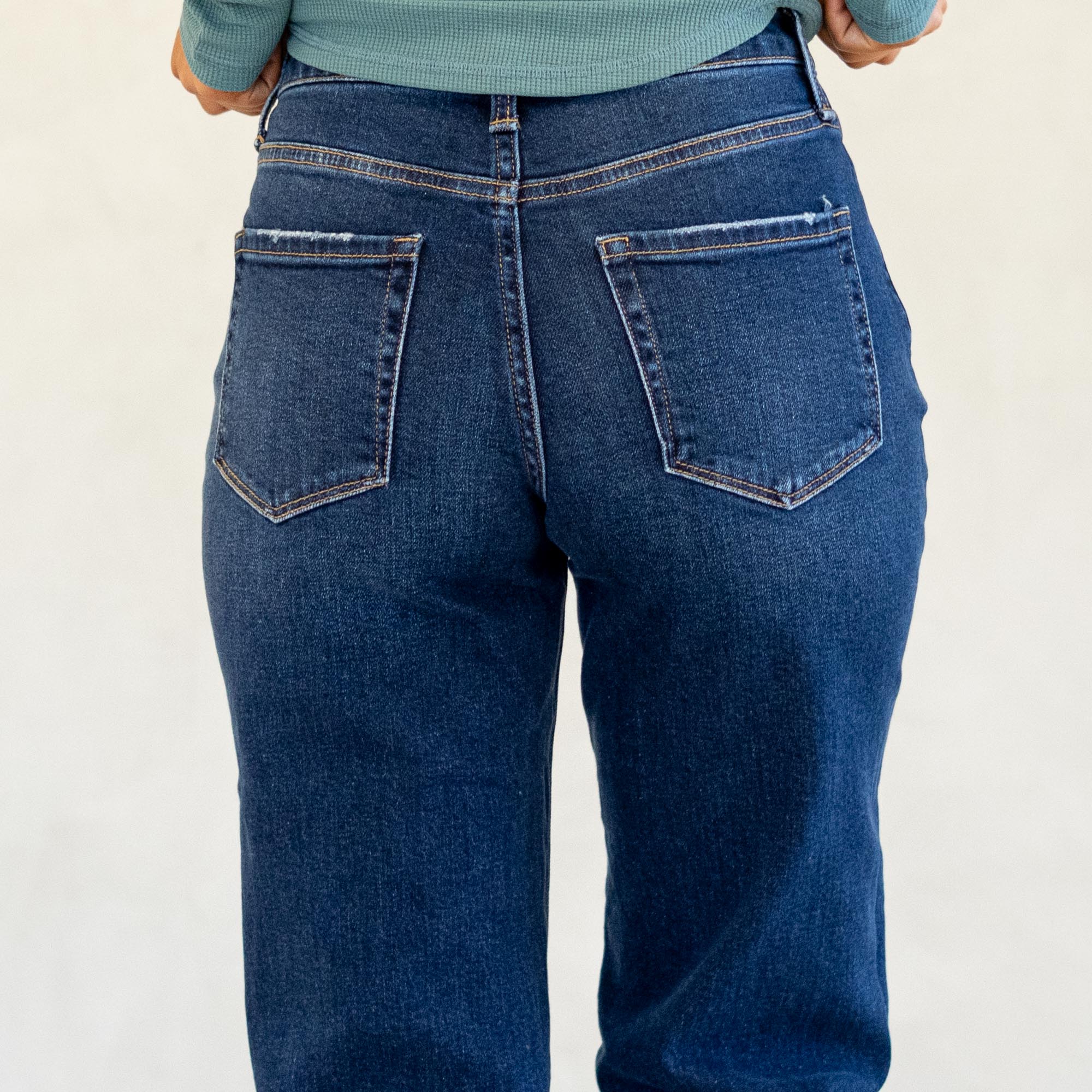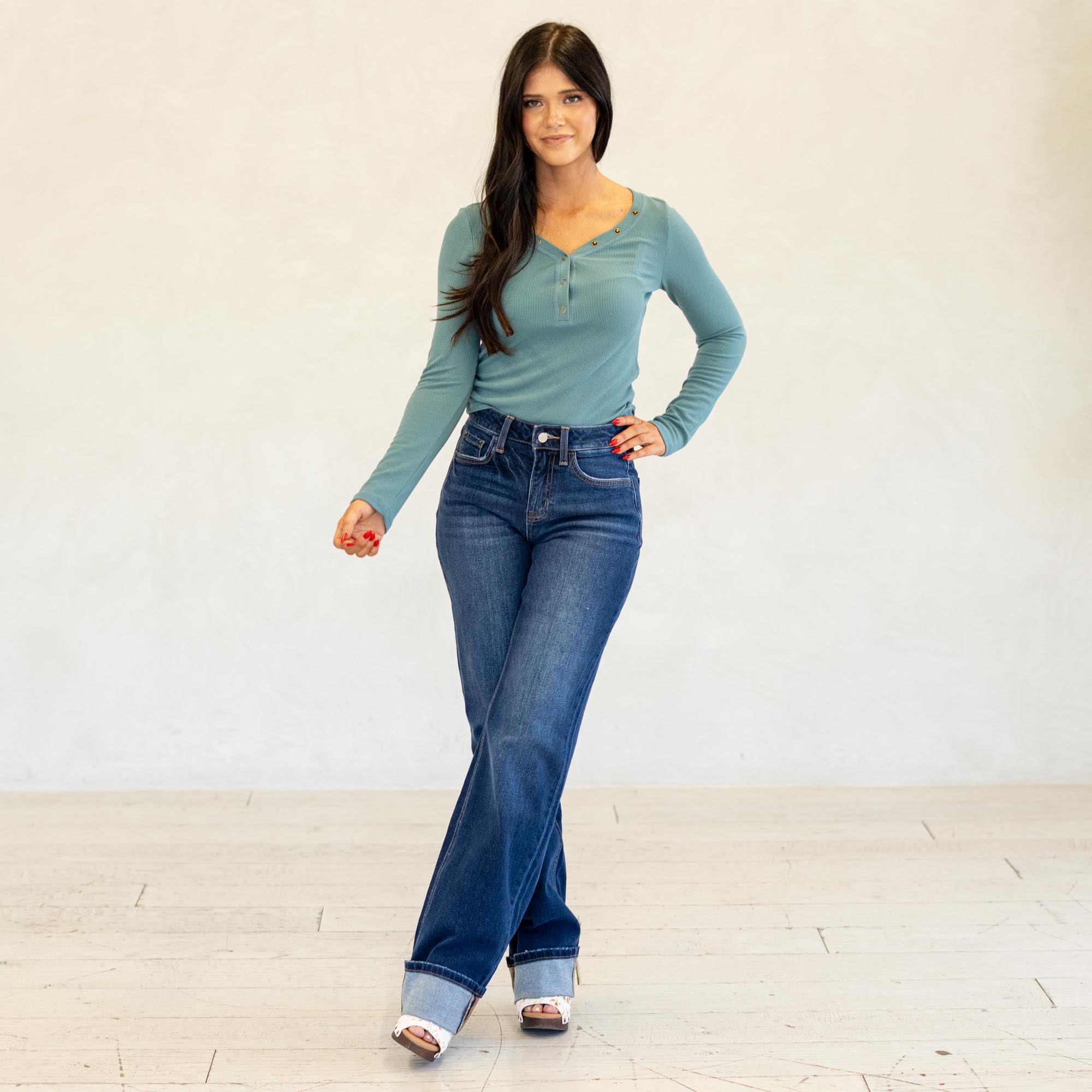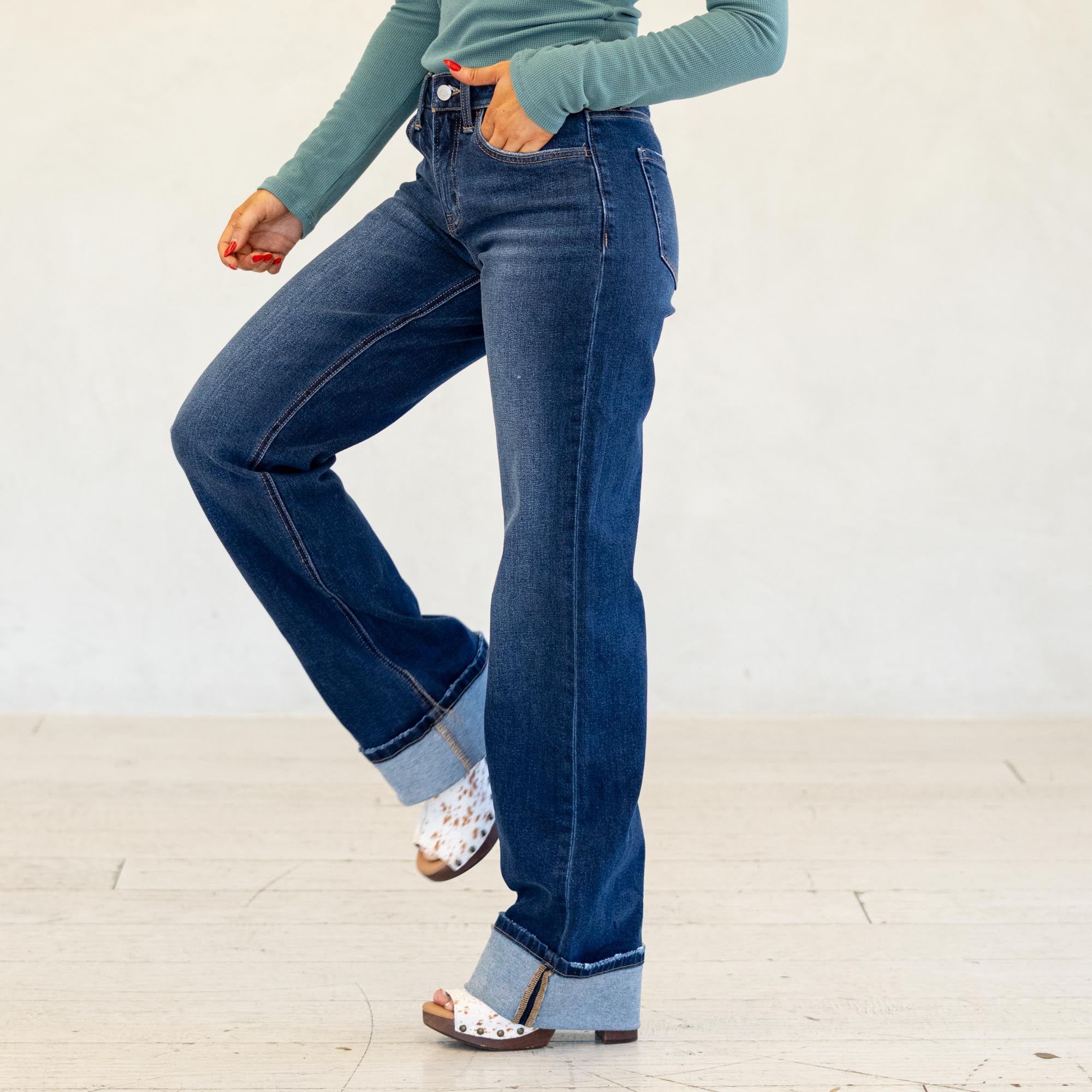 The Midnight Ease High Rise Cuffed Wide Leg Jeans are the definition of sleek sophistication. Crafted from comfort stretch denim in a rich dark wash, these jeans combine structure and flexibility for an effortlessly flattering fit. The high-rise waist enhances your silhouette, while the single cuff hem and wide-leg design create a timeless, elongating look. Featuring a classic five-pocket style and clean finish, these jeans are perfect for dressing up with heels or keeping it casual with sneakers.