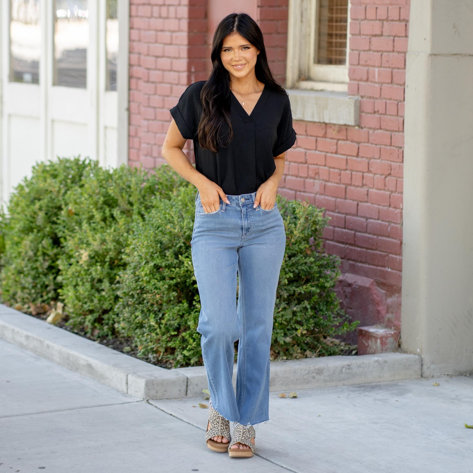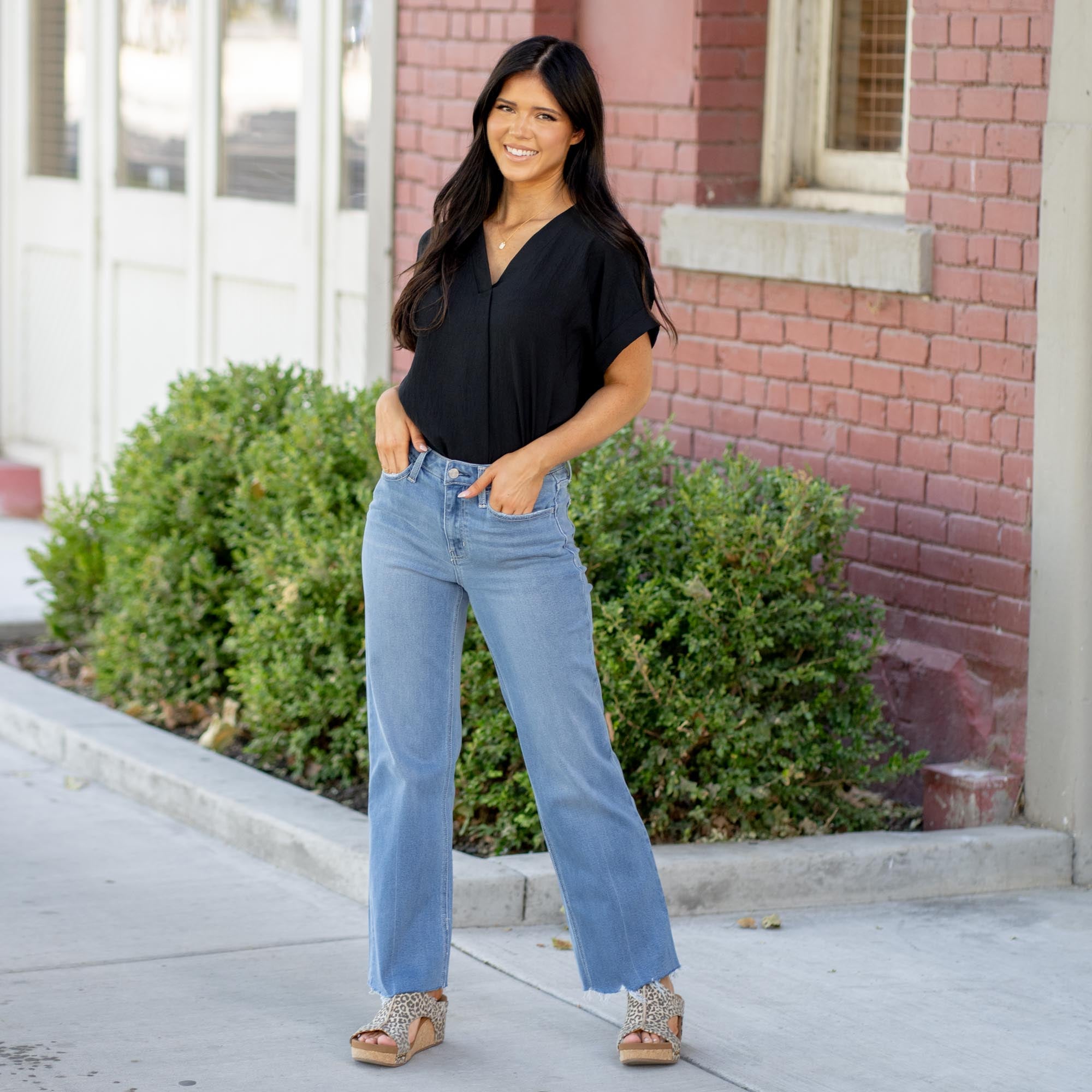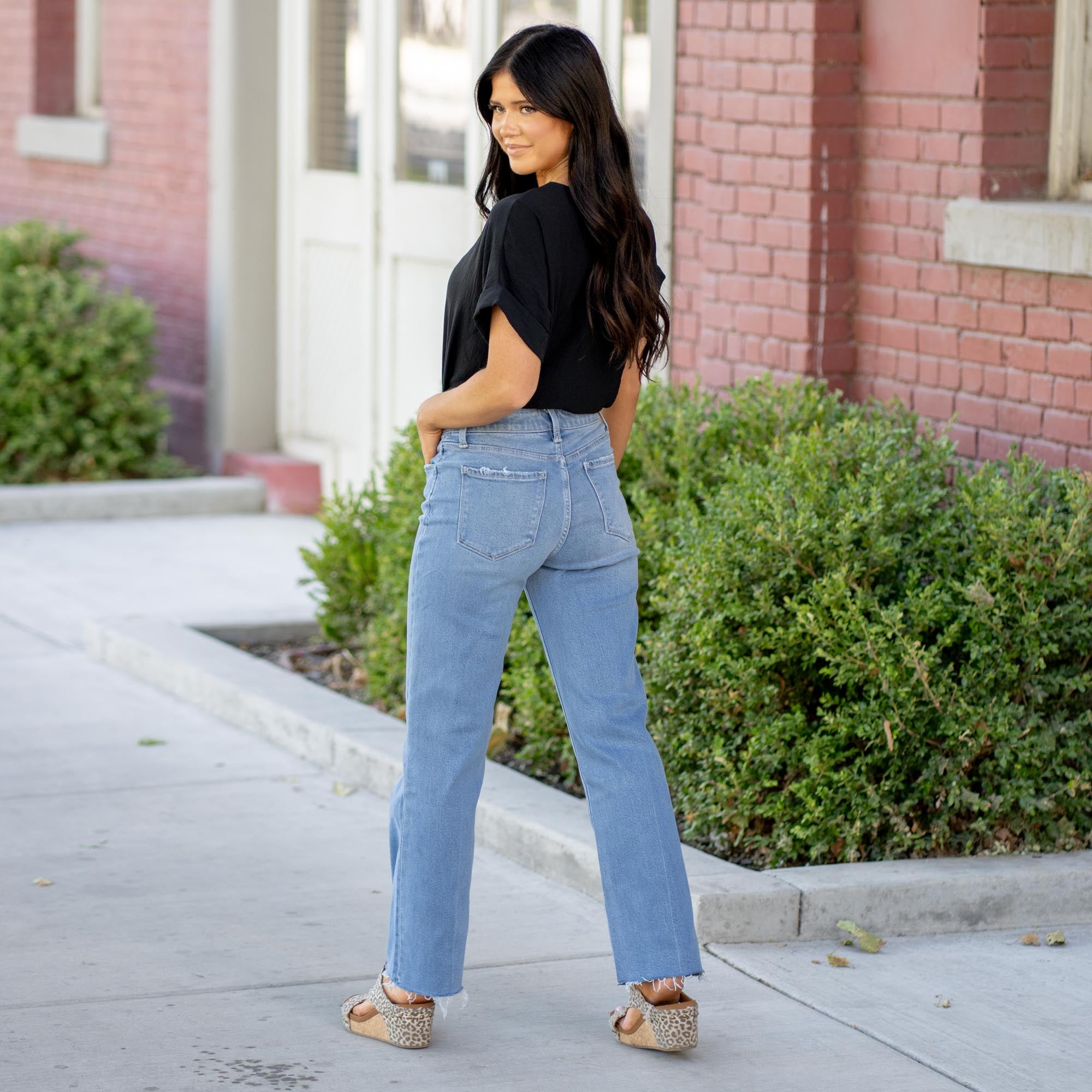 Step into sleek confidence with the Sharpest High Rise Slim Wide Leg Jeans from VERVET. Designed in a versatile medium blue wash, this pair combines the structured appeal of a straight silhouette with the ease of a wide leg. Sitting high on the waist, they elongate your figure and create a flattering, fashion-forward shape.