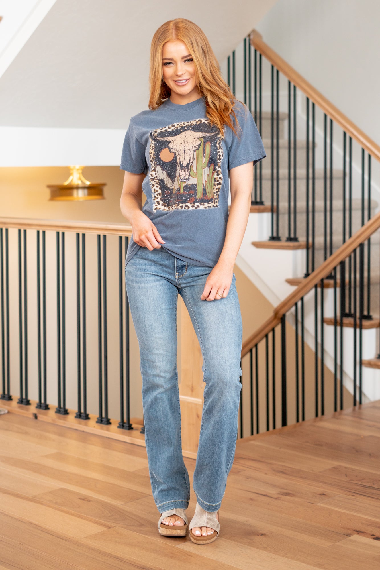 Leopard Bull Skull Graphic - Denim Blue T-Shirt