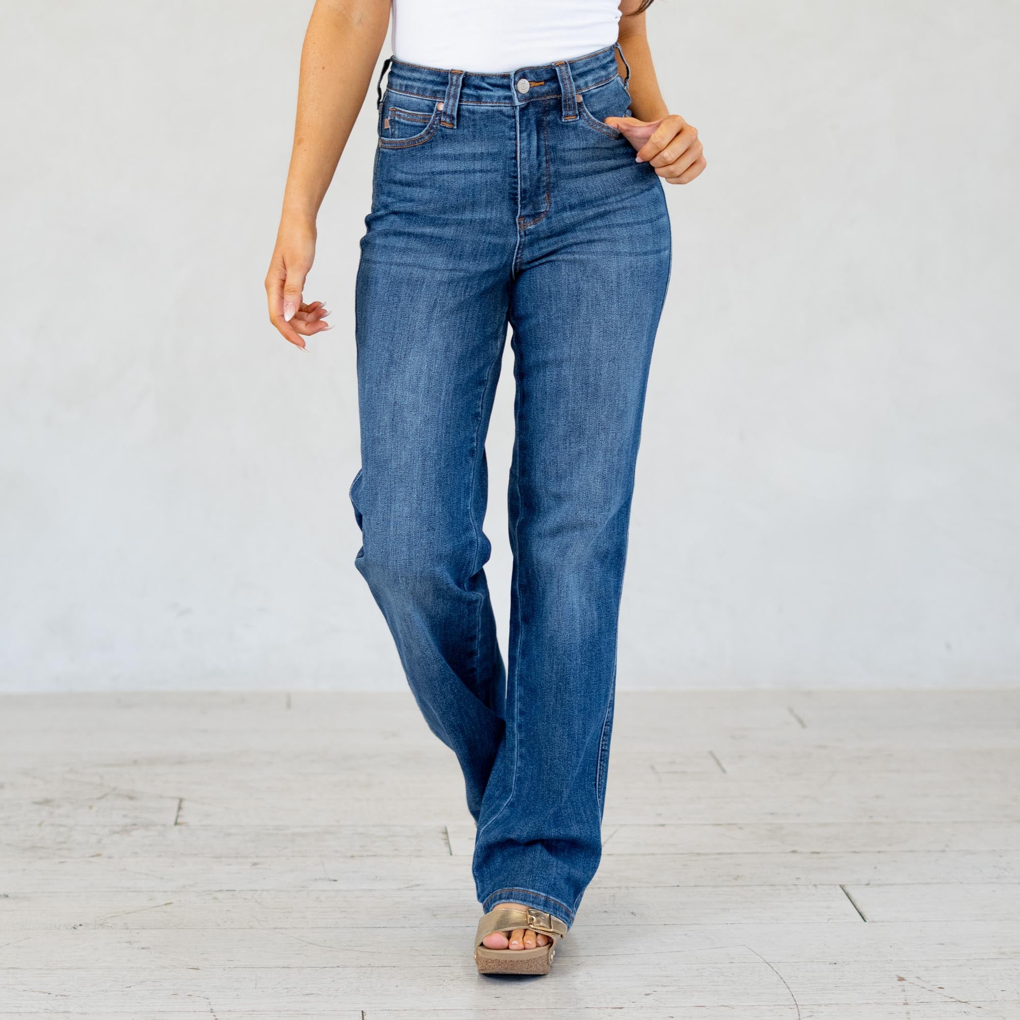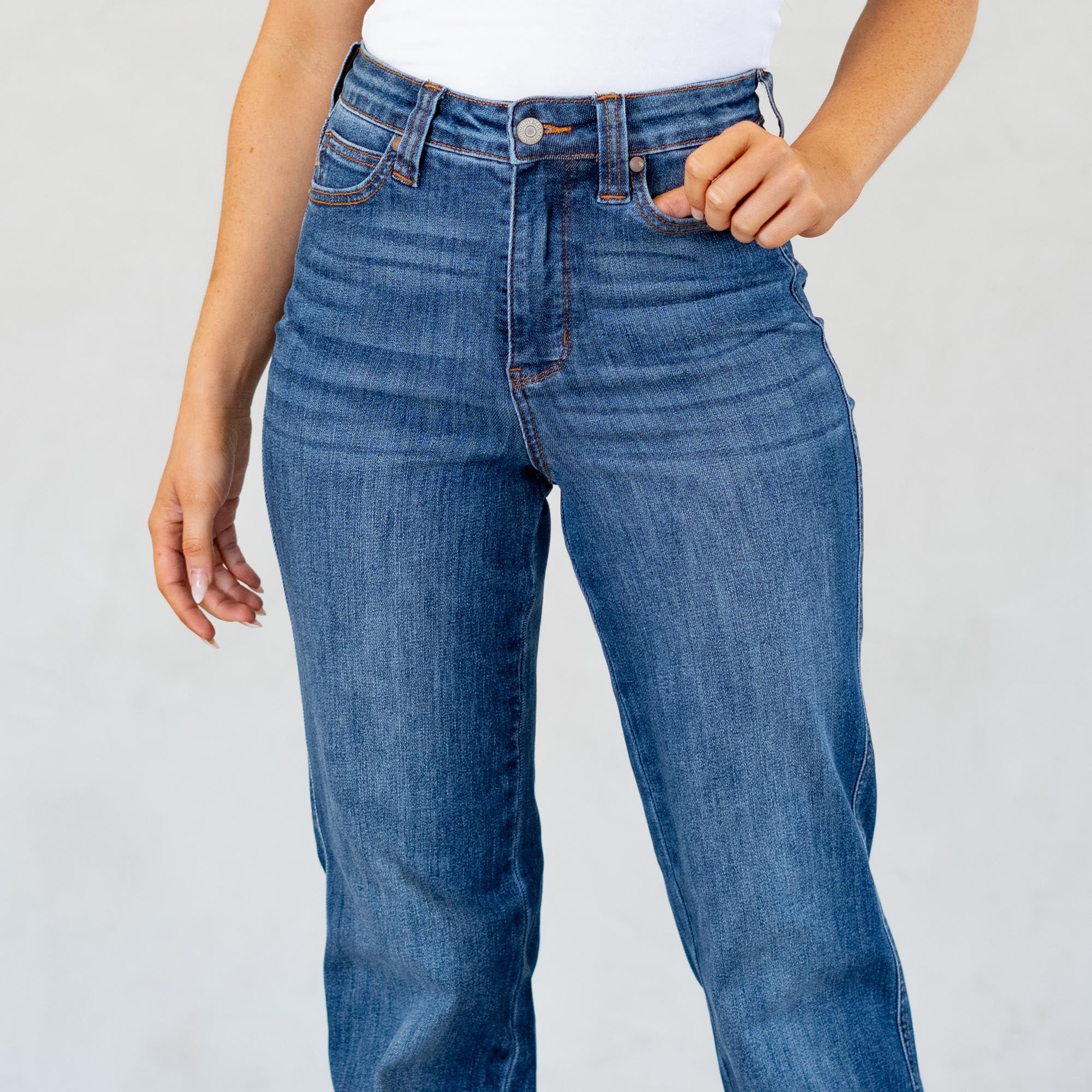 Judy Blue jeans and shorts are made to move with you. Designed with stretch, structure, and curve-hugging comfort, they flatter every shape. Most shoppers size down one full size in stretchy styles, and many plus-size shoppers love the flex and recovery built into every pair.