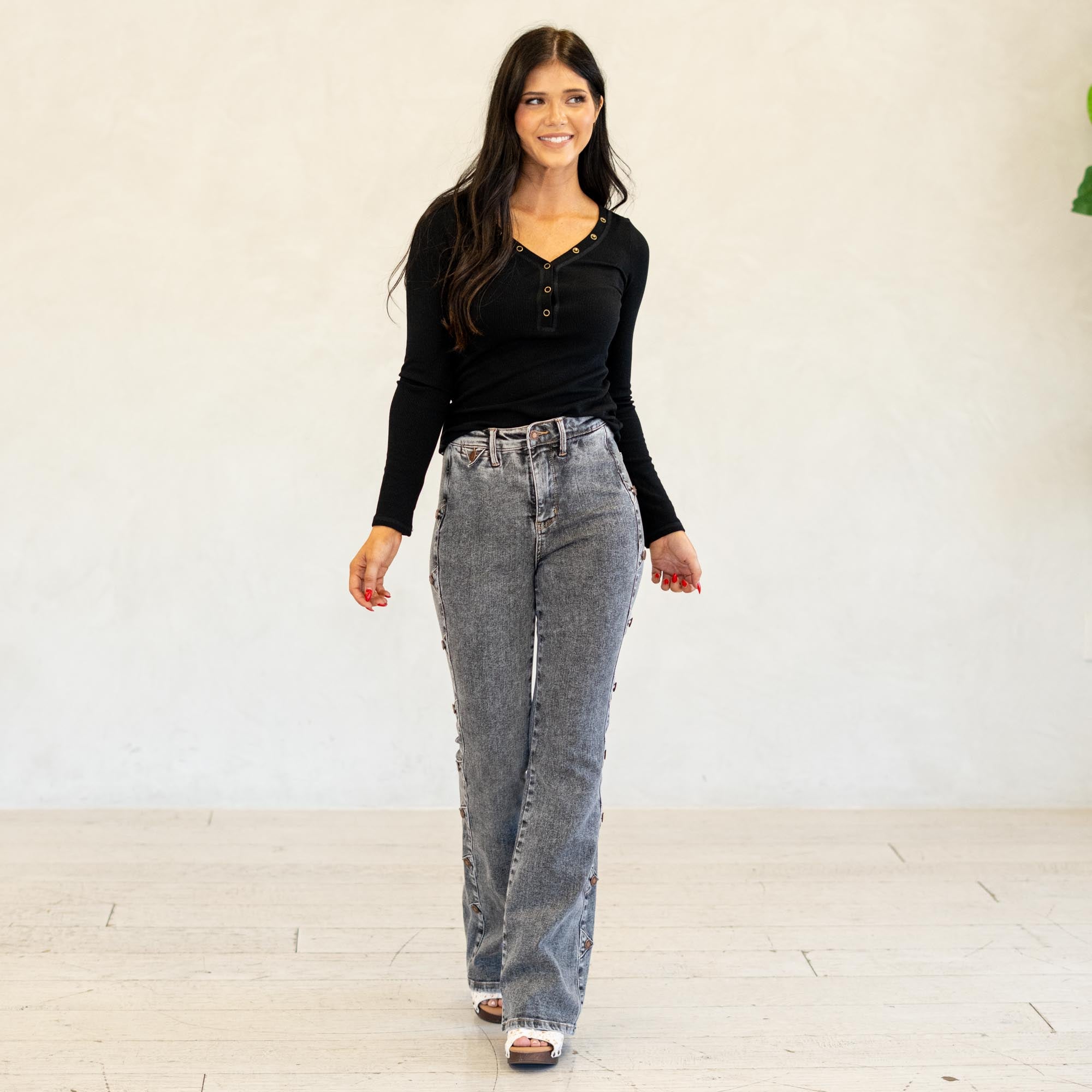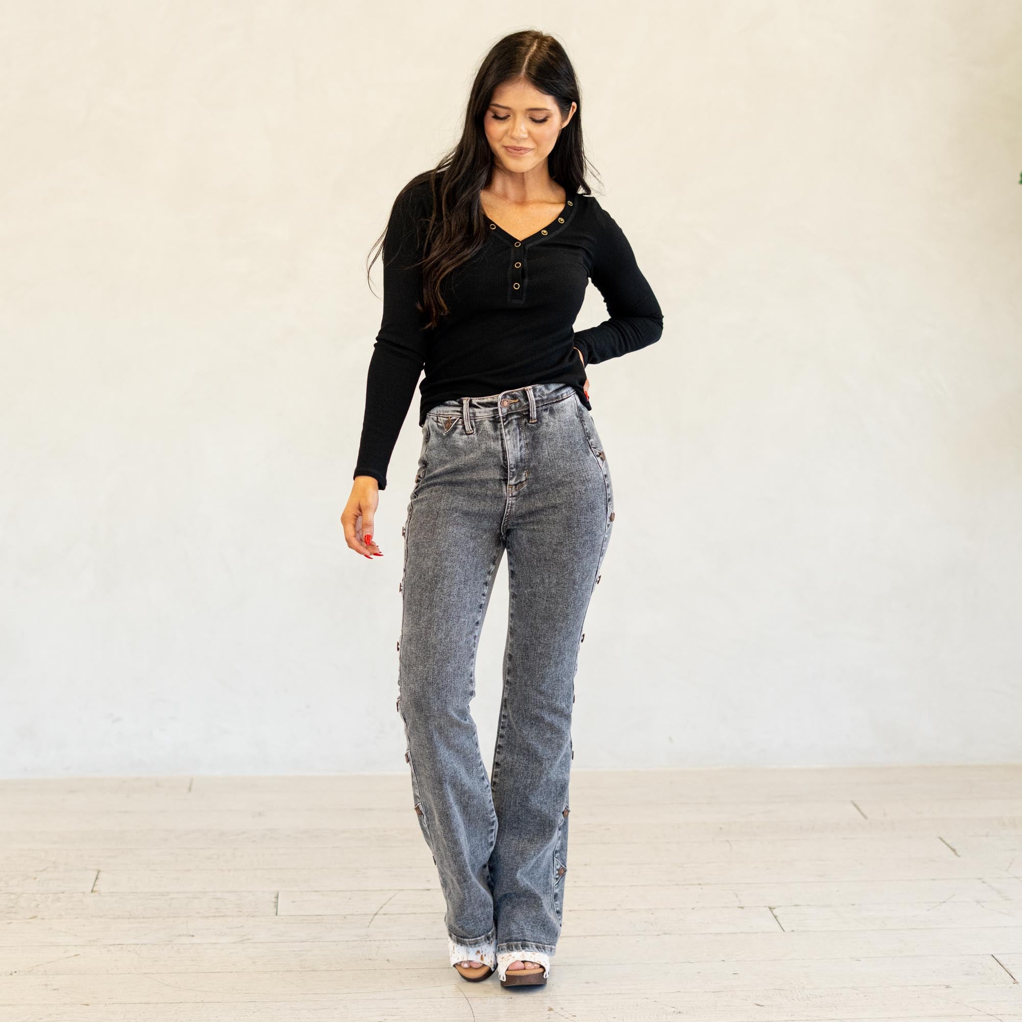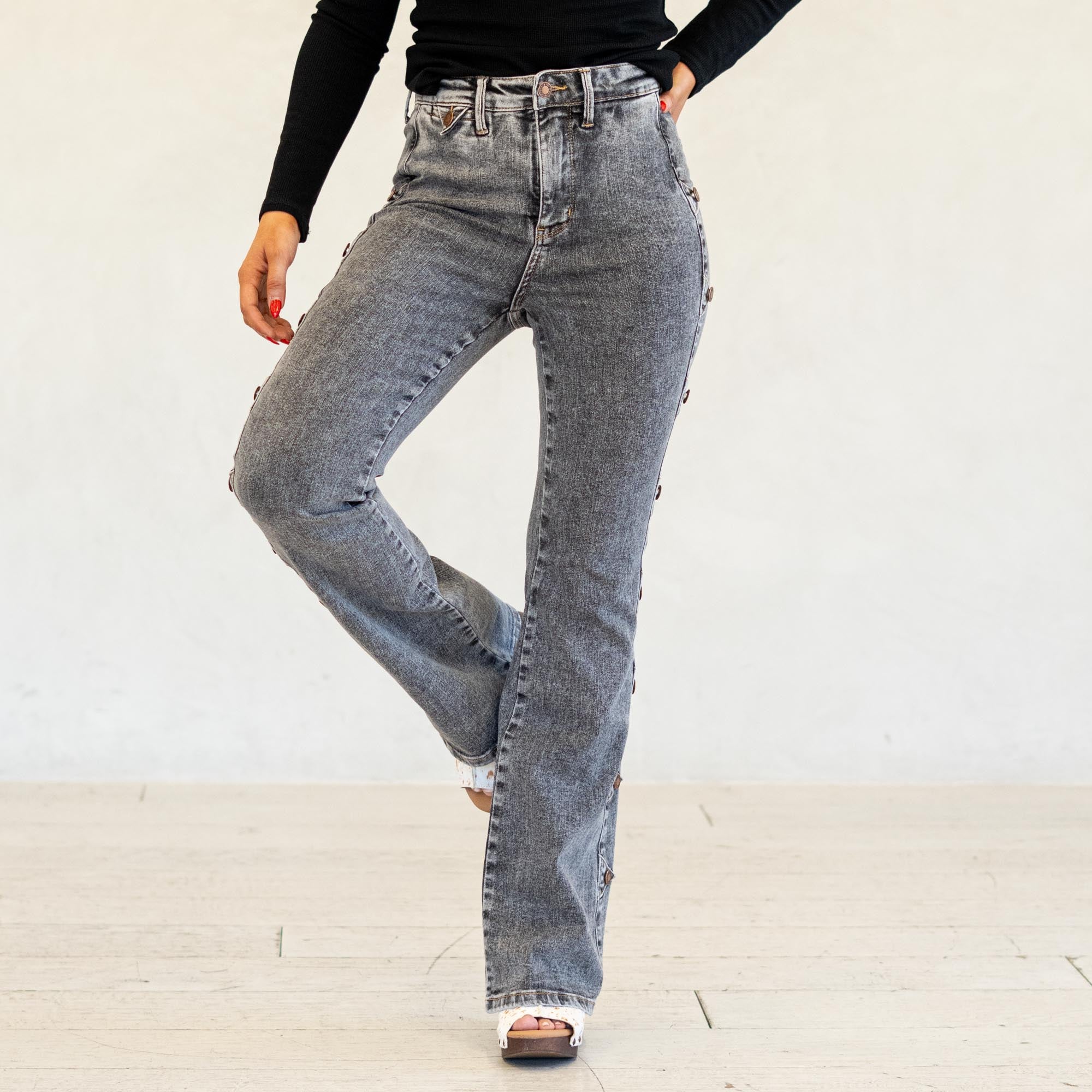 Meet your new go-to grey denim with a western-inspired twist. These high-waist bootcut Judy Blues feature eye-catching side seam detailing and a unique coin pocket that adds just the right amount of edge. Crafted with Judy Blue’s signature stretch, they hug in all the right places while keeping you comfortable all day long. Style them with boots or sneakers for an effortlessly cool, wear-anywhere look.
