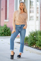 Cas is 5'7" and wears a size 25 in jeans, a small in tops, and 8 in shoes. She is wearing size 25 in these jeans.