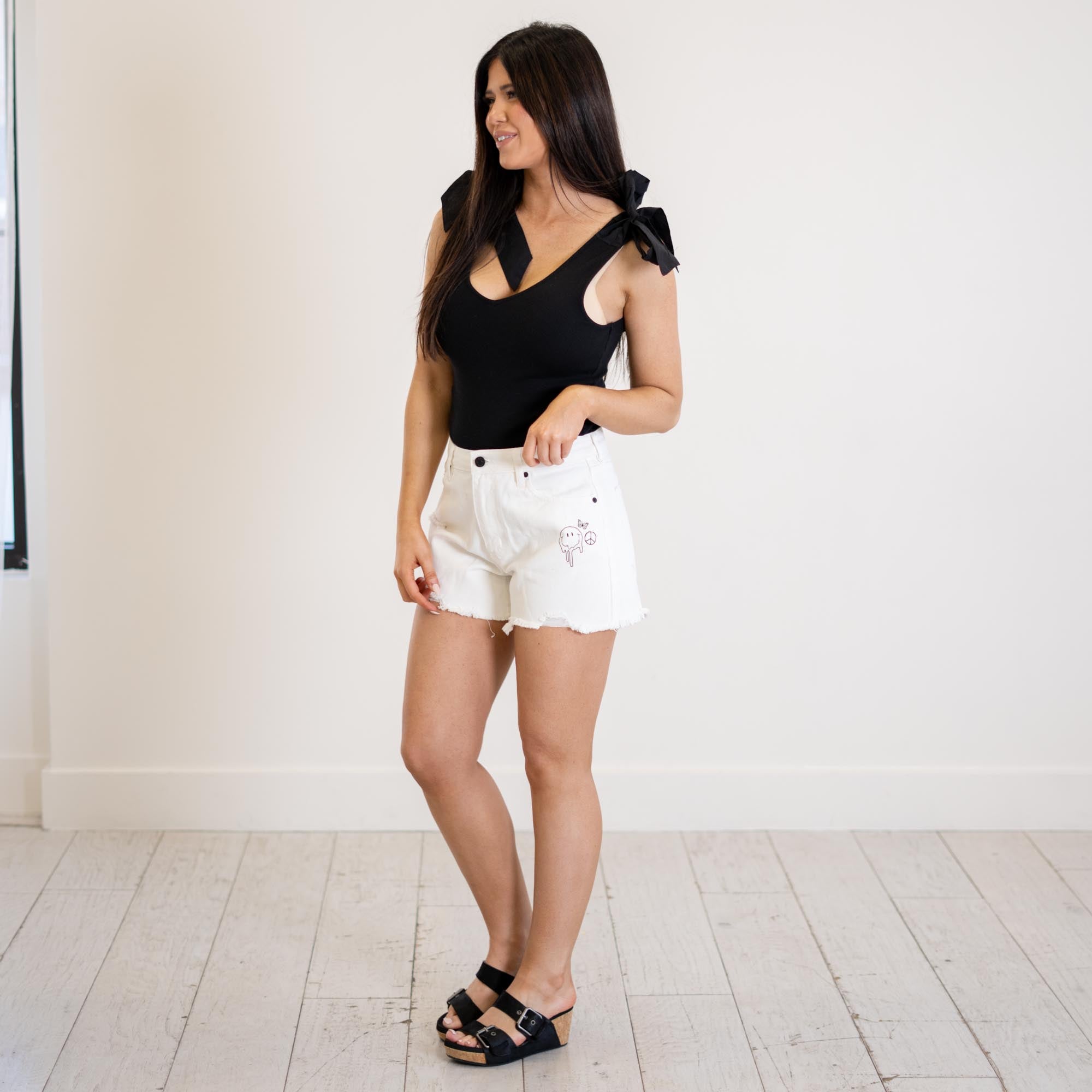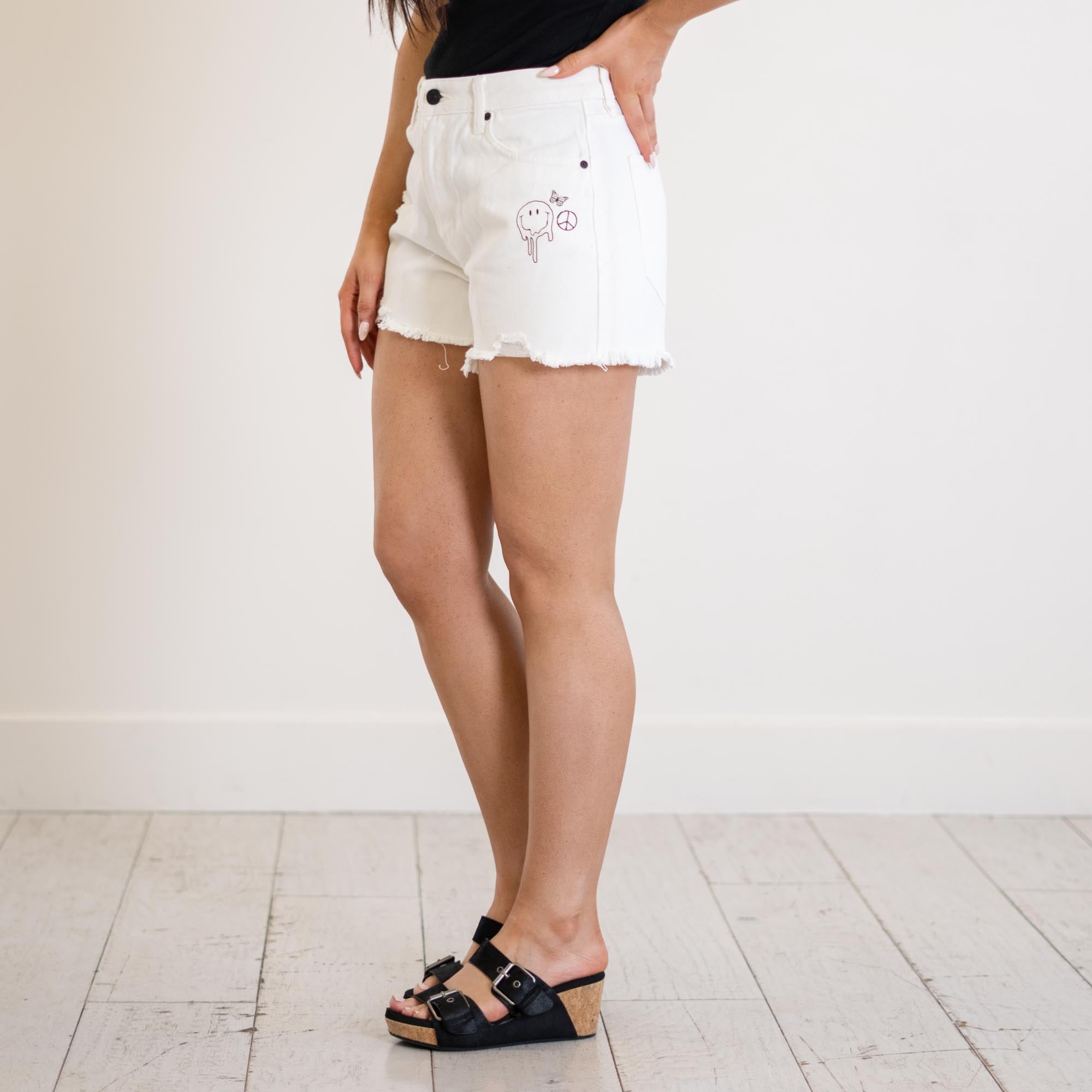 Make a statement with every step. These white high-rise shorts bring a bold, Y2K-inspired edge with playful ink splatter details featuring butterflies, smiley faces, and “self-love” graphics.