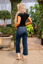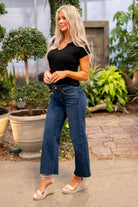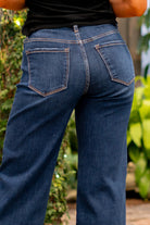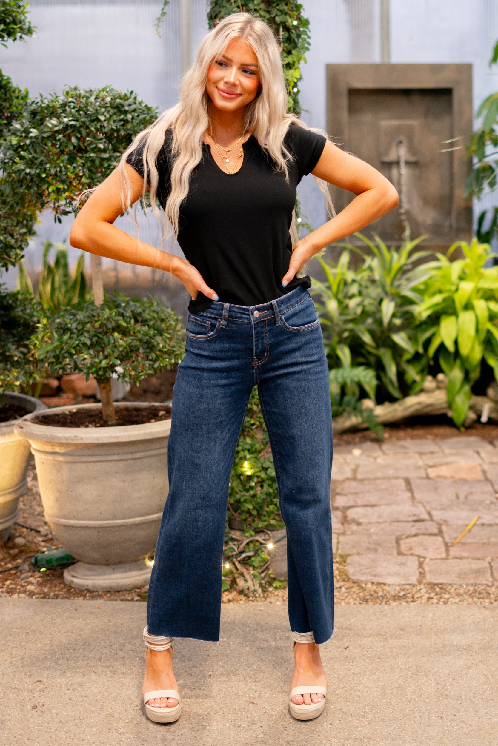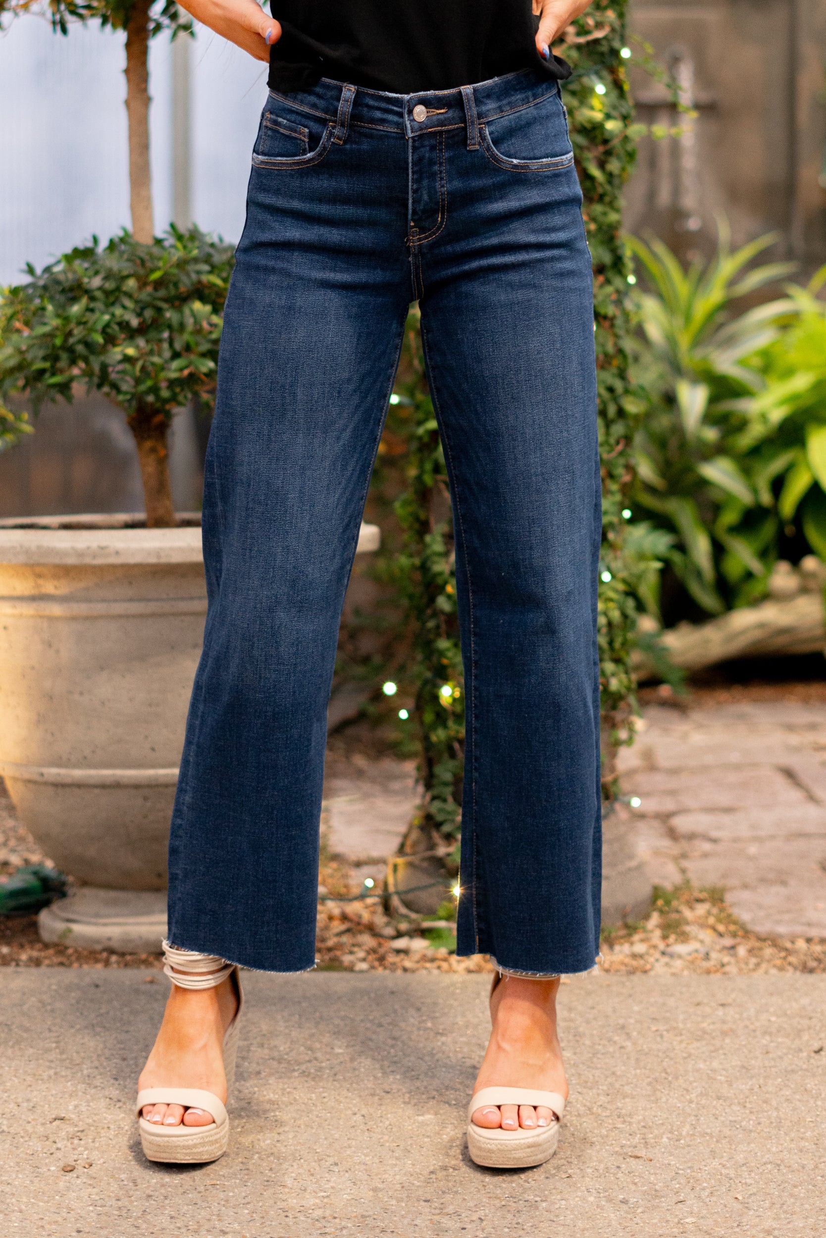 Introducing our Tummy Control Top High Rise Wide Leg jeans, designed to provide both style and comfort. These jeans feature a high-rise waist with a tummy control top for a flattering fit, paired with a wide-leg silhouette for a trendy and relaxed look. Crafted in a dark wash denim with slight distressing and a released hem, these jeans add a touch of casual charm to any outfit.