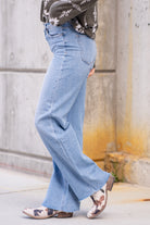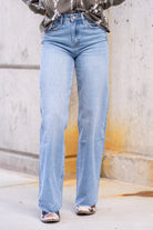 These jeans feature a high waist with a button fly and loose-fitted legs.