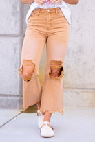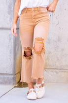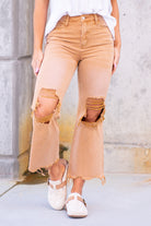 These jeans feature a high waist with a cropped flare bottom and distressed legs in a vintage dark khaki wash in a non stretch denim.