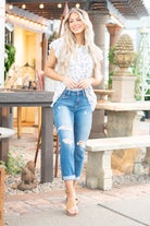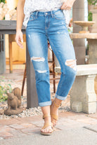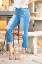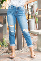 These comfortable stretchy mom jeans have a slouchy fit, slight distressing, relaxed legs and a high waist.