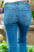 On-trend high rise mom skinny jeans in a medium denim wash with a destruction detail and frayed hem. Additionally equipped with five pockets, belt loops and a zip fly closure.
