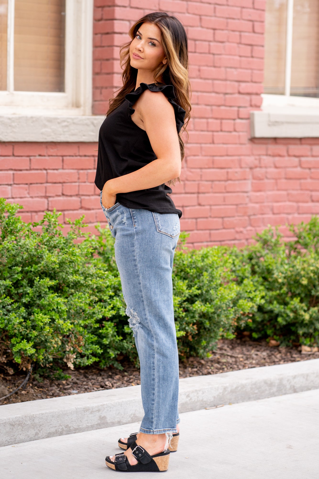 These jeans have a high-rise fit, which means they sit at the waist and provide good coverage and support. The boyfriend style of these jeans is relaxed and slightly slouchy, giving them a laid-back and casual vibe. Whether dressed up or down, these jeans are sure to make a statement and add personality to your outfit.