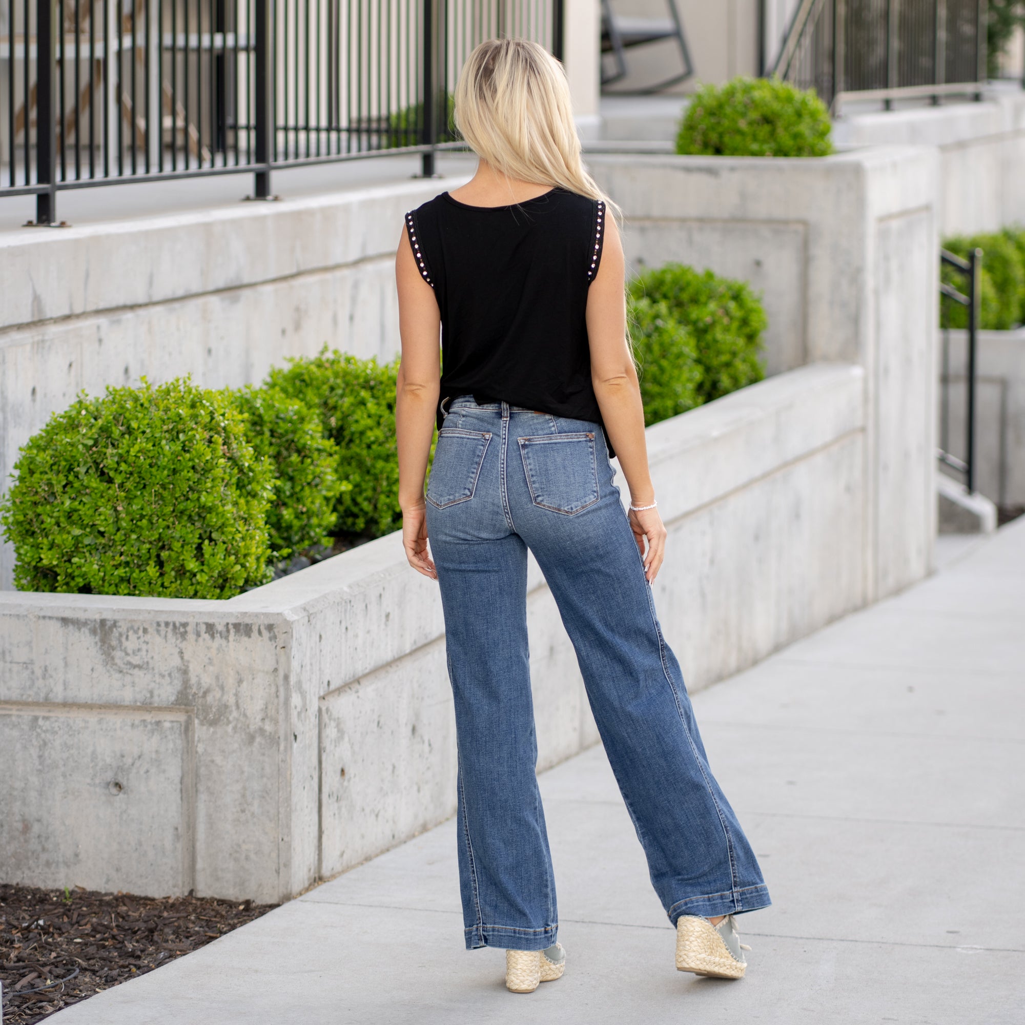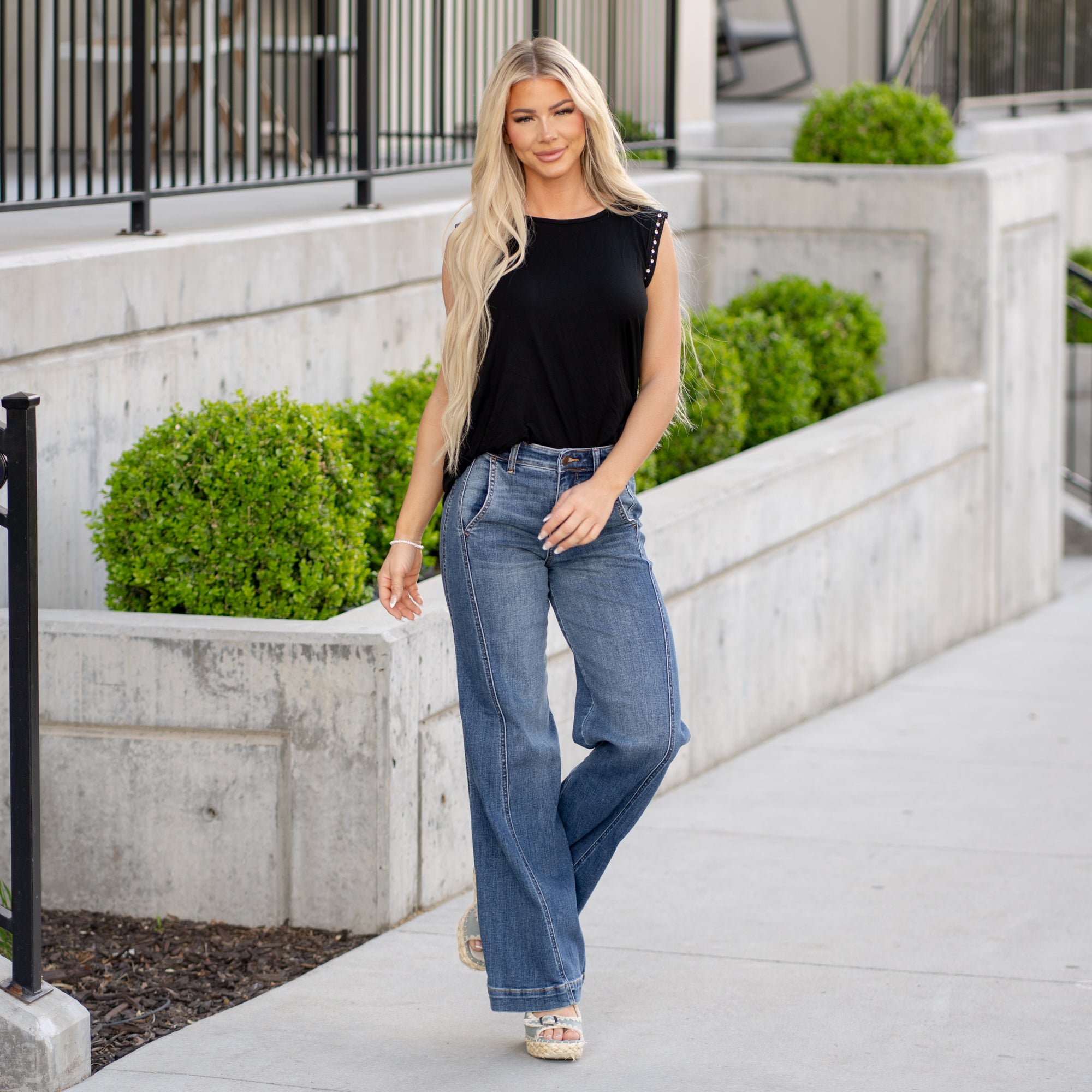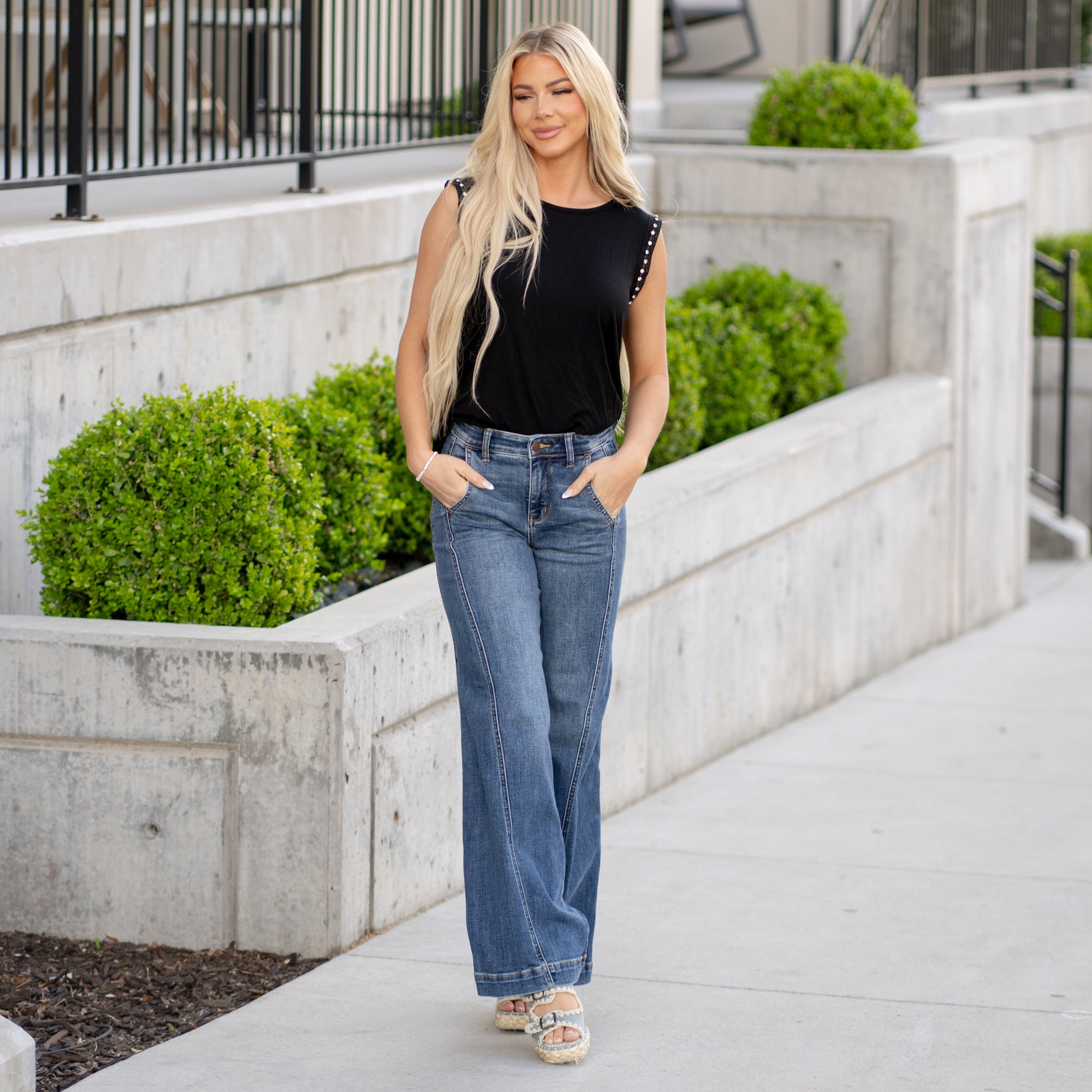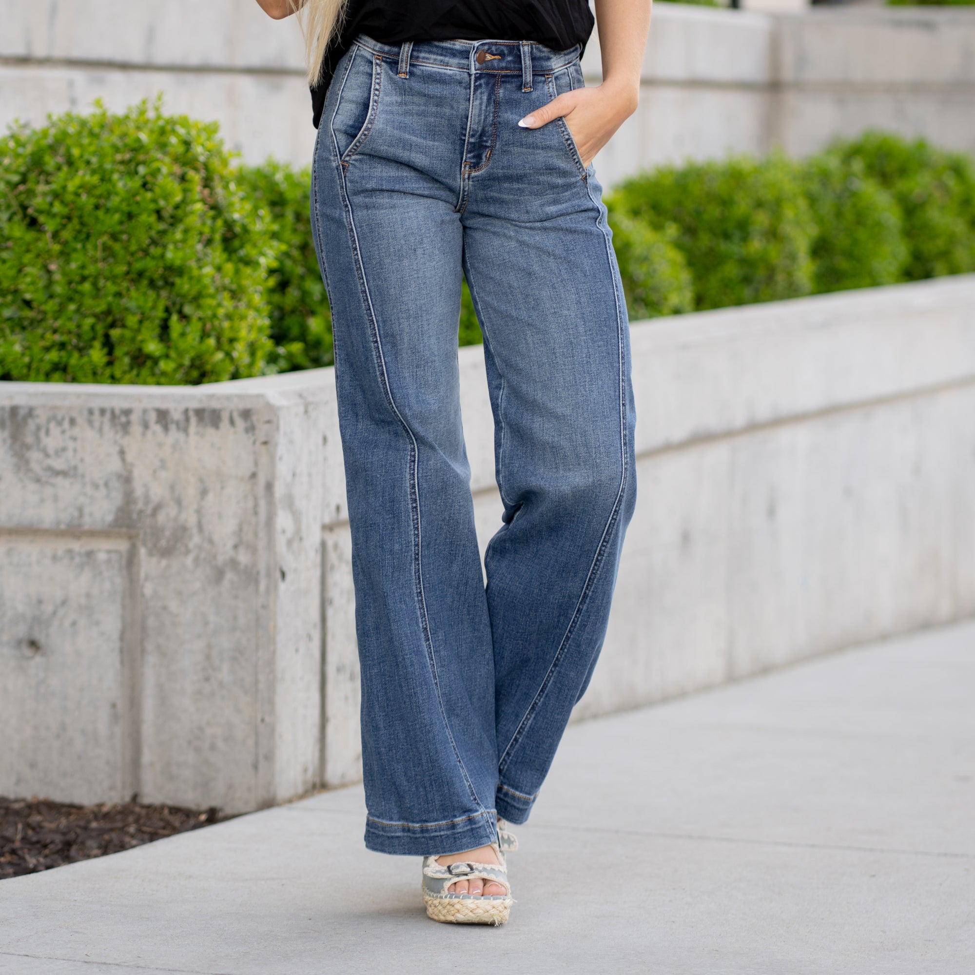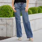 Polished and comfy? Yes, please. The Boardroom Babe Wide Leg Jeans by Judy Blue bring a structured trouser vibe with all the stretch you know and love. Featuring a flattering high rise, dark wash, and wide leg silhouette, these jeans give you that dressed-up look with none of the effort. Perfect for workdays, weekends, and everything in between.