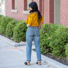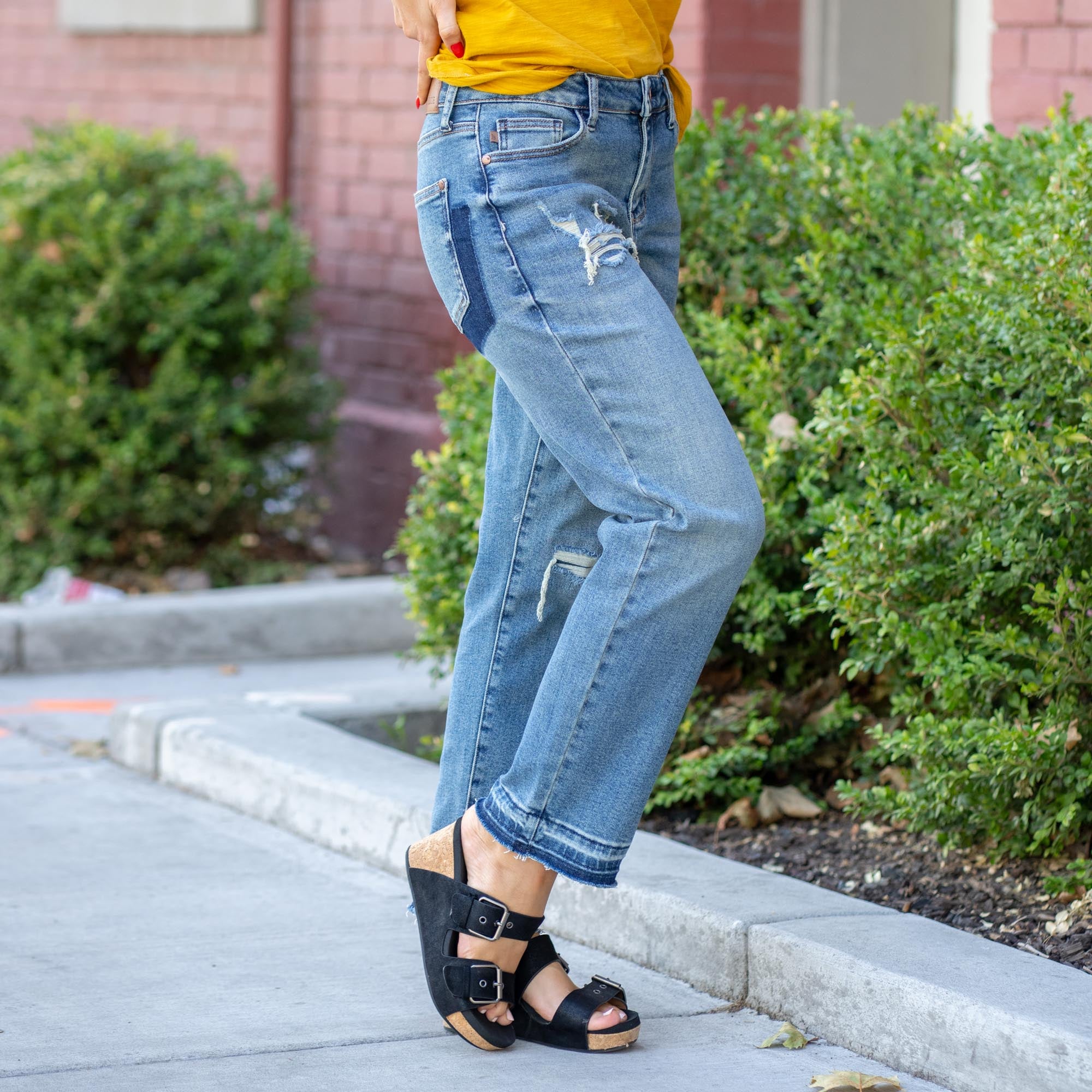The patch-and-repair details add just the right amount of personality, giving you a unique, lived-in vibe without feeling overdone. And that released hem? Total cool-girl energy. Whether you’re running errands in sneakers or dressing them up with a strappy heel, these jeans are all about effortless chic with a touch of edge.