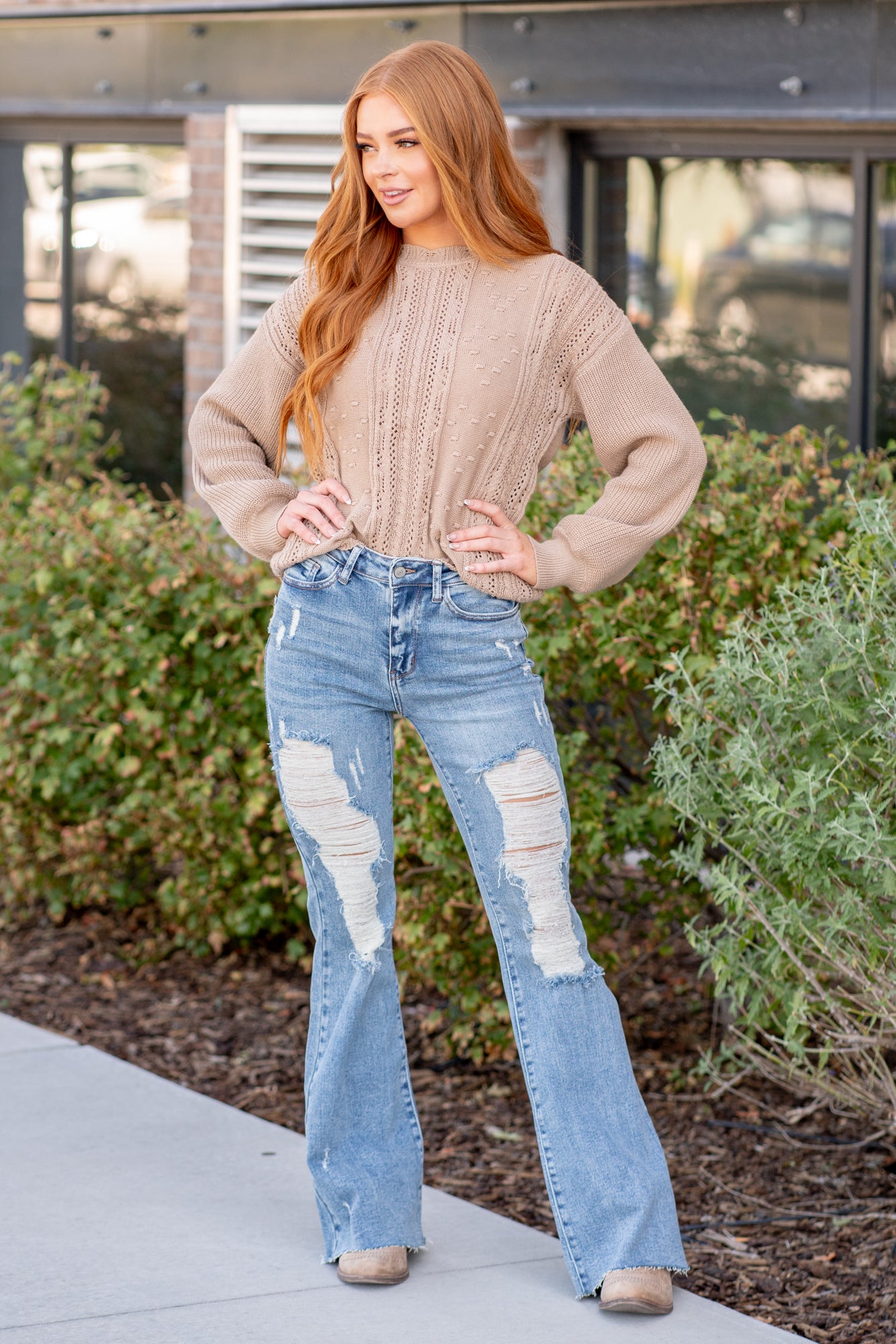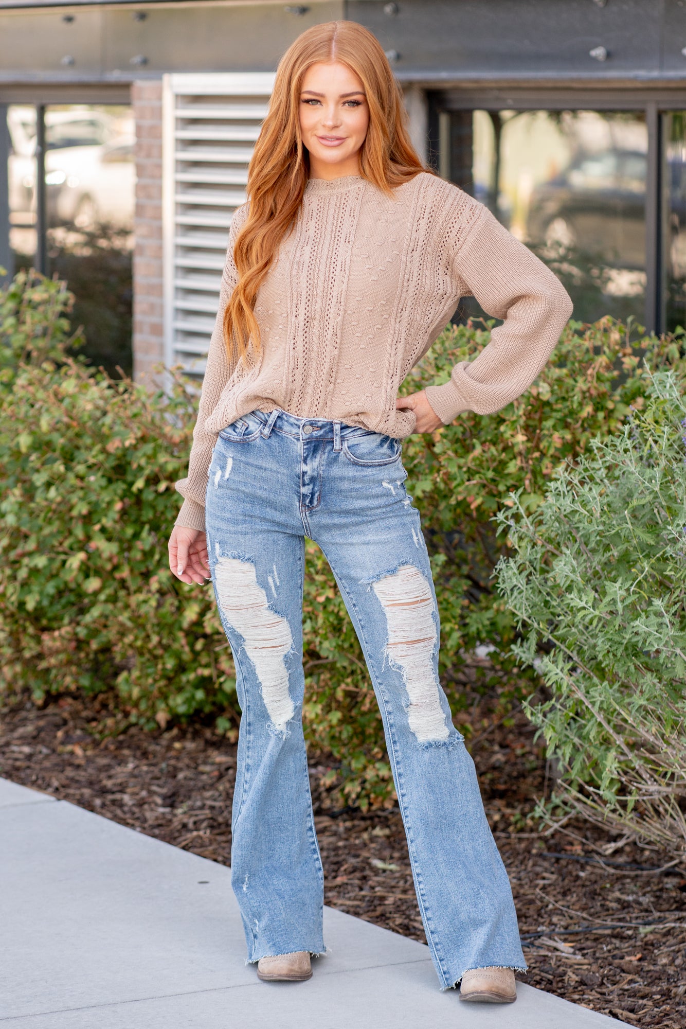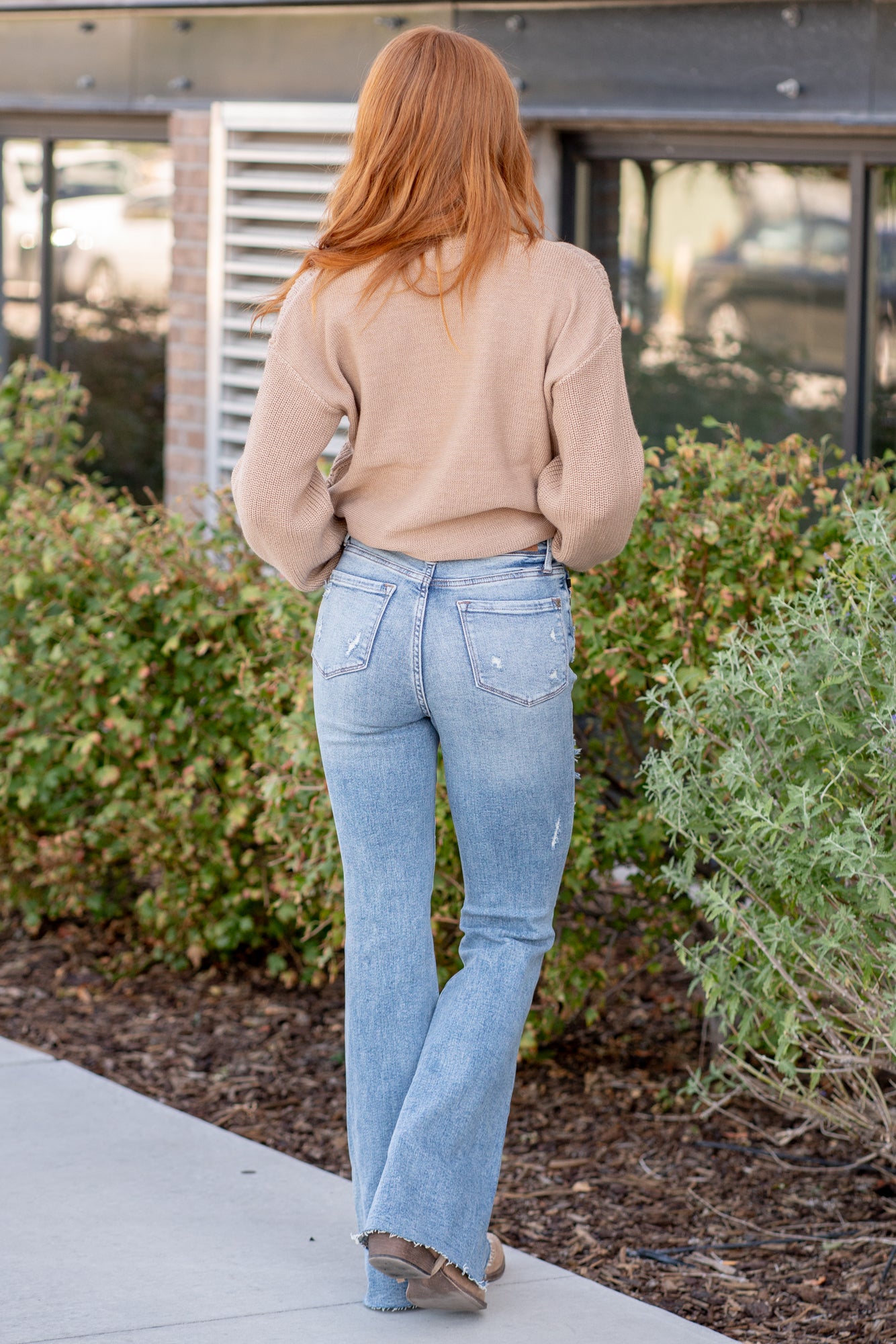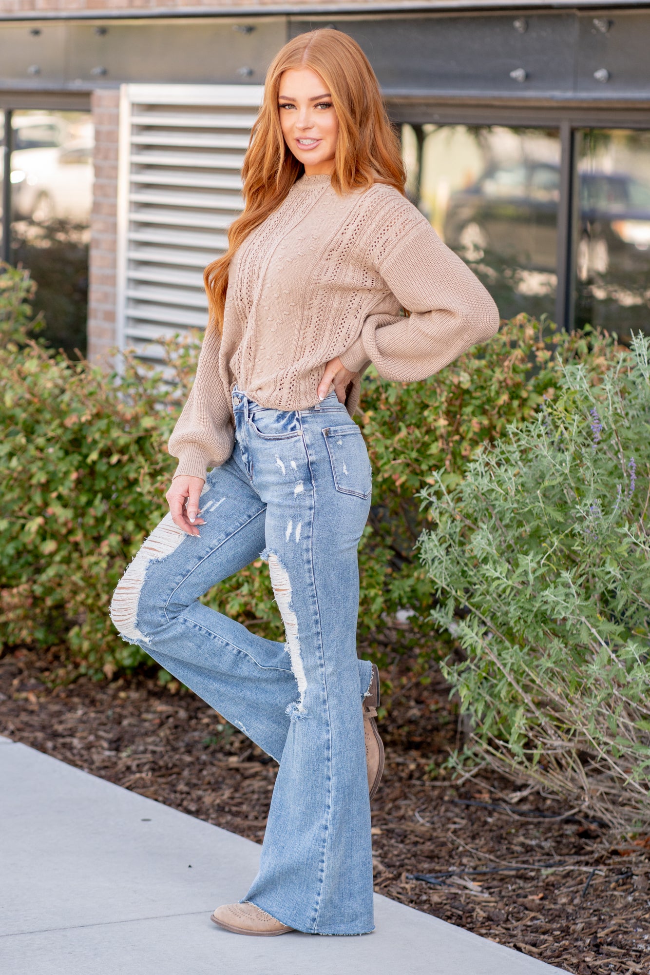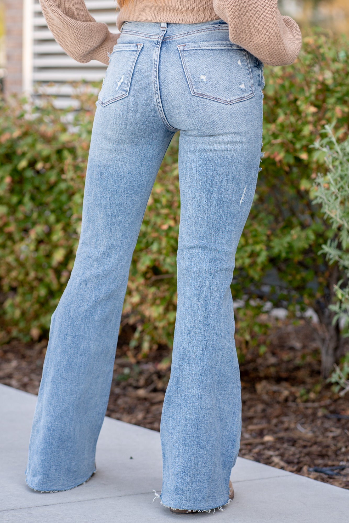 Don't be afraid to wear high-waisted jeans, especially these cute distressed flares. With a medium blue wash, these will be your favorite denim to dress up.