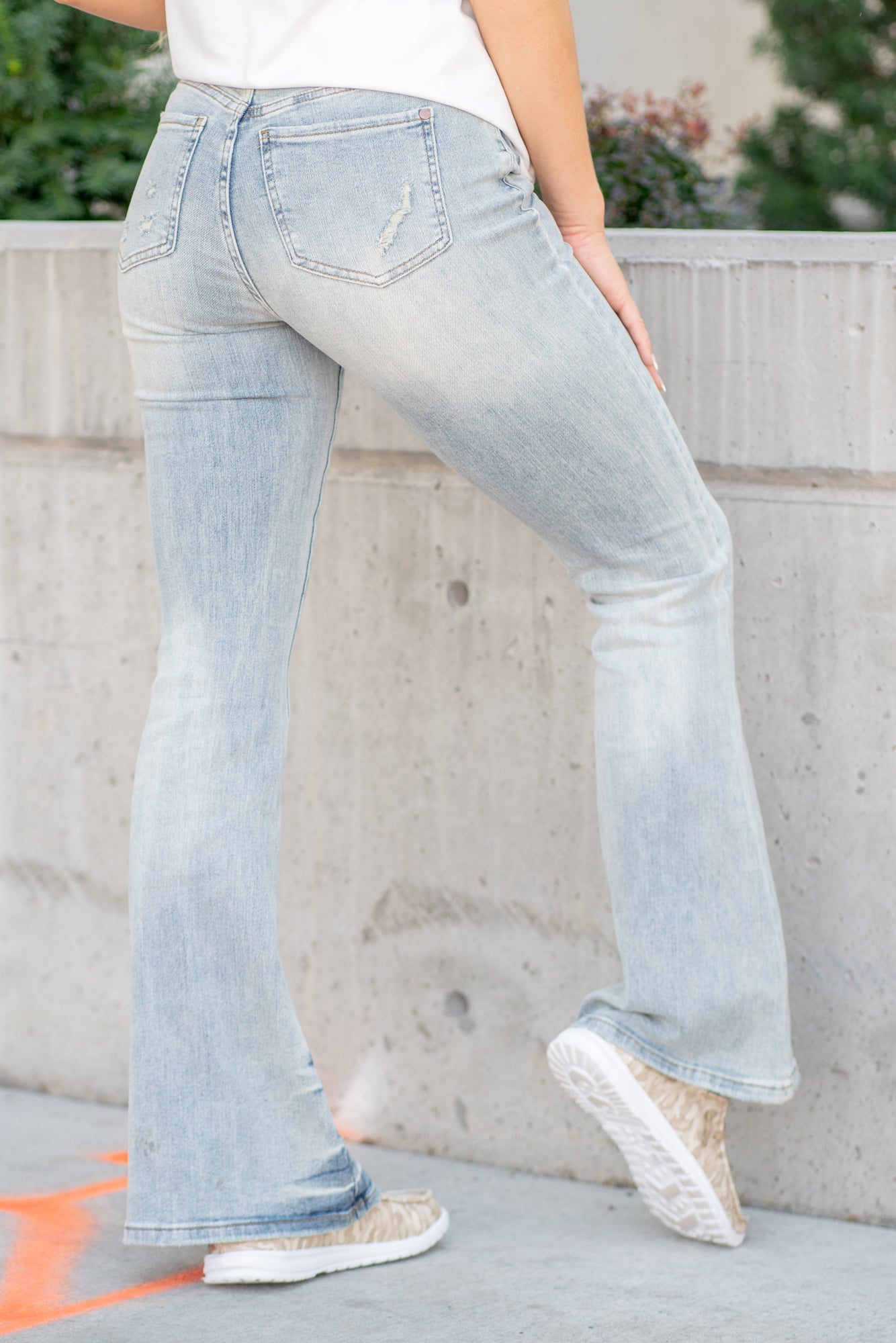 These mid-rise jeans hit the right spot on your waist! With a medium blue wash and pin tack legs, these will be your new go to flares.