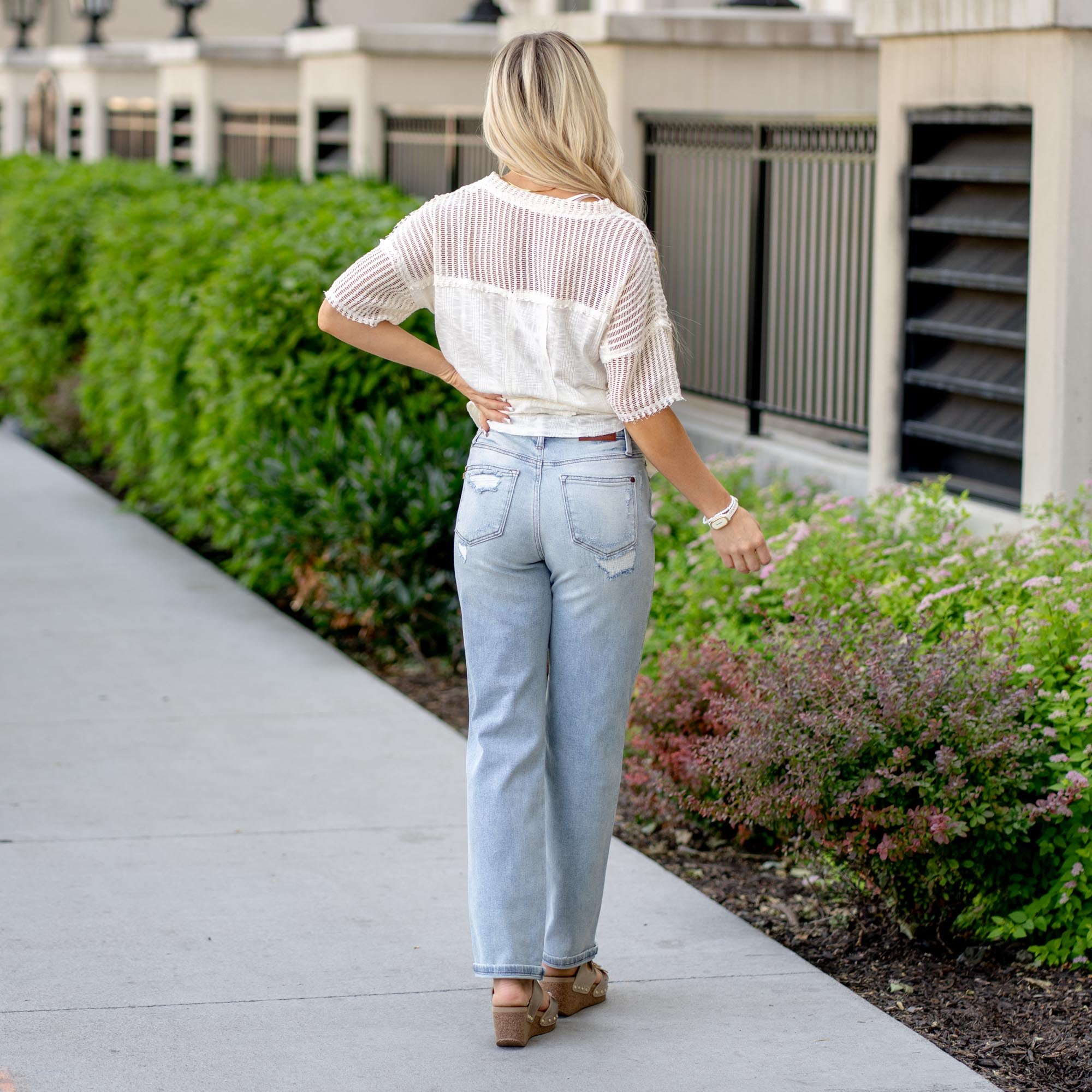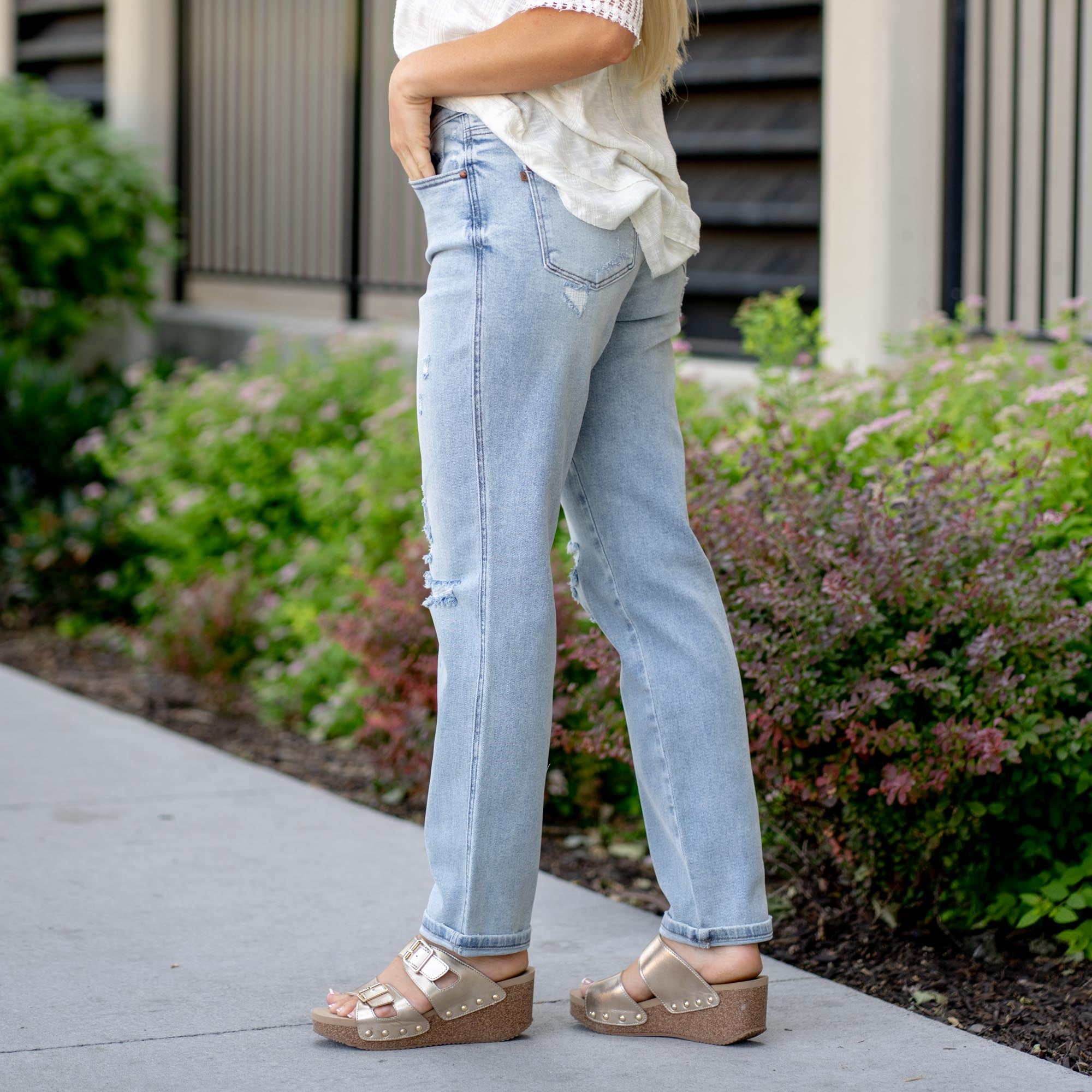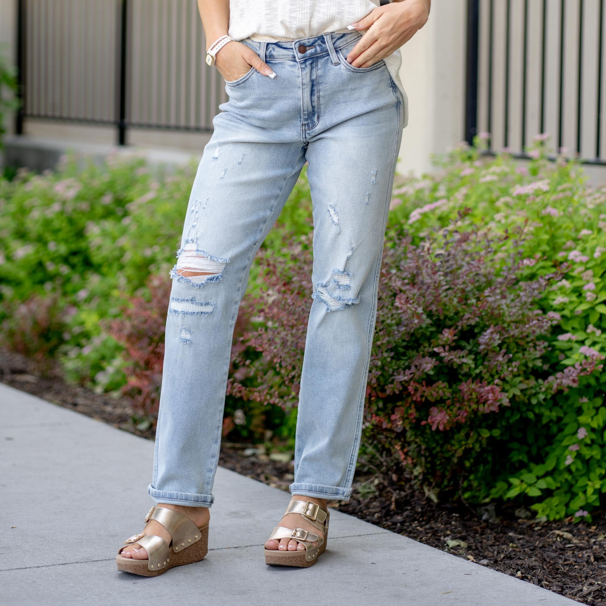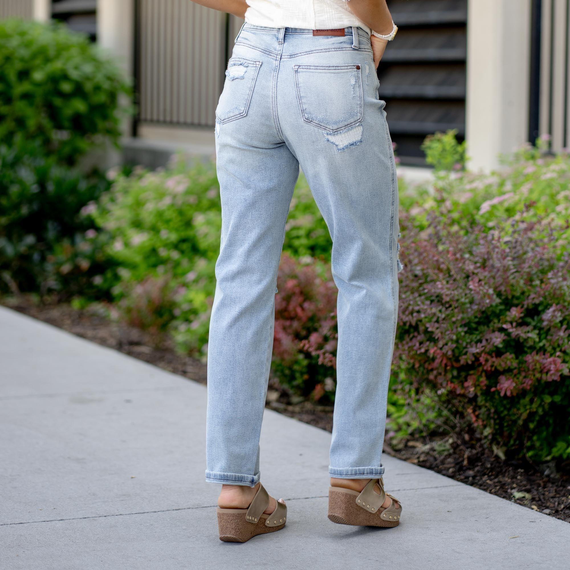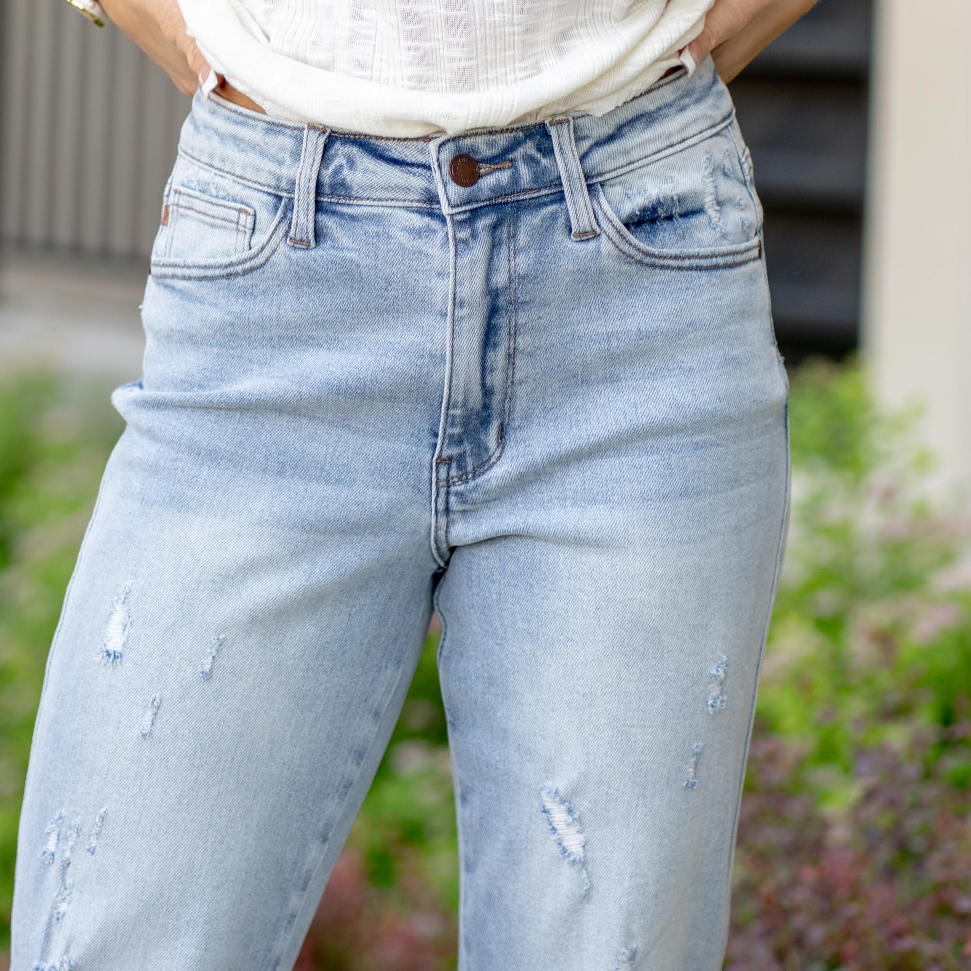 The Dawn Patrol Boyfriend delivers off-duty vibes with standout details. This light wash jean features mid-rise comfort, distressed destruction, and visible repair stitching for a cool, lived-in look. A single cuffed hem adds just the right amount of structure to this laid-back silhouette. Made from Judy Blue’s comfort stretch denim, these boyfriend-fit jeans are soft, relaxed, and ready to wear all season long. Finished with a classic five-pocket design, zip fly, and single-button closure.
