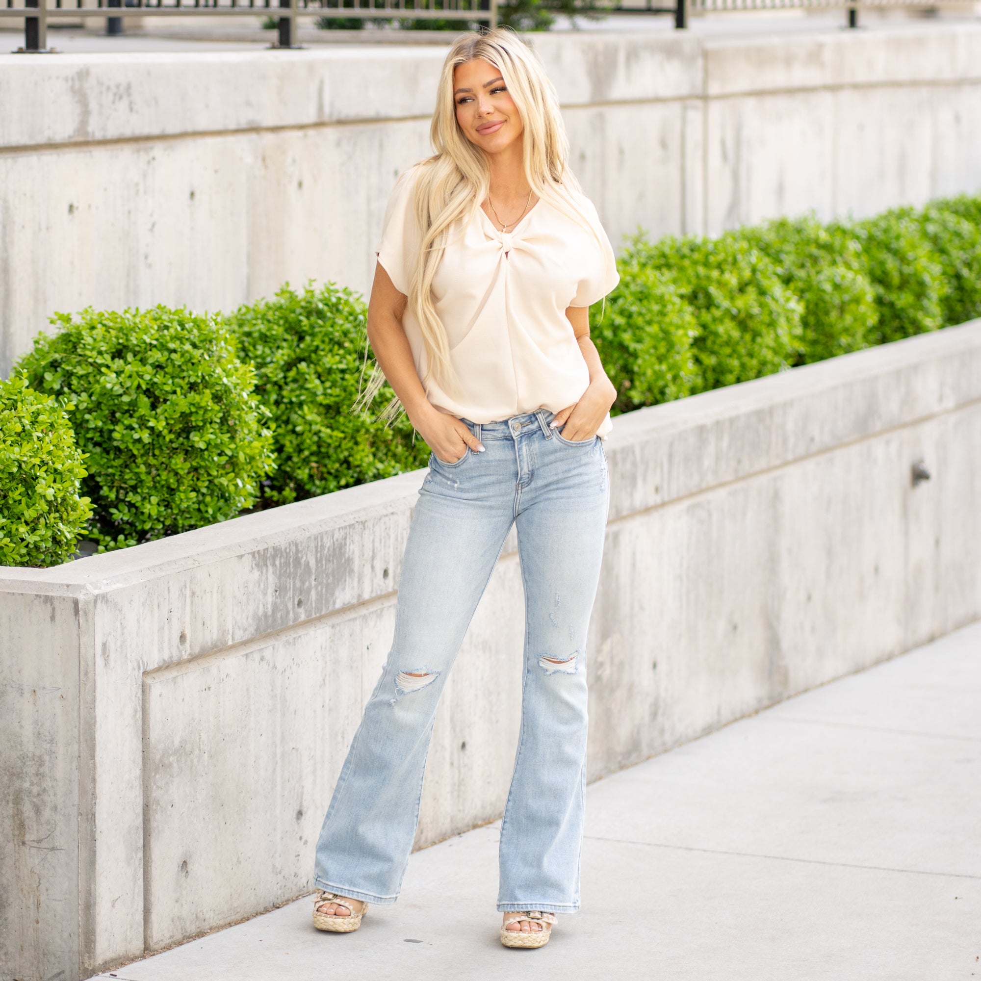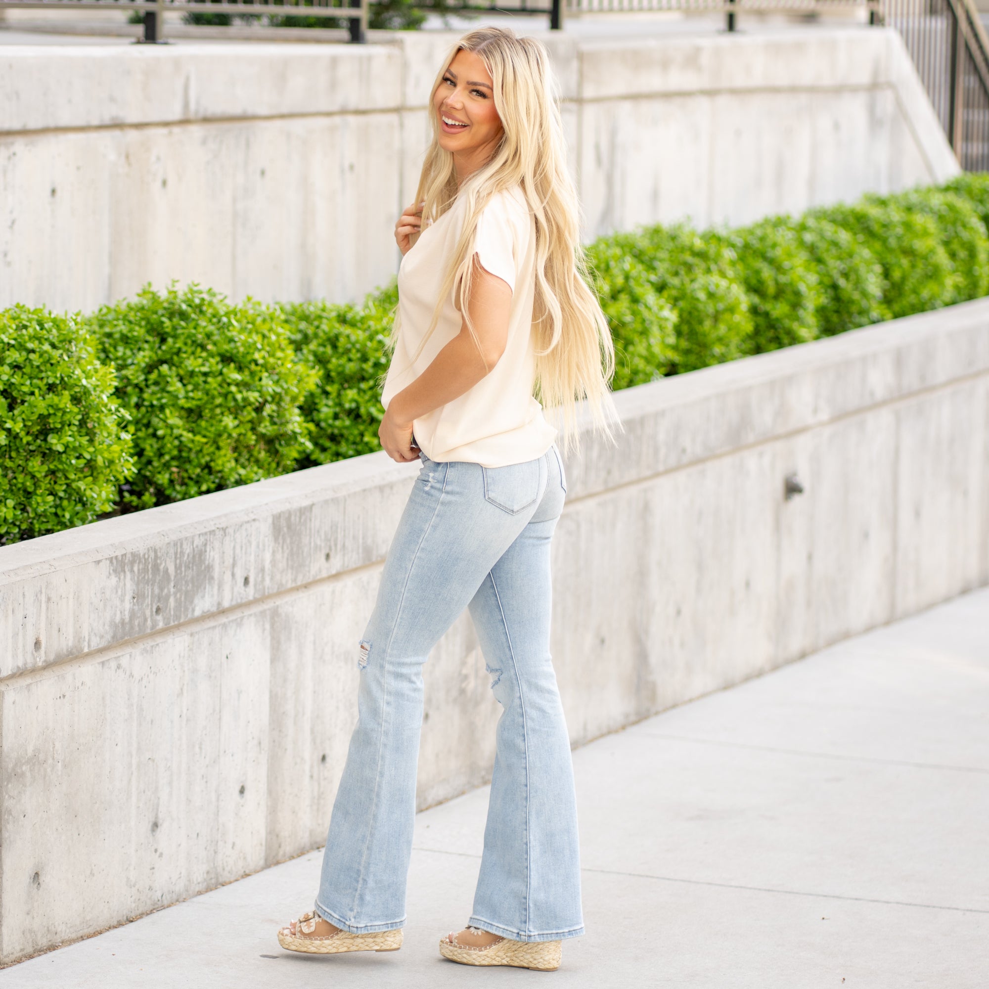 The Abigail Flare is the kind of denim that moves with you and turns heads while doing it. Designed to sit just above the natural waist, this style hugs through the hip and thigh before flowing into a flattering flare at the calf. Subtle distressing adds a touch of edge, while the buttery-soft stretch denim keeps things comfy and curve-loving all day long. Finished with a classic five-pocket design and single-button front for that effortlessly polished look.