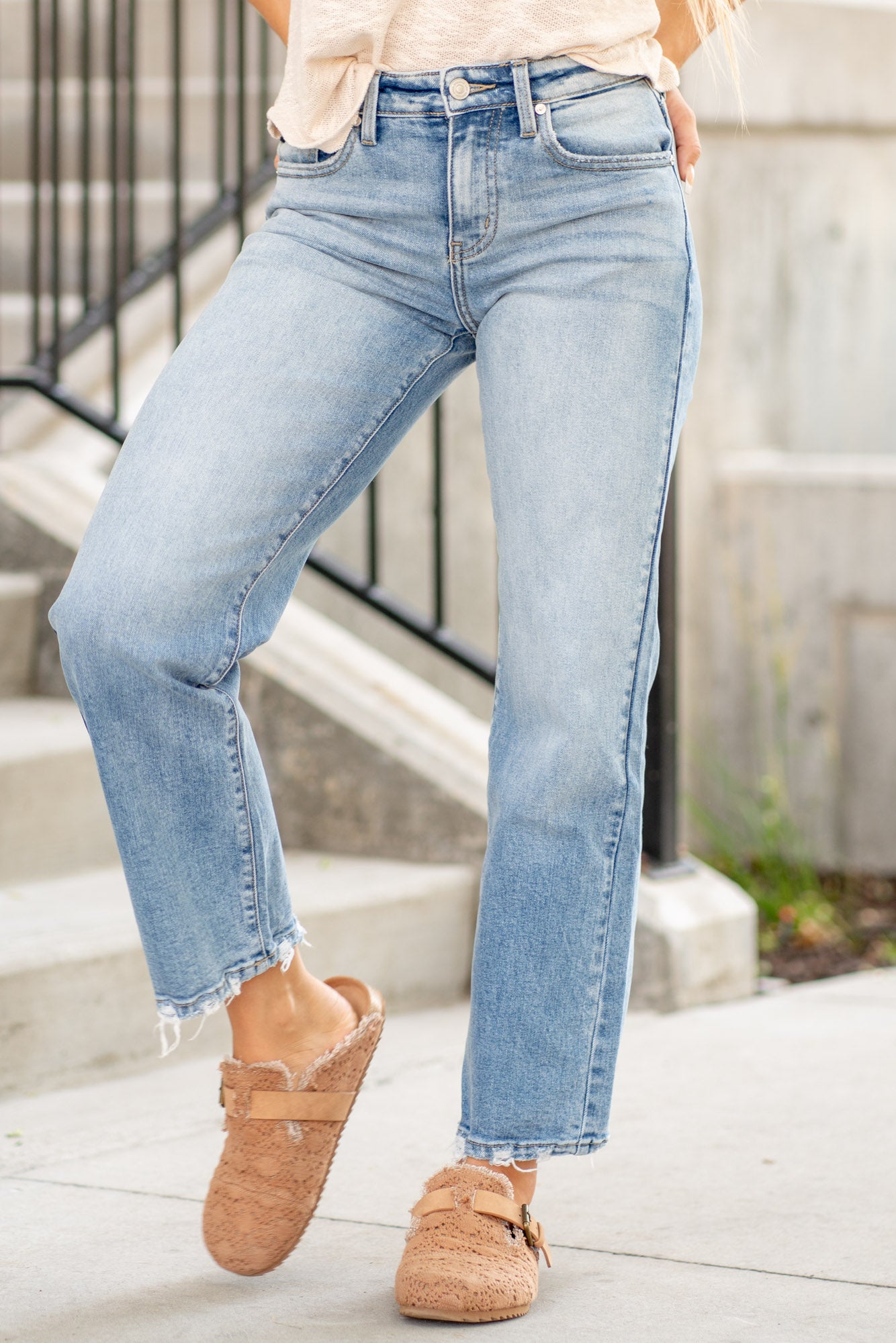 Experience the charm of yesteryear with our Melissa High Rise Slim Wide Leg Jeans, just in time for those glorious sunny days. Designed to flatter your figure in a stylish Medium Wash, these jeans boast light whiskering at the top and a chic, slightly distressed hem. With a classic 5-pocket style and a smooth zipper fly, you'll be ready to step out in timeless elegance.