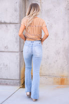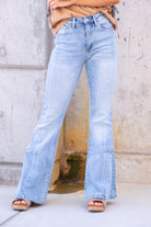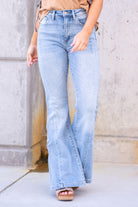 These high-rise super flare jeans feature a light stone wash for a vintage look. The flare denim jean with stretch offers a comfortable fit that flares out from the knee, creating a dramatic silhouette. The five-pocket style and seam detail front add a classic touch, while the zip fly offers easy on-and-off. These non-distressed jeans are a versatile addition to any wardrobe and can be dressed up or down for any occasion.