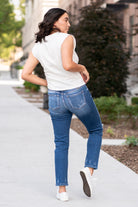 These high-rise slim straight jeans hit at exactly the right spot on your waist and with some spandex, these will stretch as you wear and get super comfy!