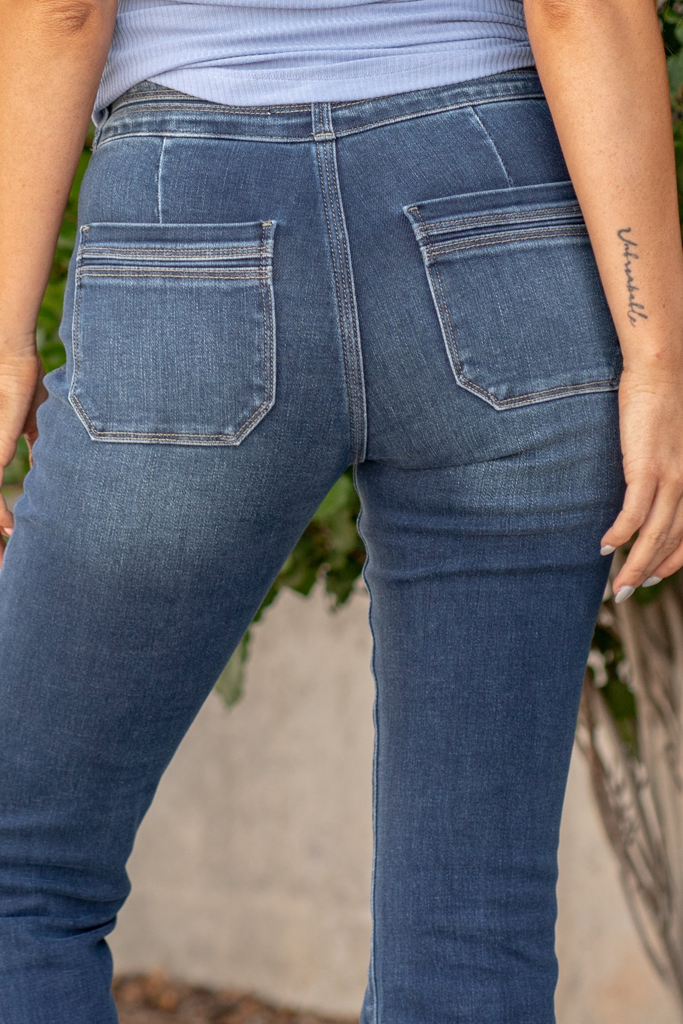 Elevate your denim collection with our High Rise Welt Pocket Flare Jeans in a sophisticated Dark Stone Wash. Crafted with stretch for all-day comfort, these jeans feature a unique double waistband design that offers both style and a secure fit. The distinct welt pocket style adds a touch of modern flair, while the zipper fly ensures easy wear. Embrace a timeless yet contemporary look with these versatile and flattering flare jeans.